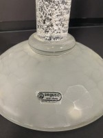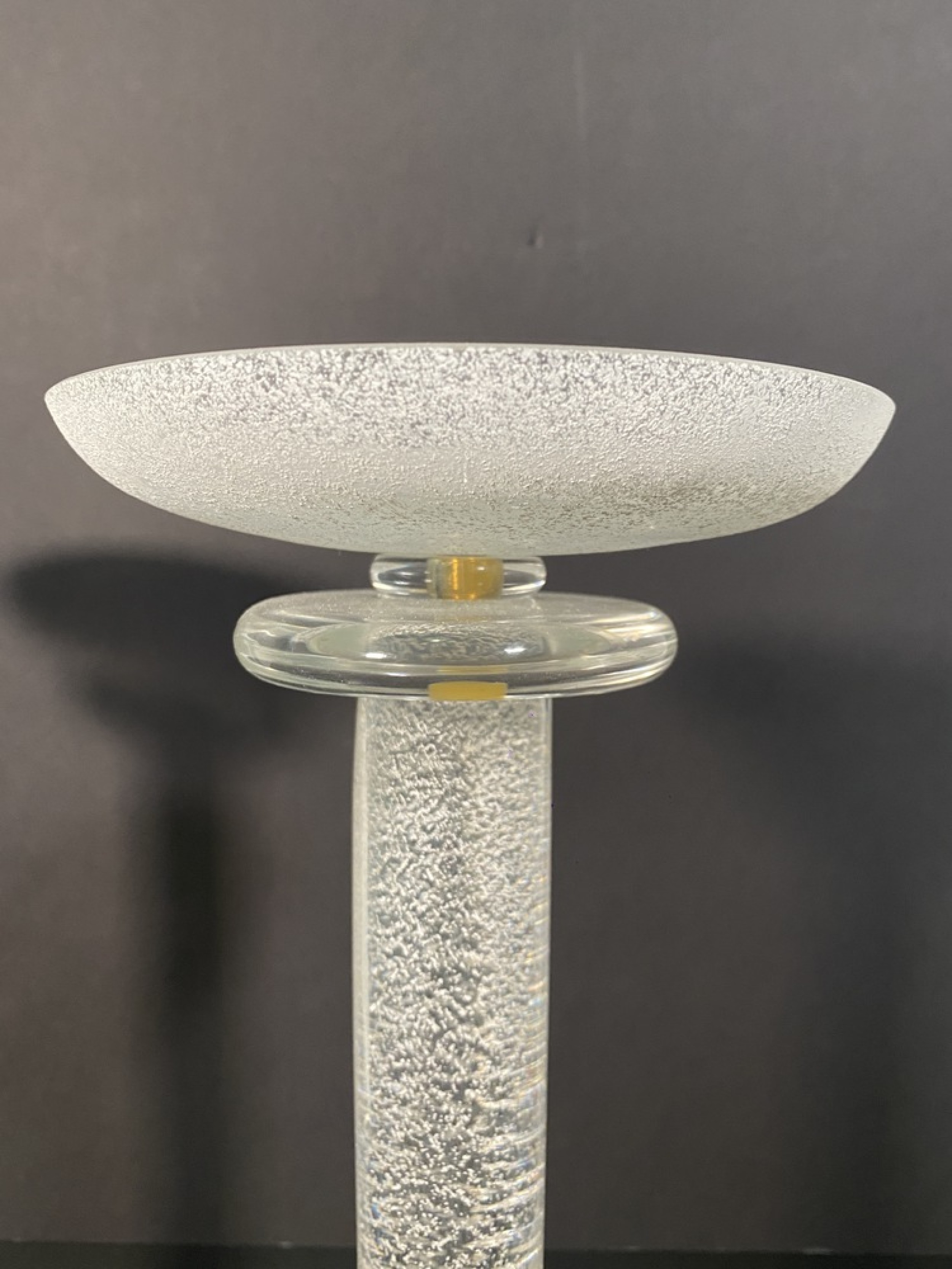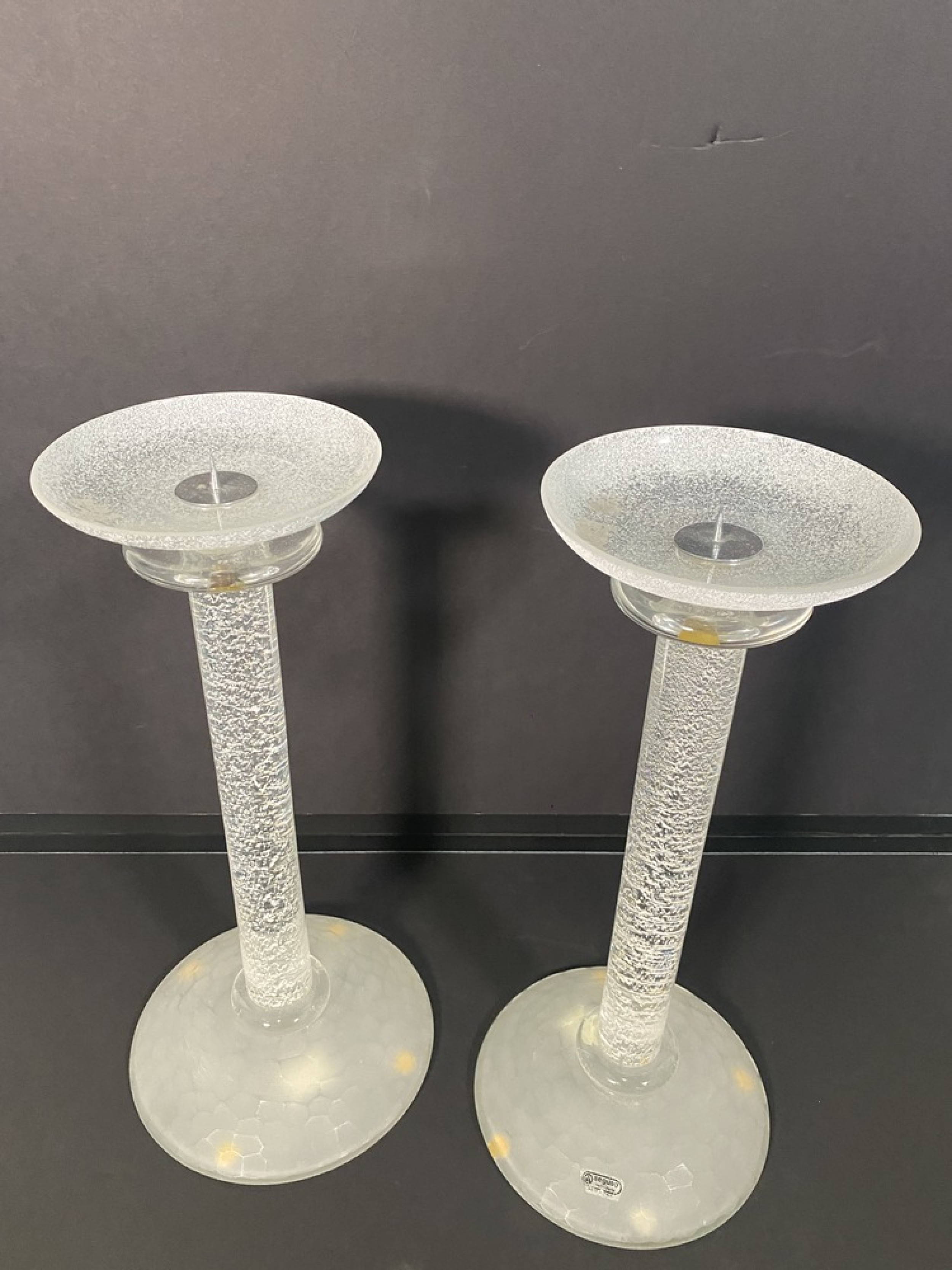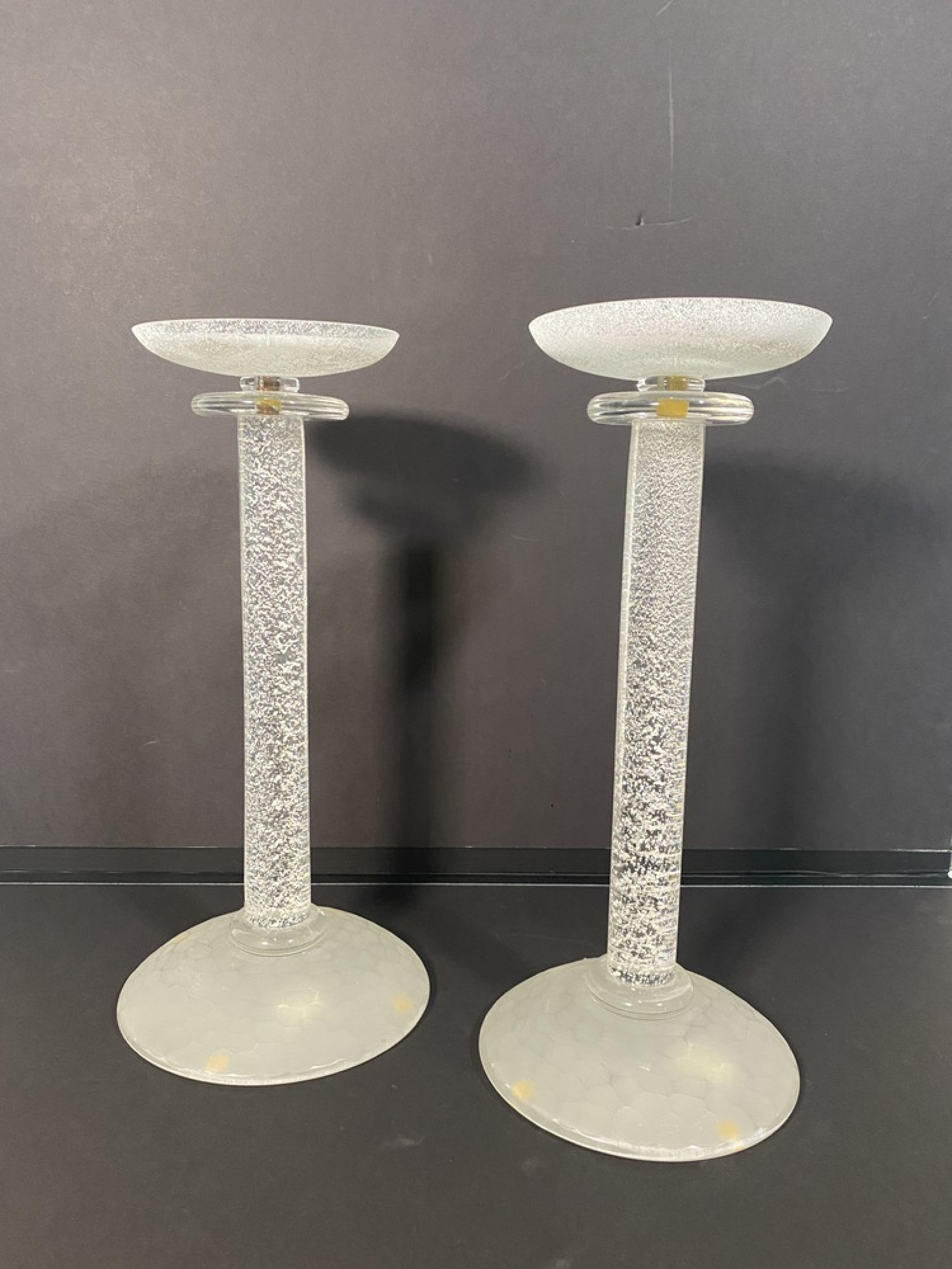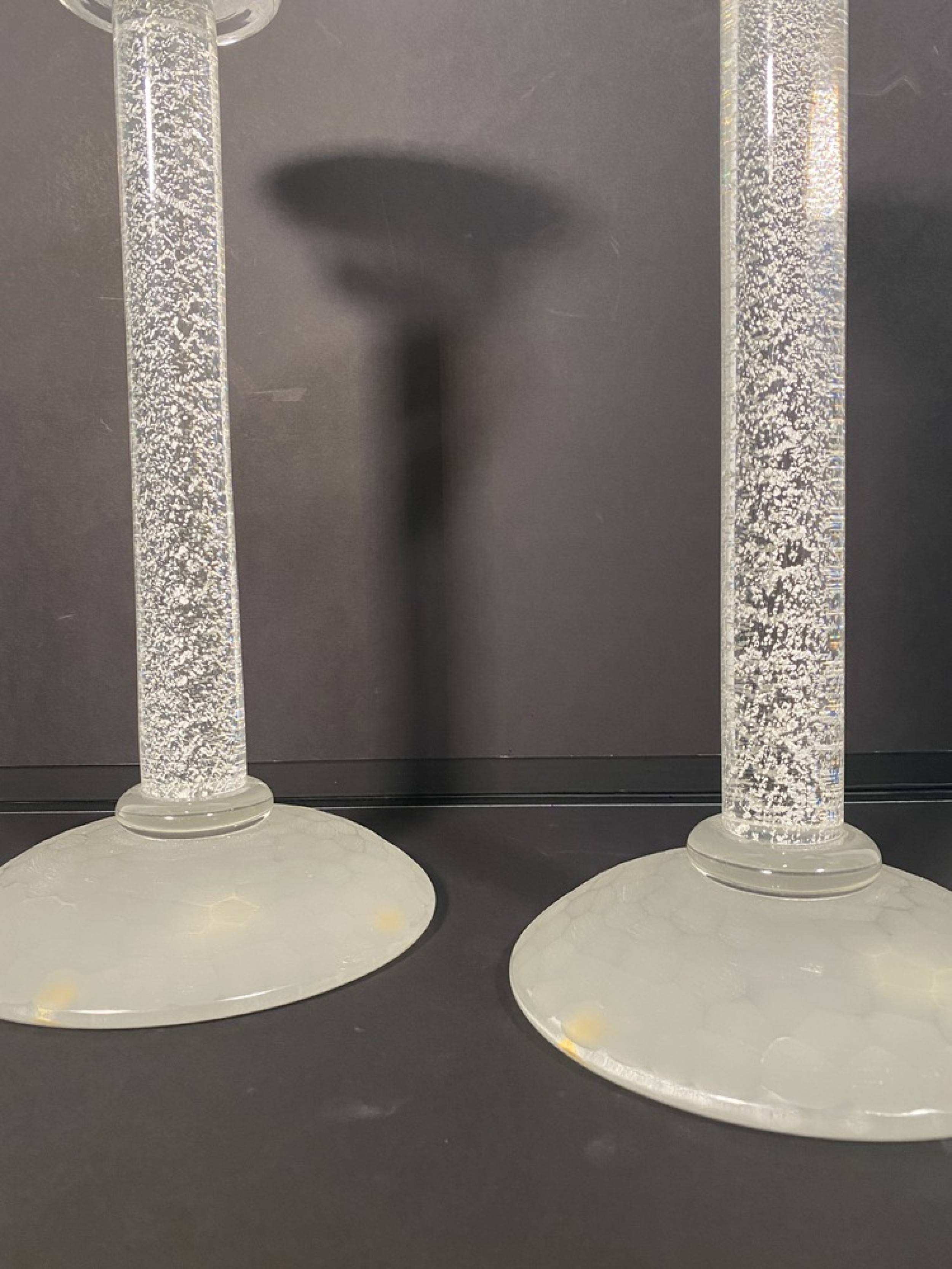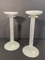 PAIR of Karl Springer Mid-Century Clear Scavo Glass Column Candlesticks with a frosted base (SEGUSO)