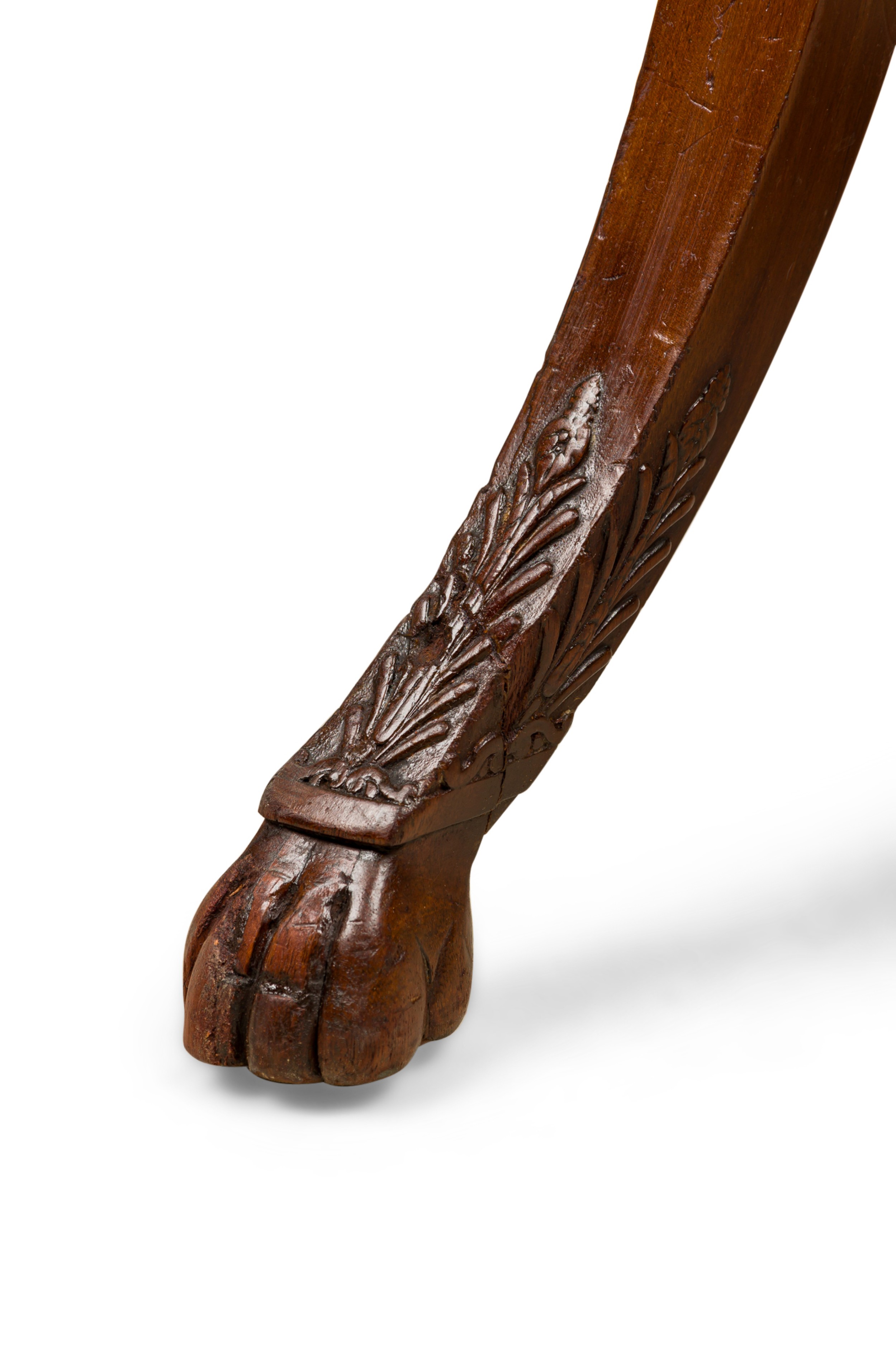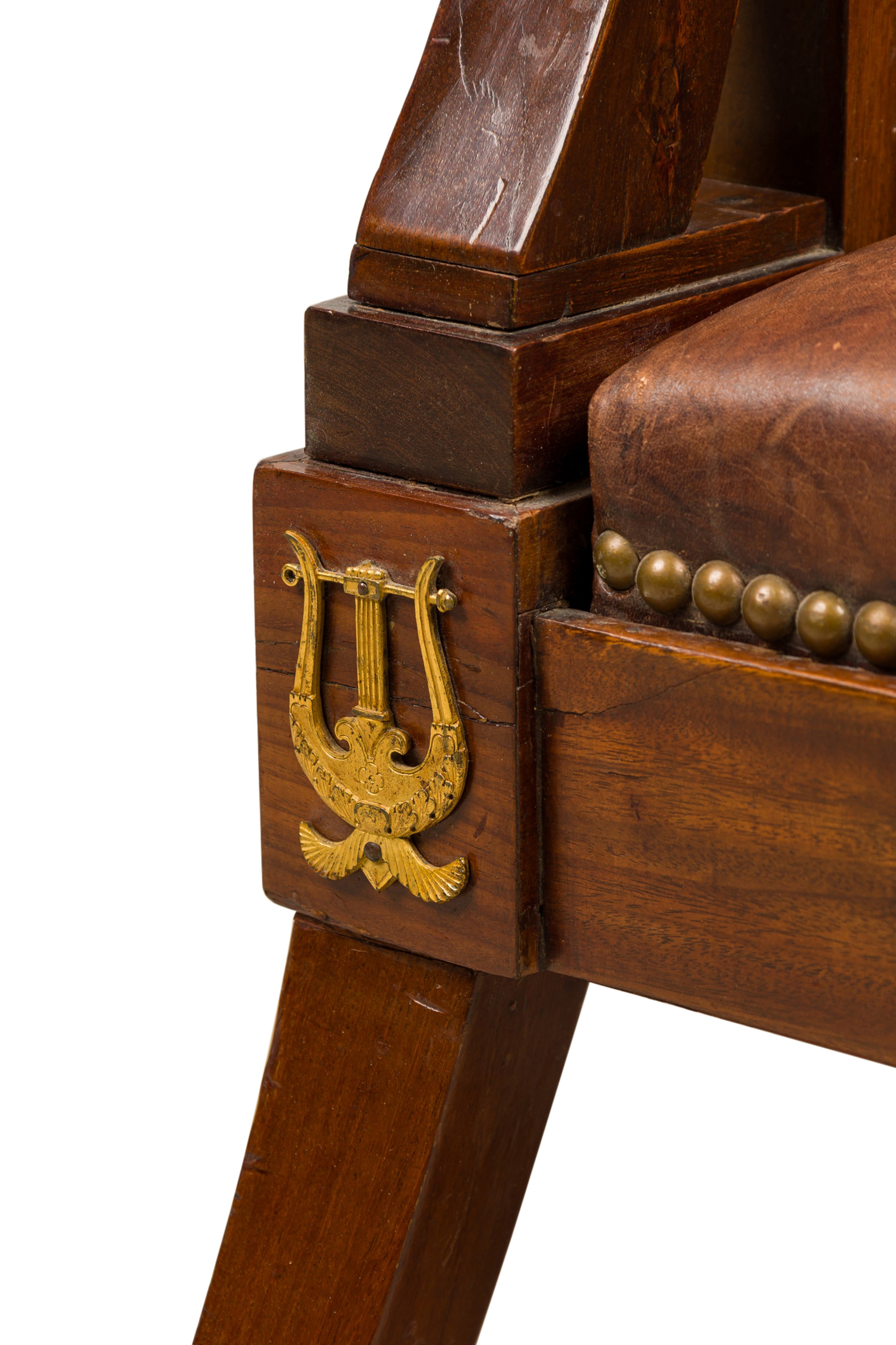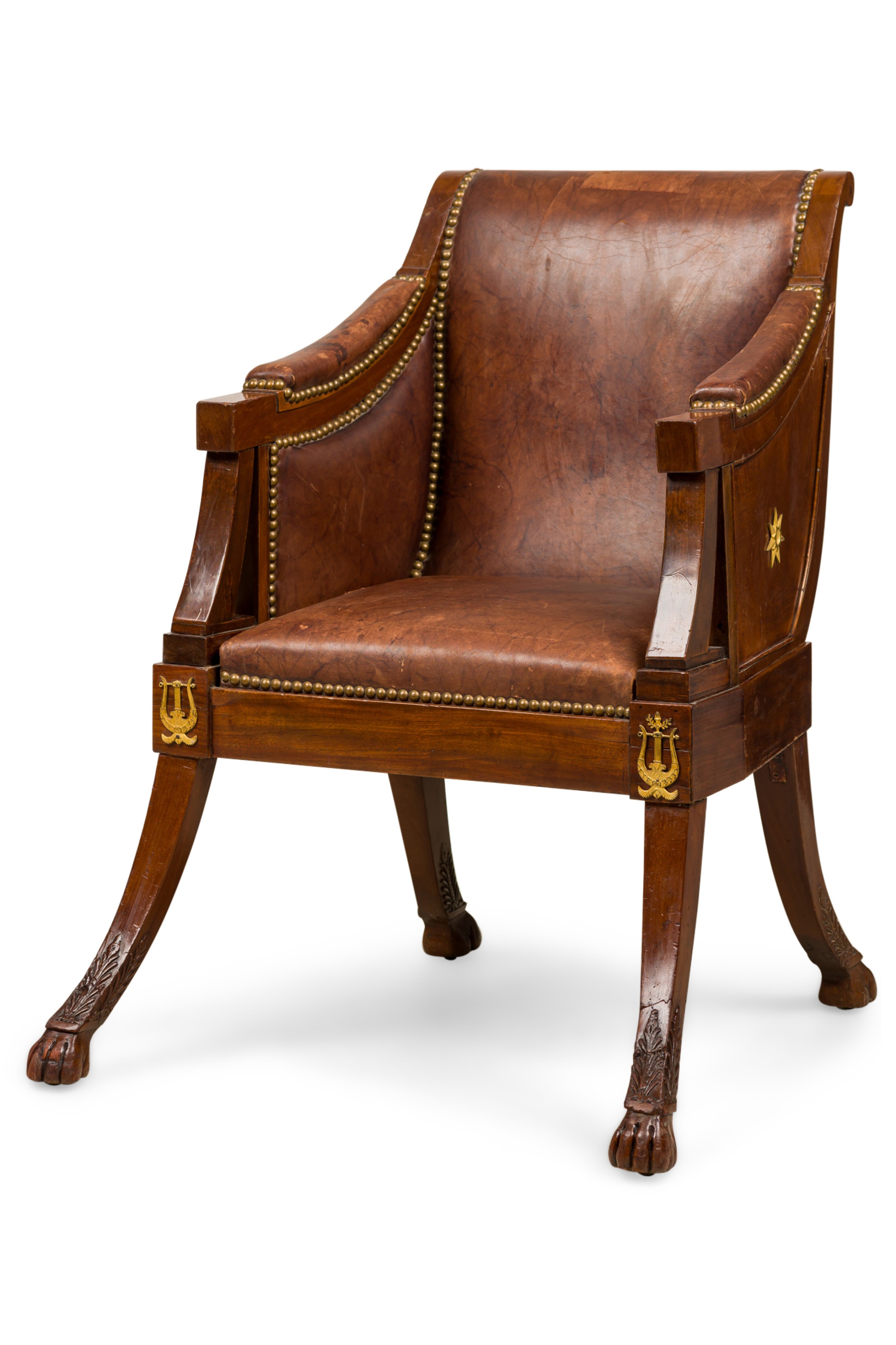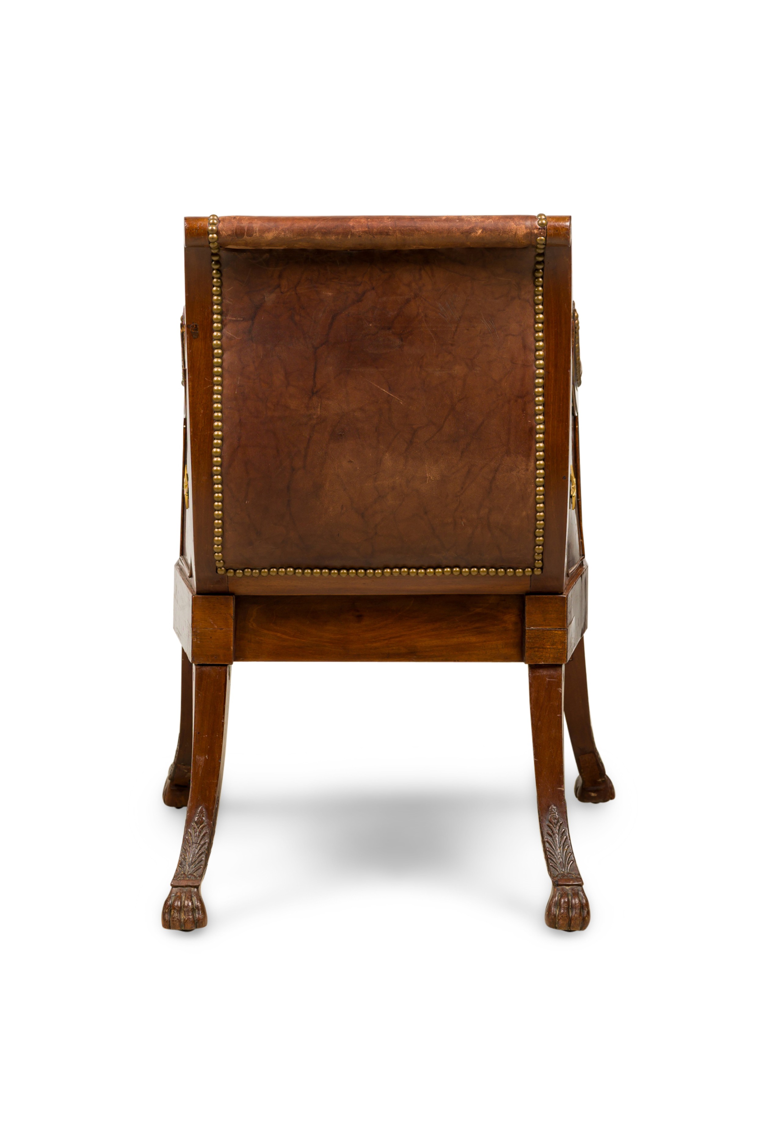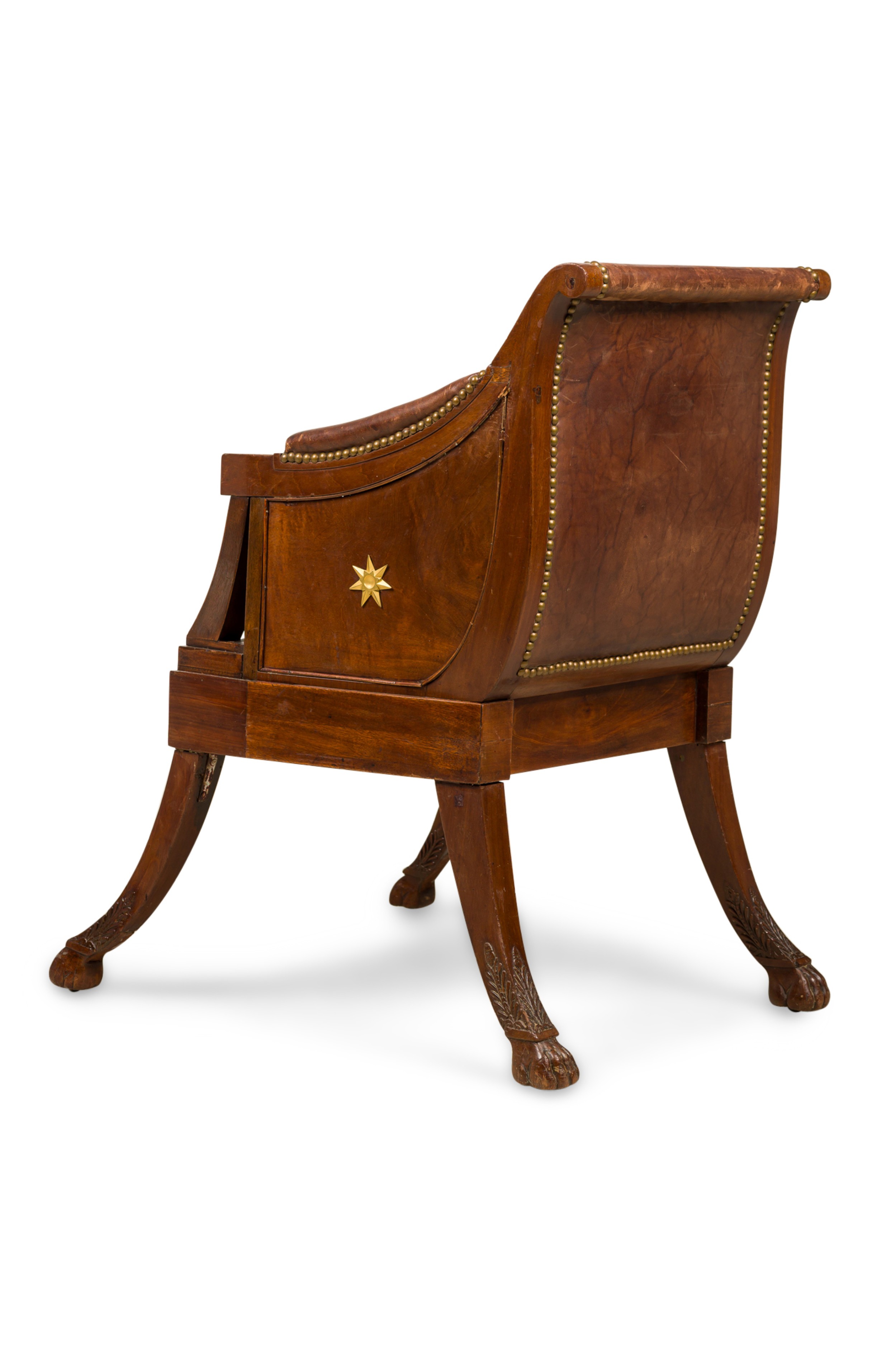 French Consulat / Empire Mahogany and Bronze Mounted Armchair having a splayed leg design ending with claw feet and upholstered in brown leather