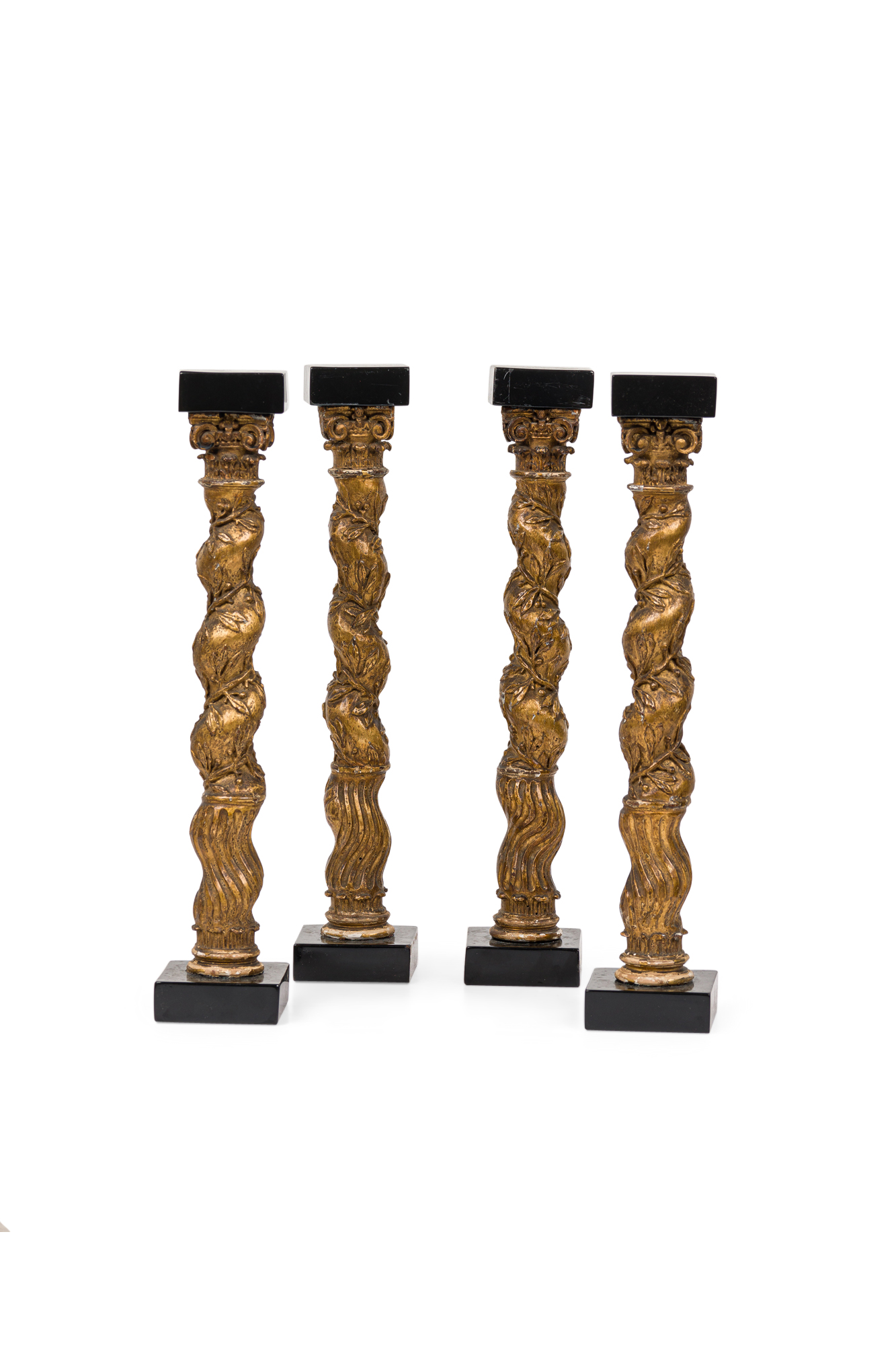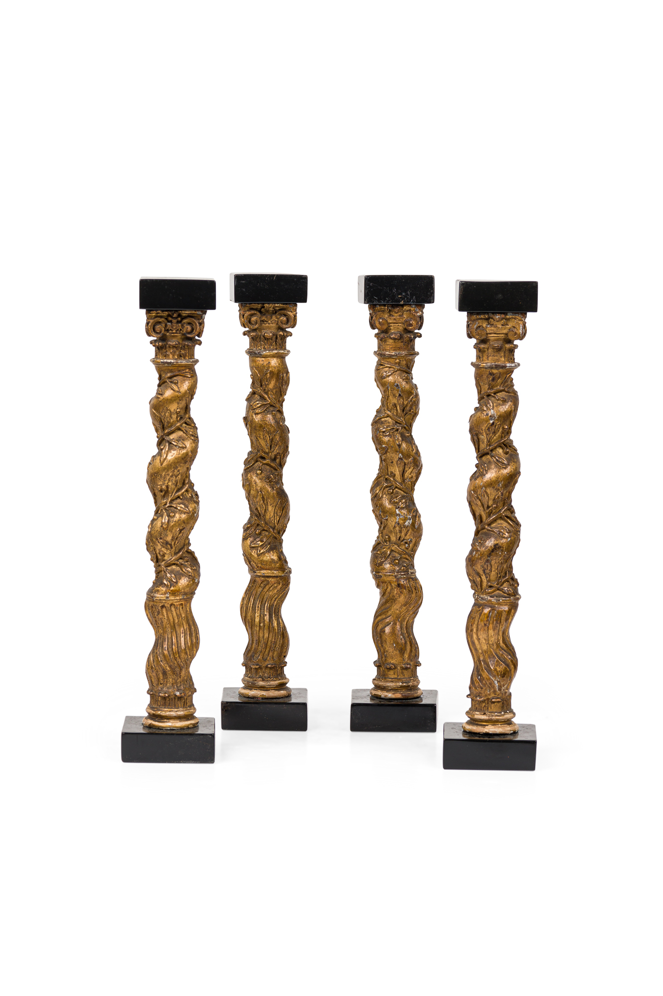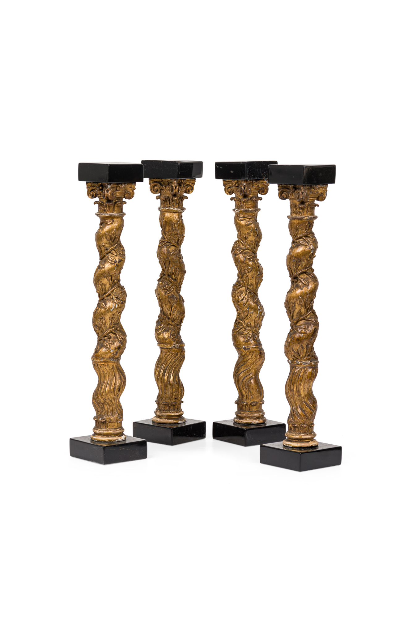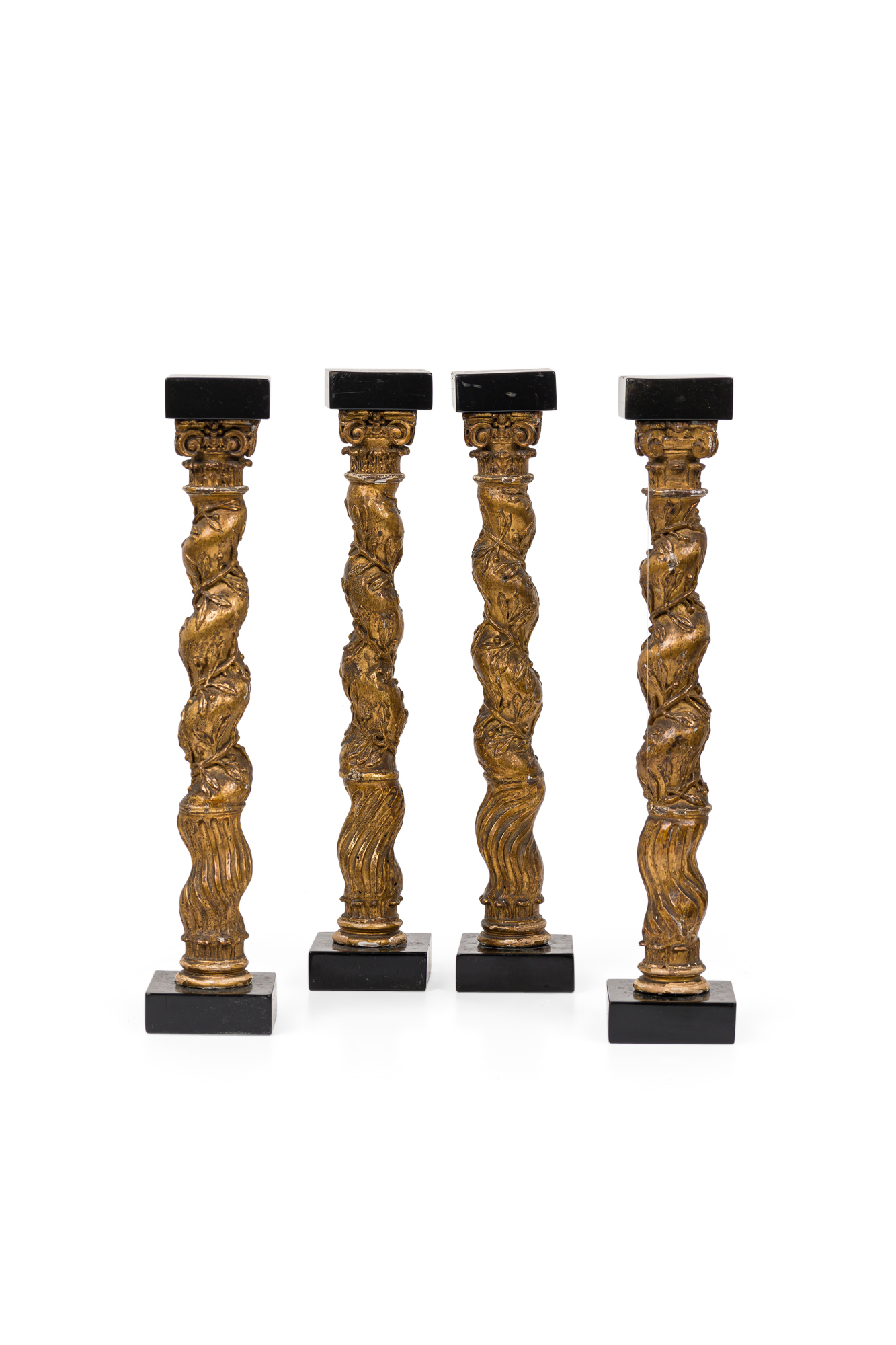 SET of Four miniature models of gilt Italian Baroque Solomonic Columns with swirl design having a black base and tops (Mid-18th Century) (PRICED AS SET).