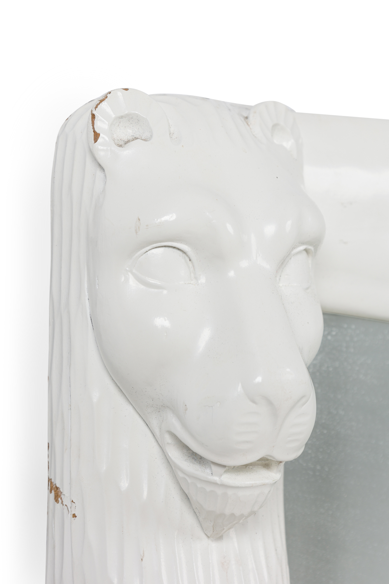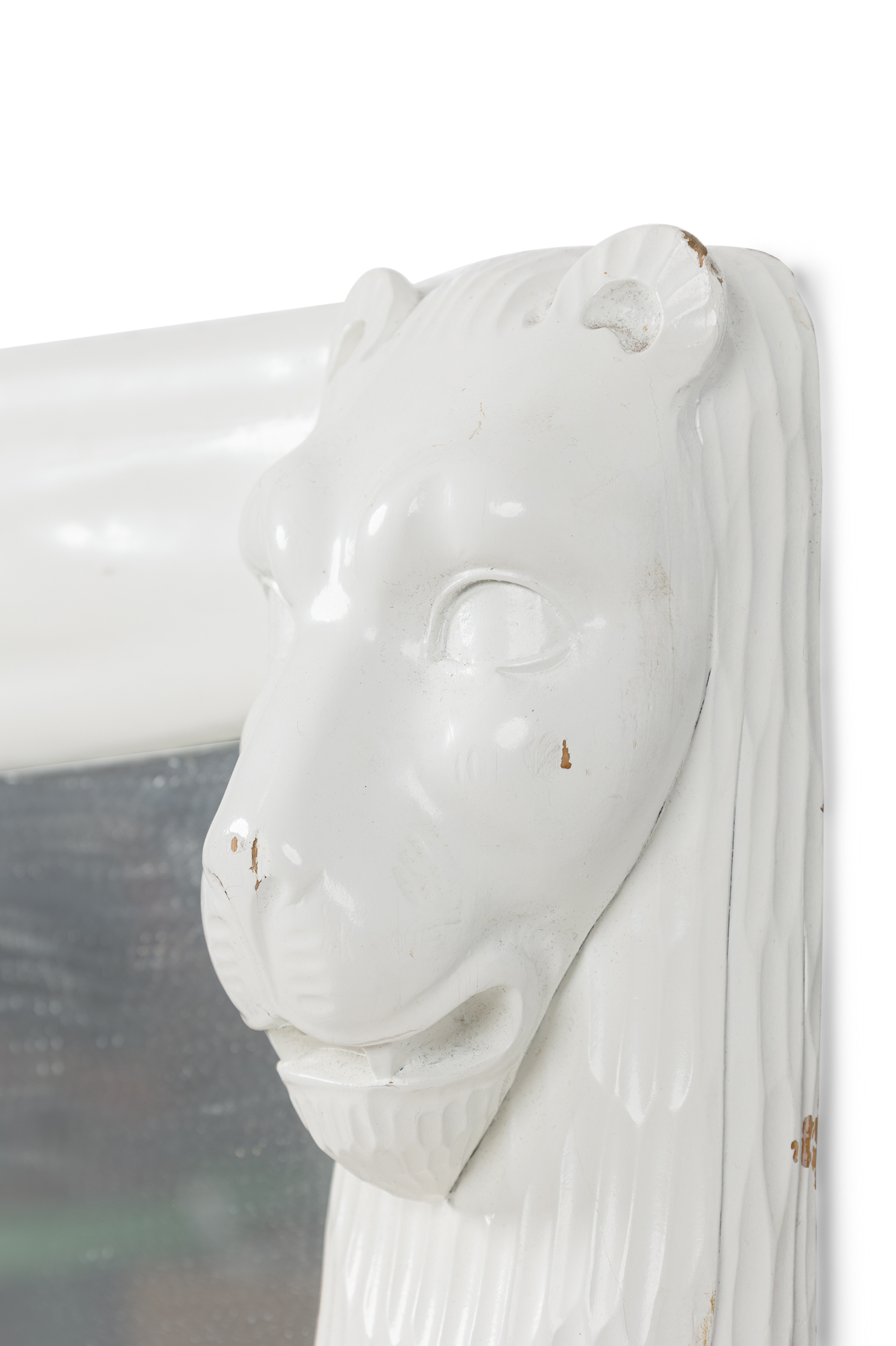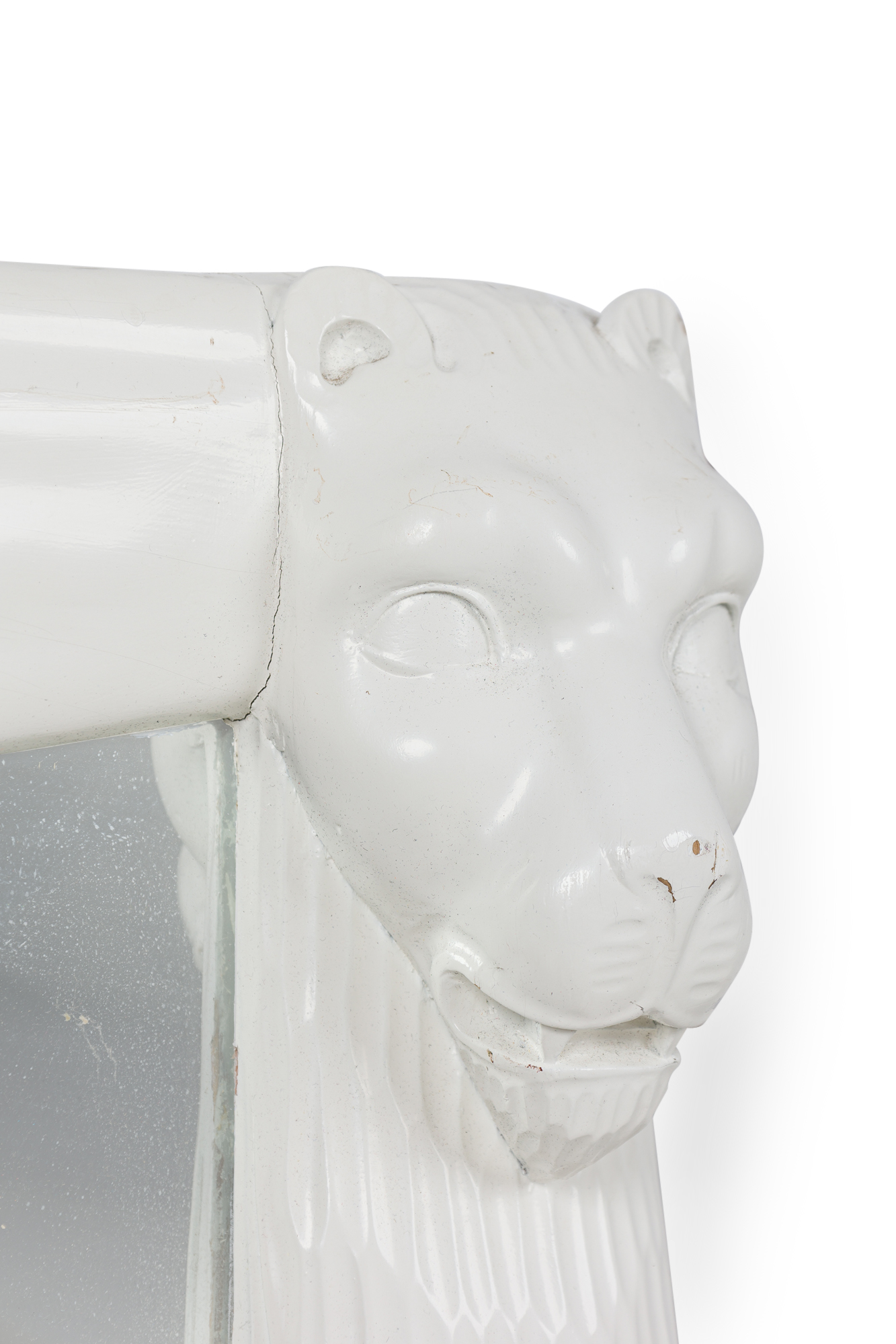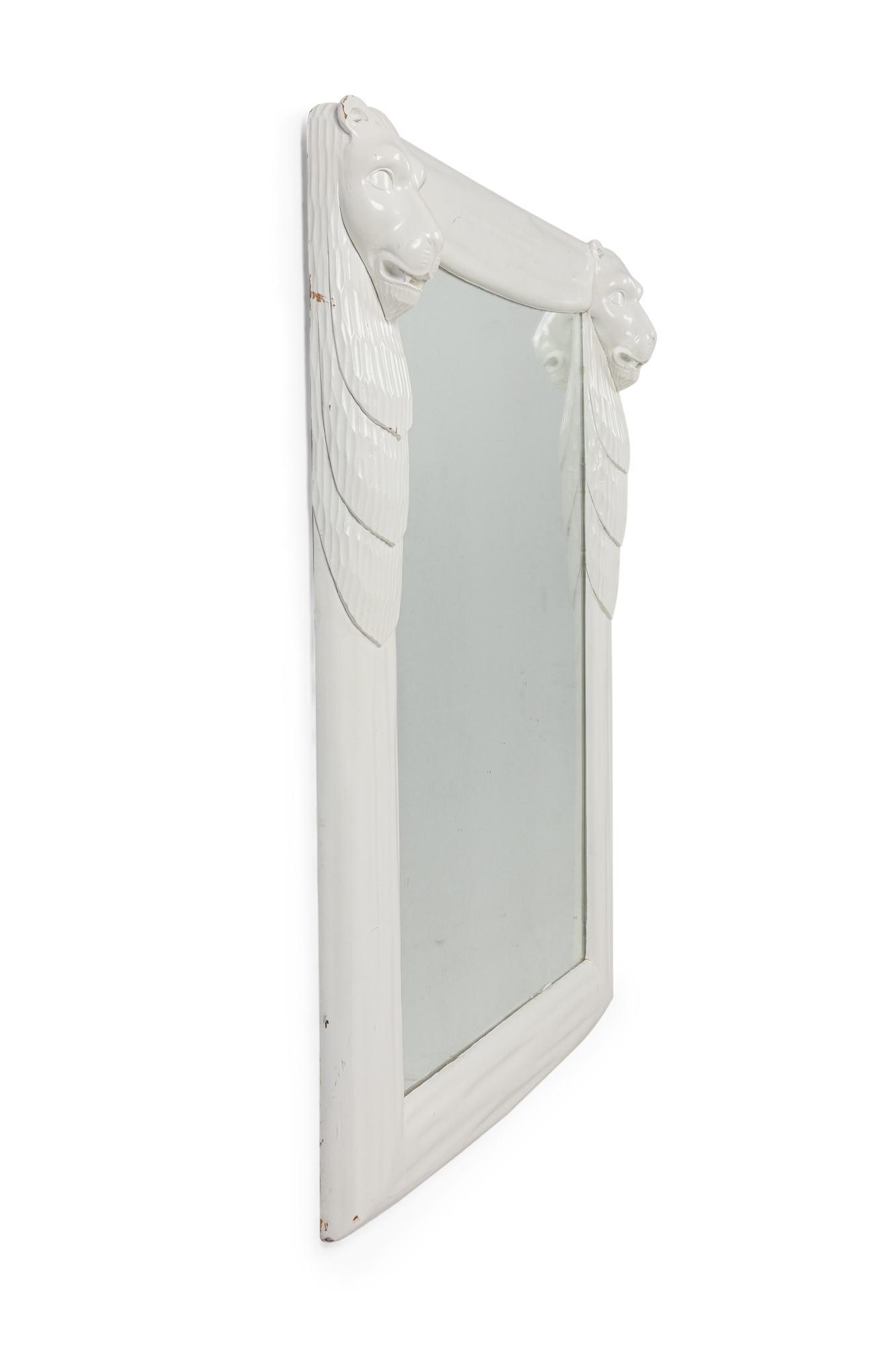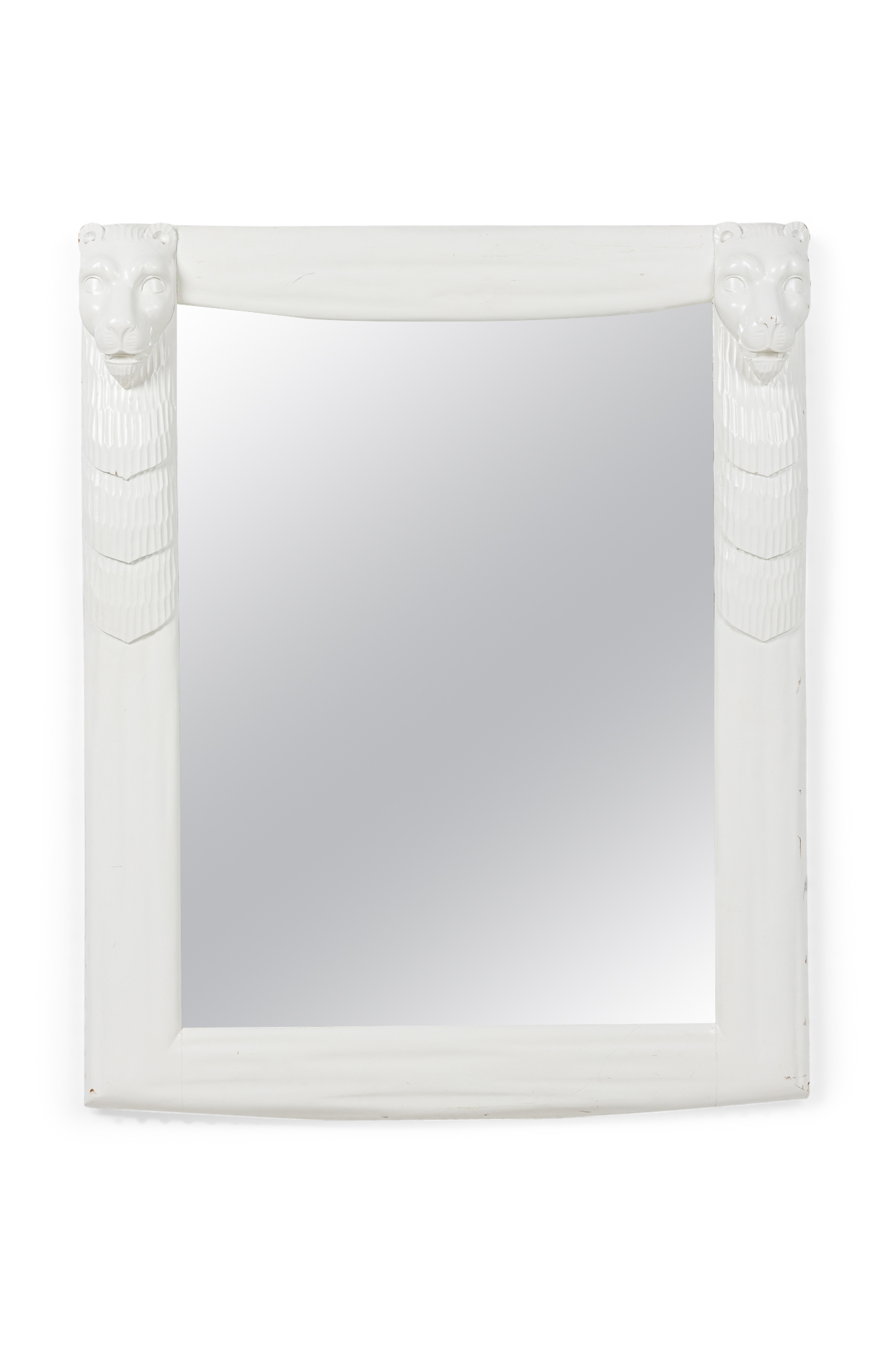 American Mid-Century White Lacquer vertical rectangular Mirror with lion head masks on the upper corners (style of JOHN DICKINSON).