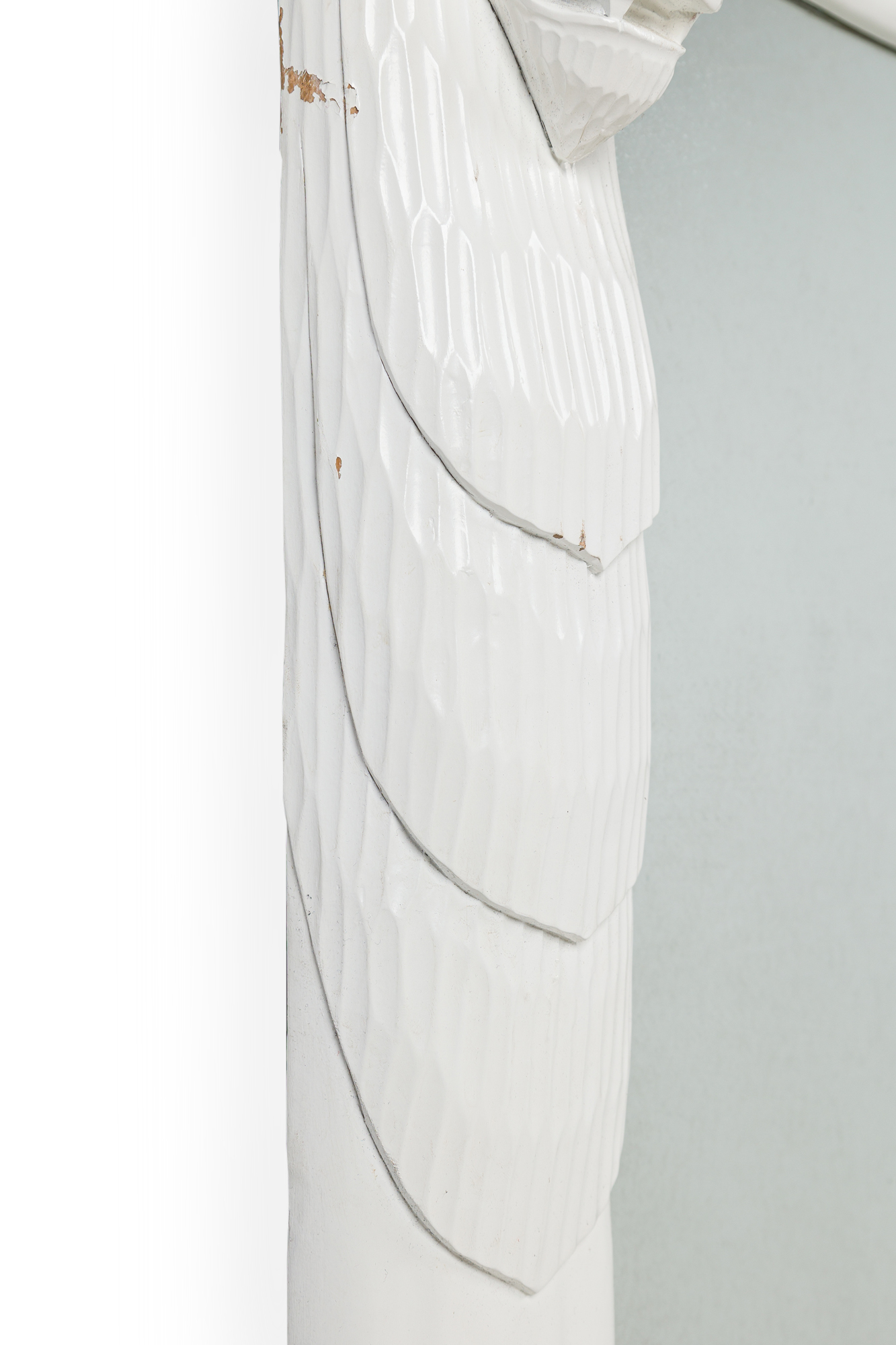 American Mid-Century White Lacquer vertical rectangular Mirror with lion head masks on the upper corners (style of JOHN DICKINSON)