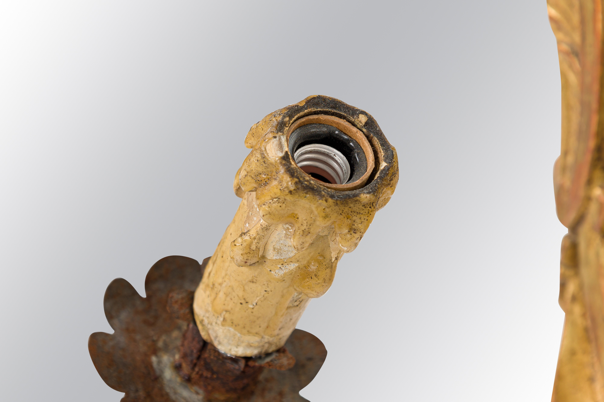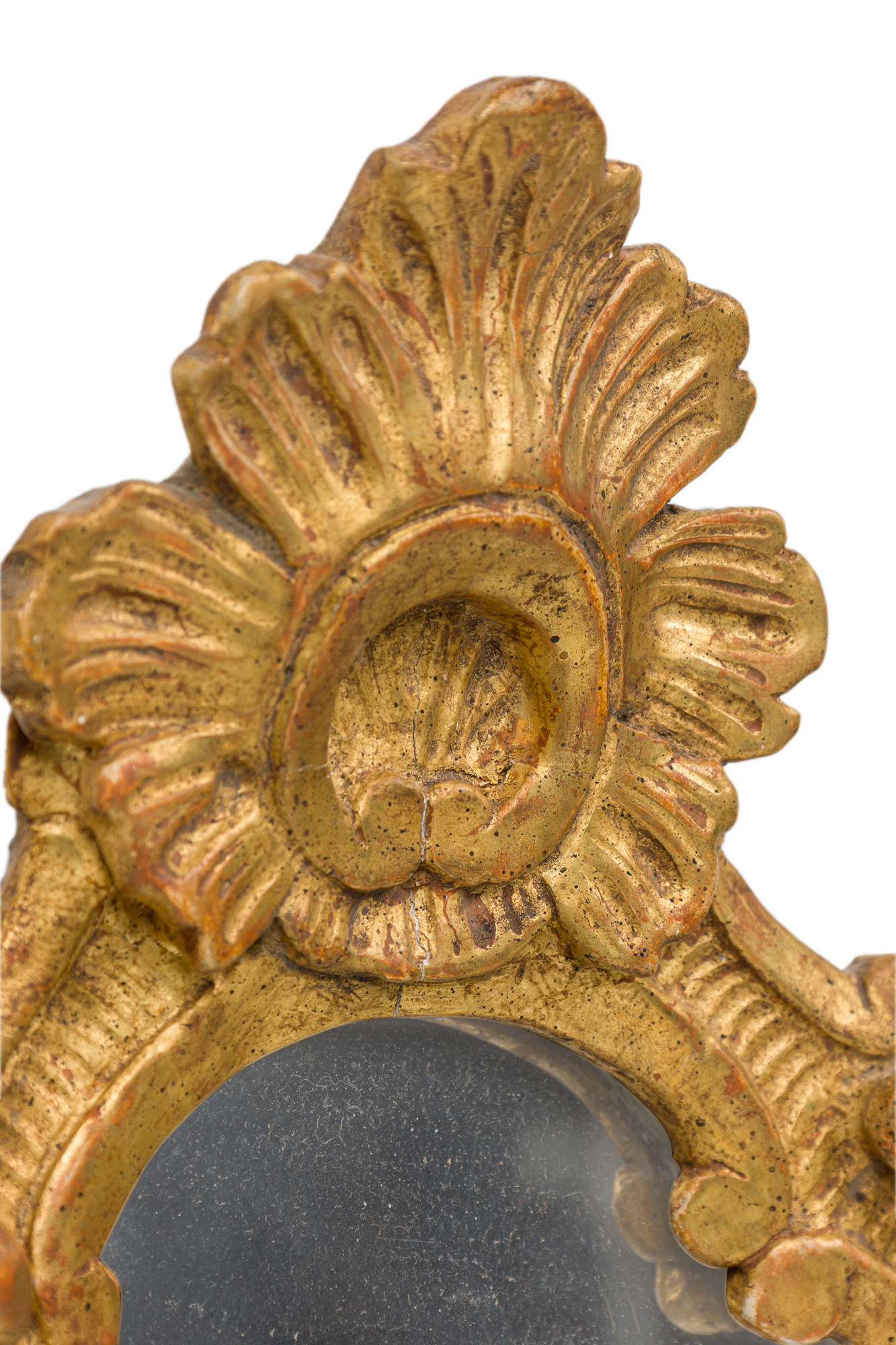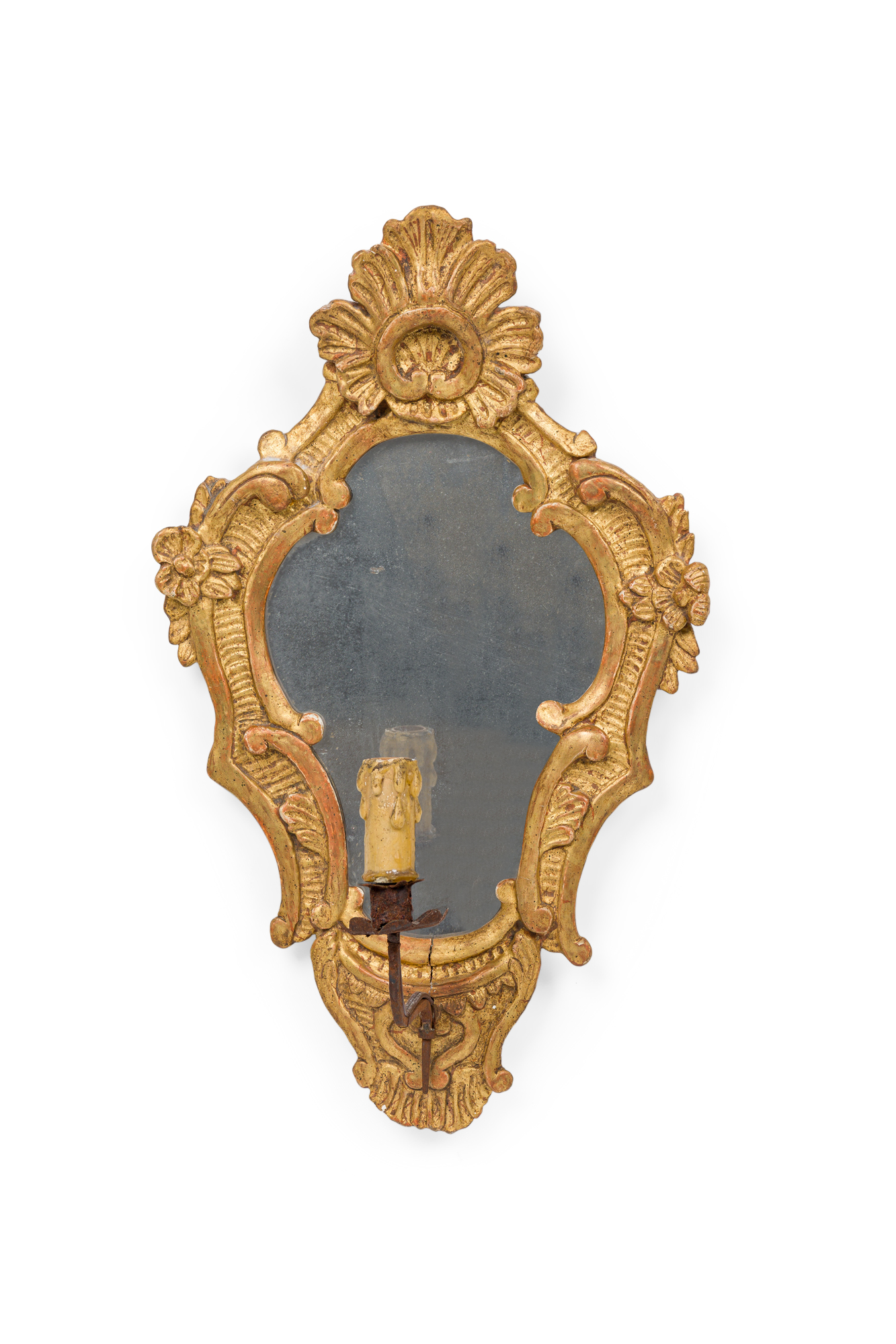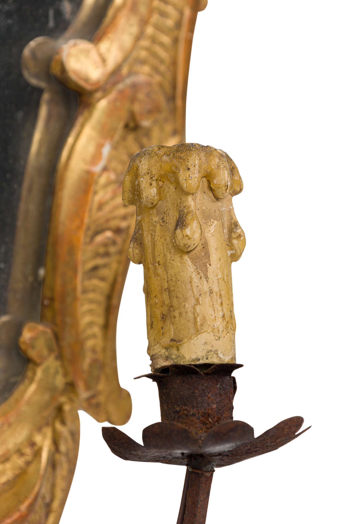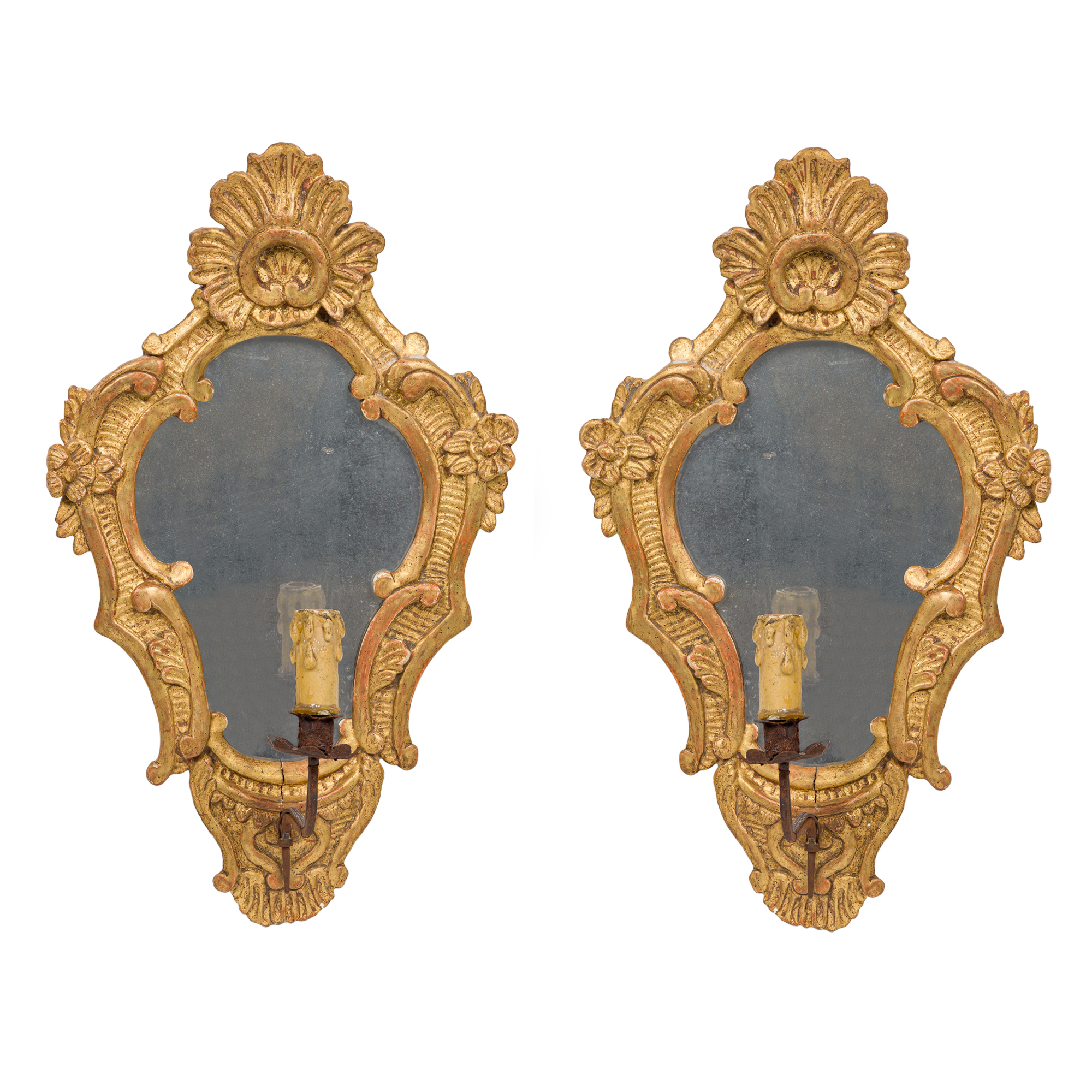 PAIR of Italian Rococo (possibly Venetian,18th Century) giltwood girandoles with carved frames surrounding a shaped mirror with a single wrought iron arm light fixture (PRICED AS PAIR).