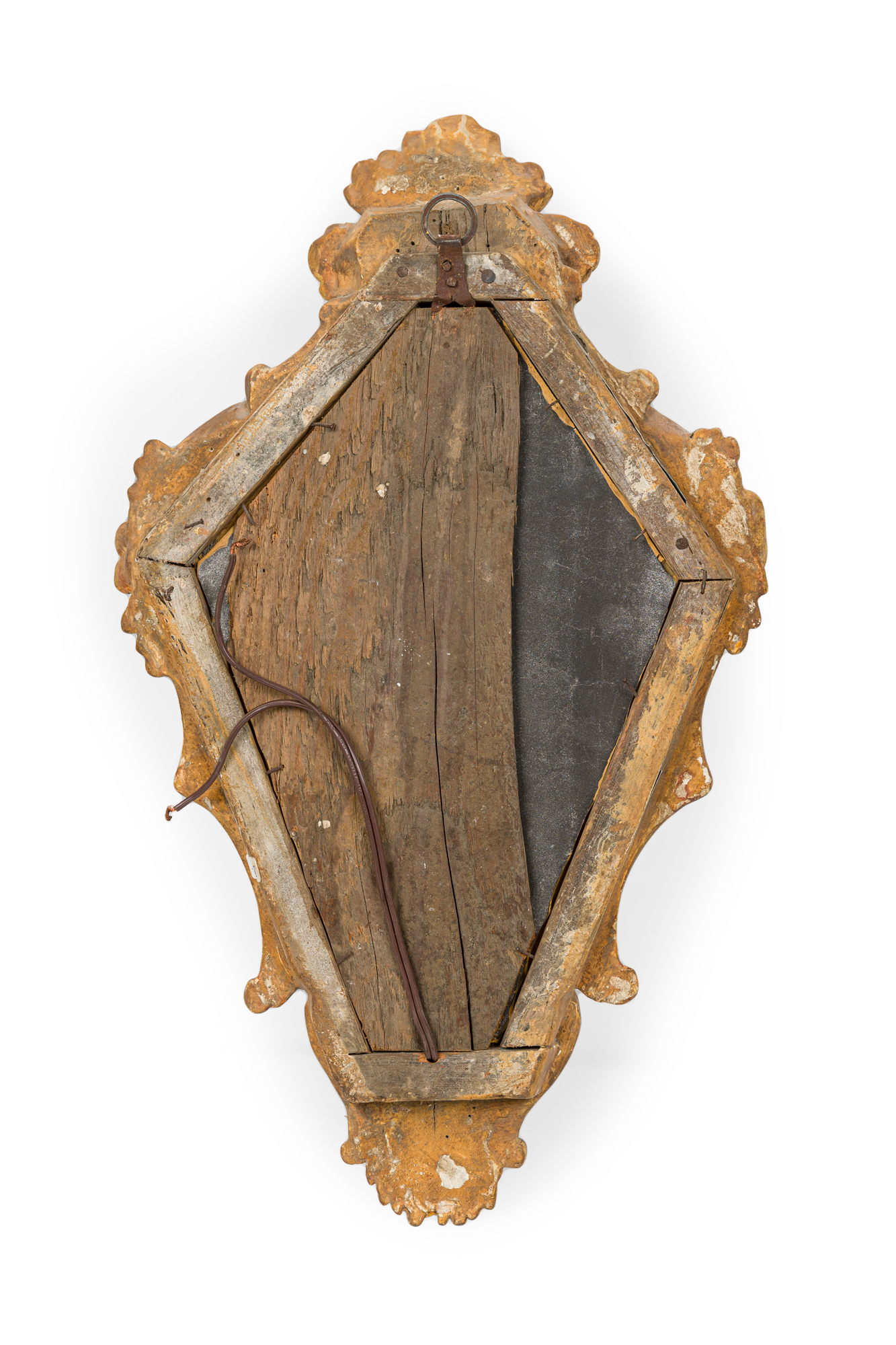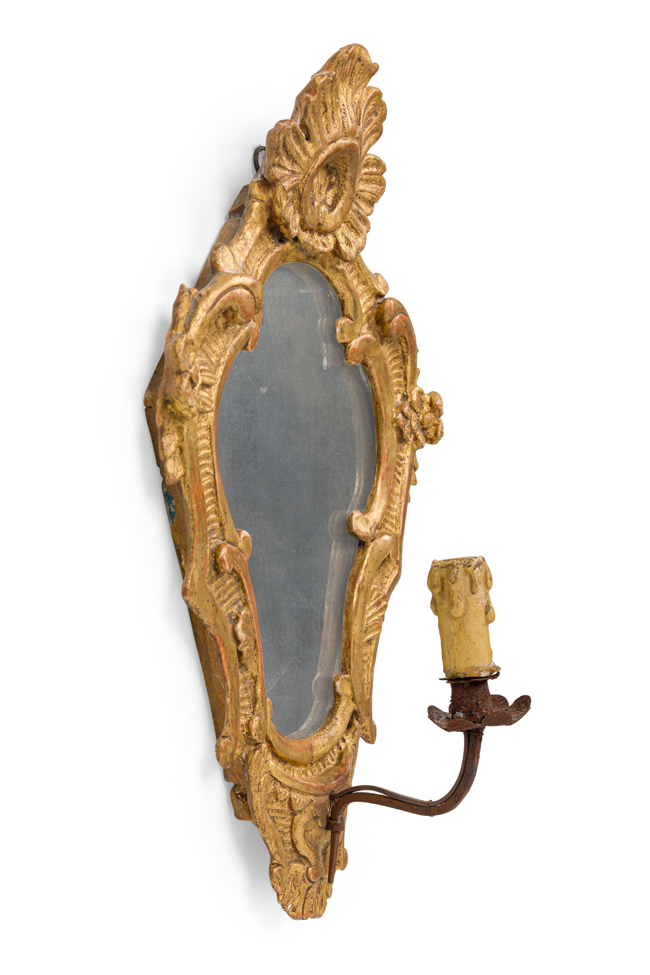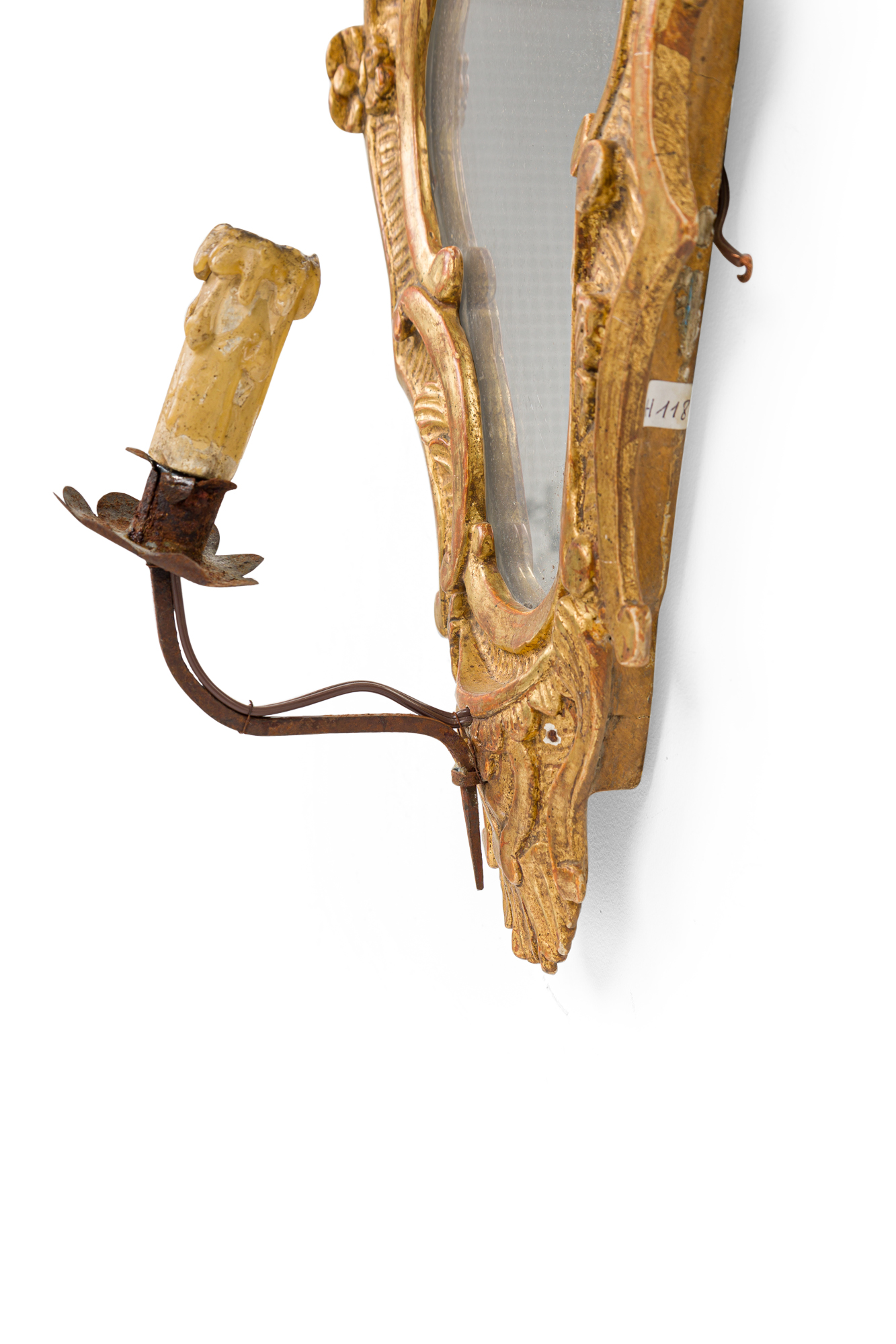 PAIR of Italian Rococo (possibly Venetian,18th Century) giltwood girandoles with carved frames surrounding a shaped mirror with a single wrought iron arm light fixture (PRICED AS PAIR)