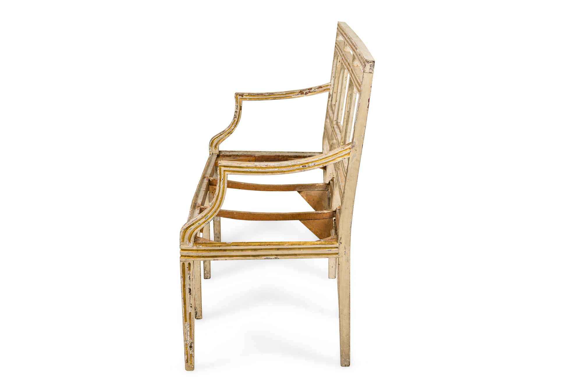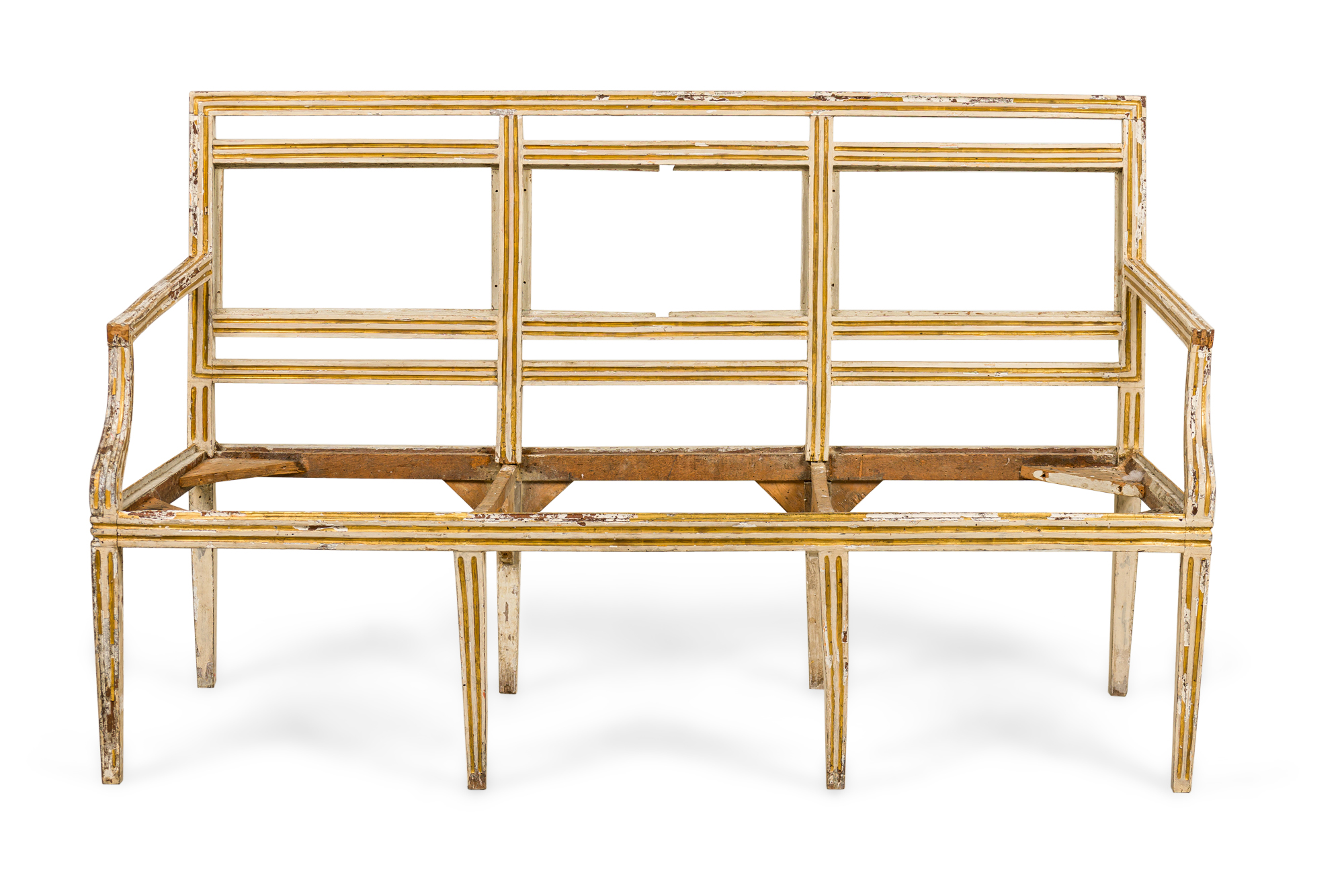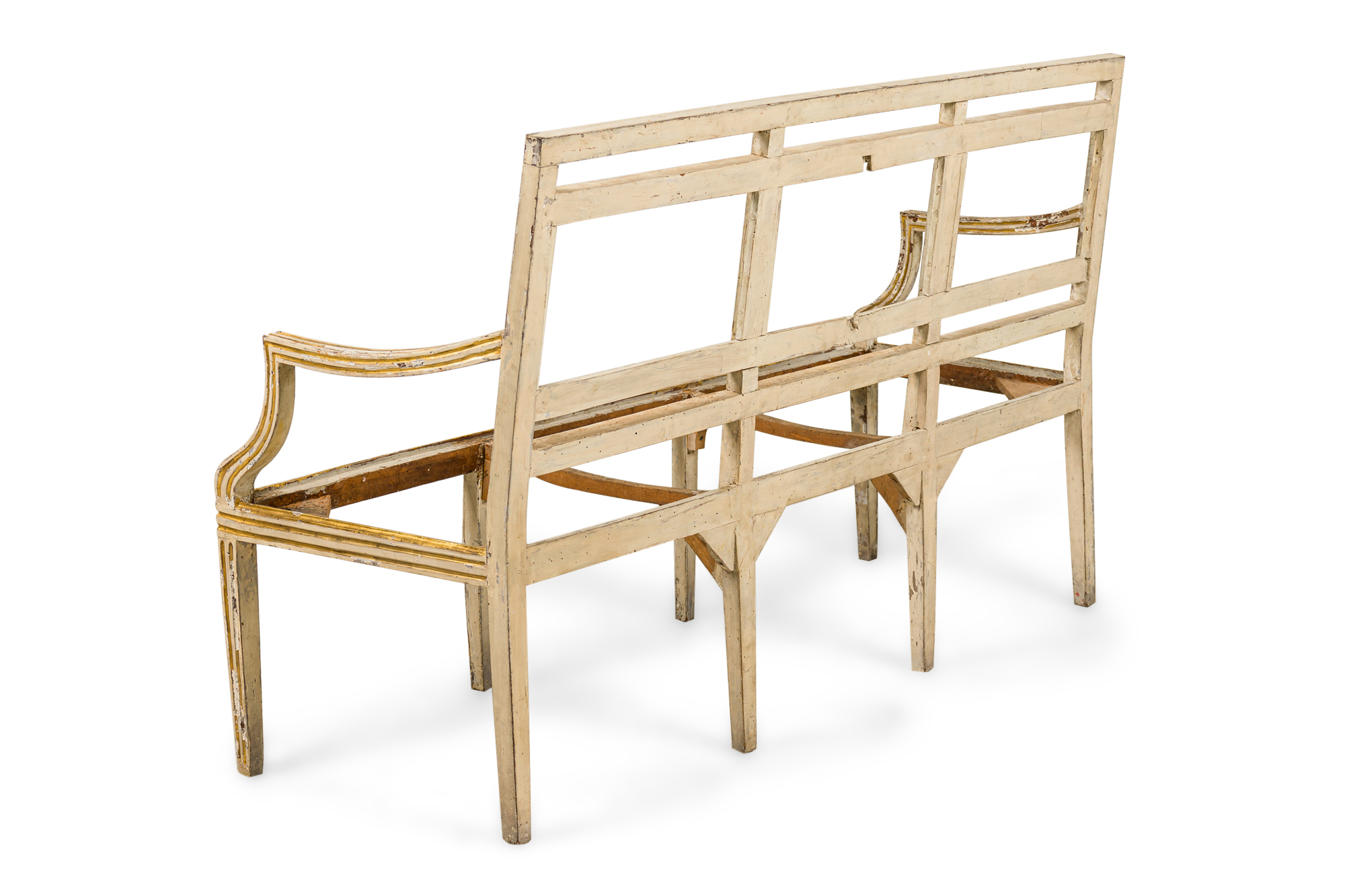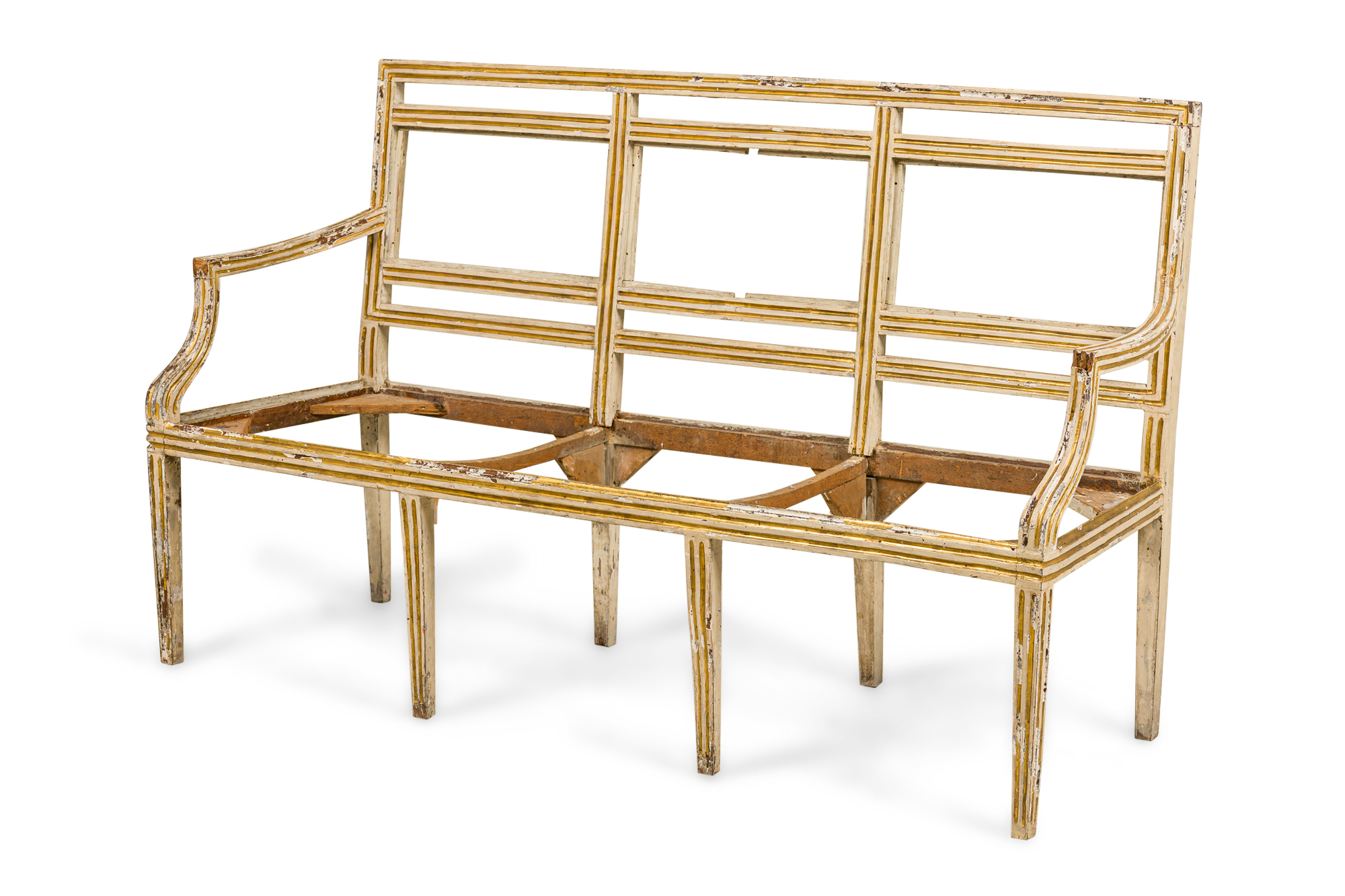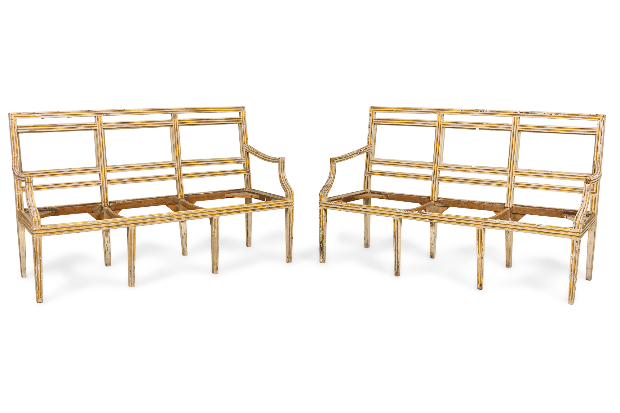 PAIR of Italian Neo-classic (18th Century) White Painted and Gilt Trim Settees (PRICED AS PAIR) ***NEEDS UPHOLSTERED SEAT; HEAVY WEAR TO FINISH***