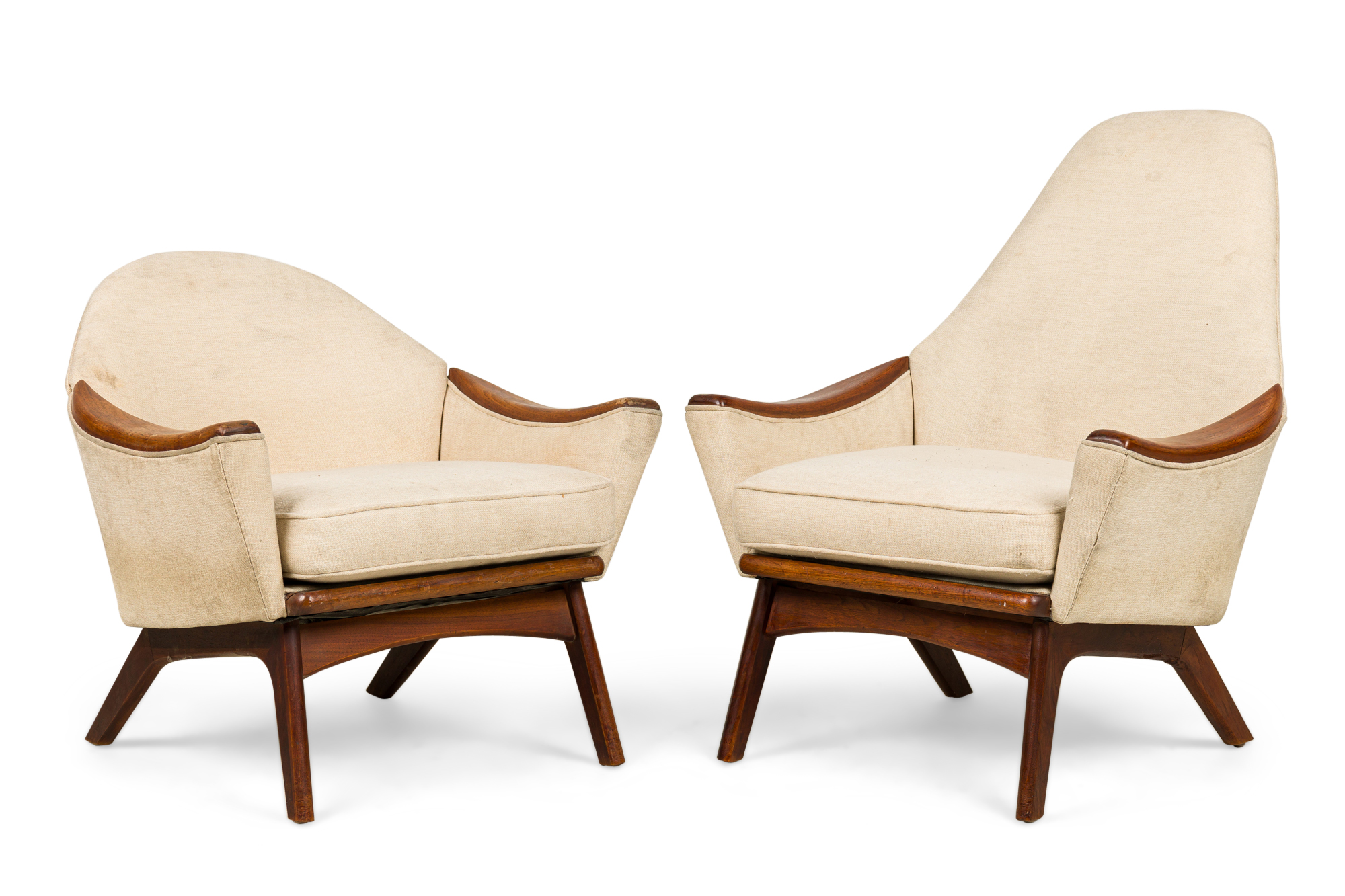 PAIR of Similar American Mid-Century mahogany Lounge / Easy Chairs with beige upholstry with 1 having a high back and 1 having a low round back (ADRIAN PEARSALL) (PRICED AS PAIR).