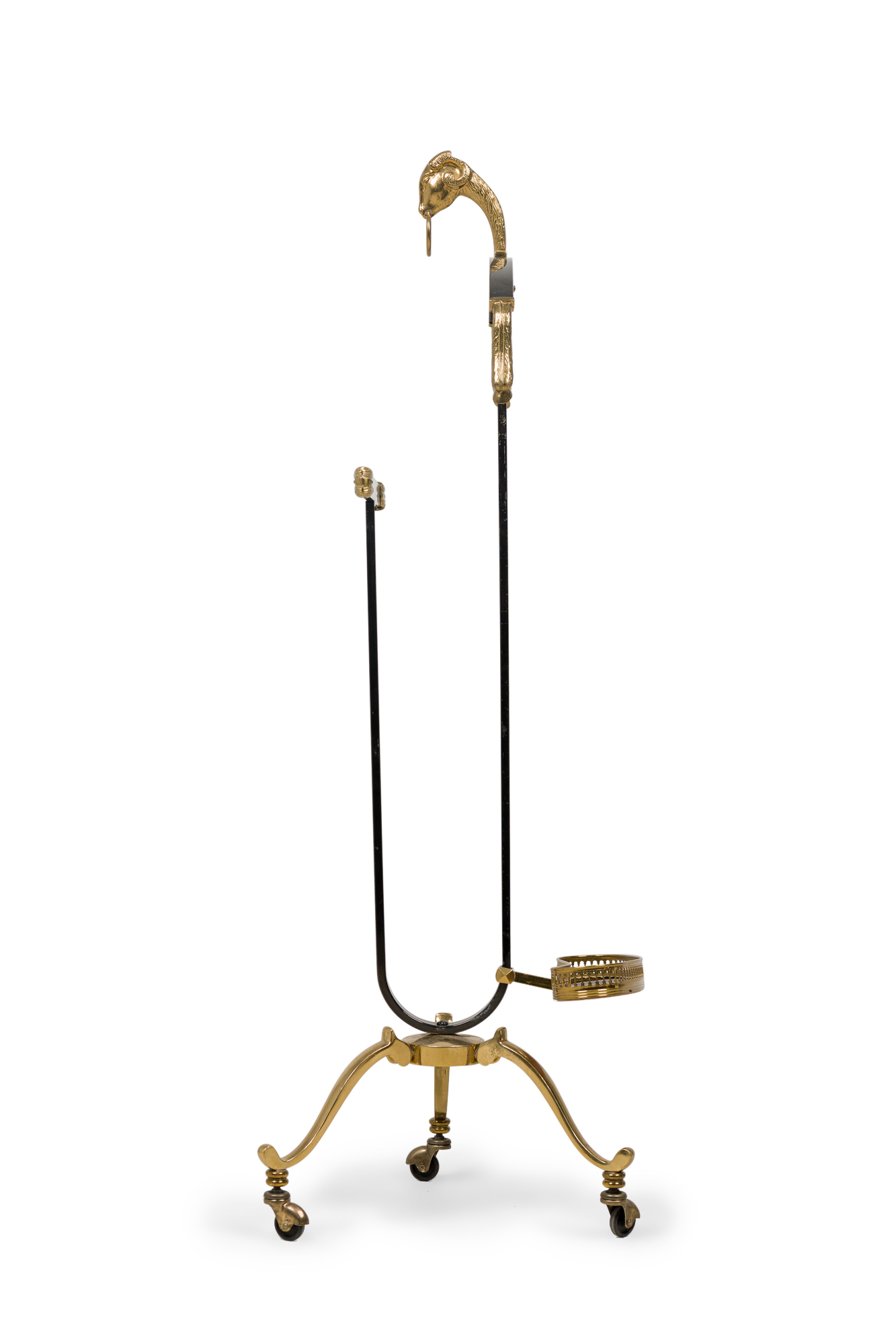 French Mid-Century black enameled steel and brass valet with a ram head accents and adjustable oval tray resting on 3 legs with castors (att: MAISON JANSEN) (needs screw to hold tray).