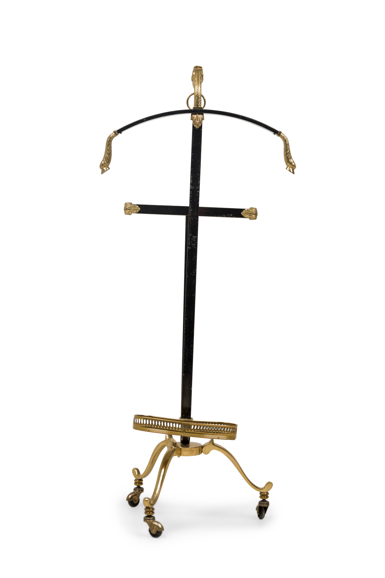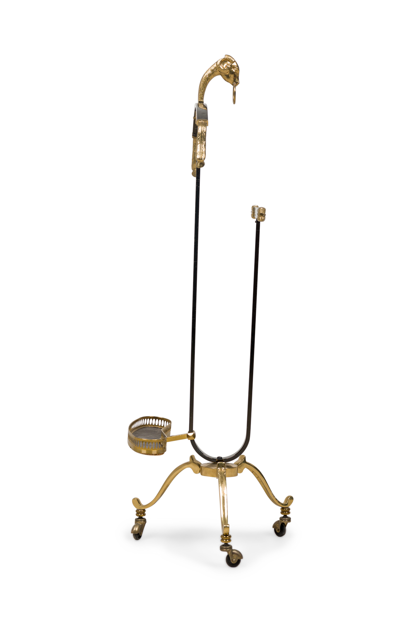 French Mid-Century black enameled steel and brass valet with a ram head accents and adjustable oval tray resting on 3 legs with castors (att: MAISON JANSEN) (needs screw to hold tray)
