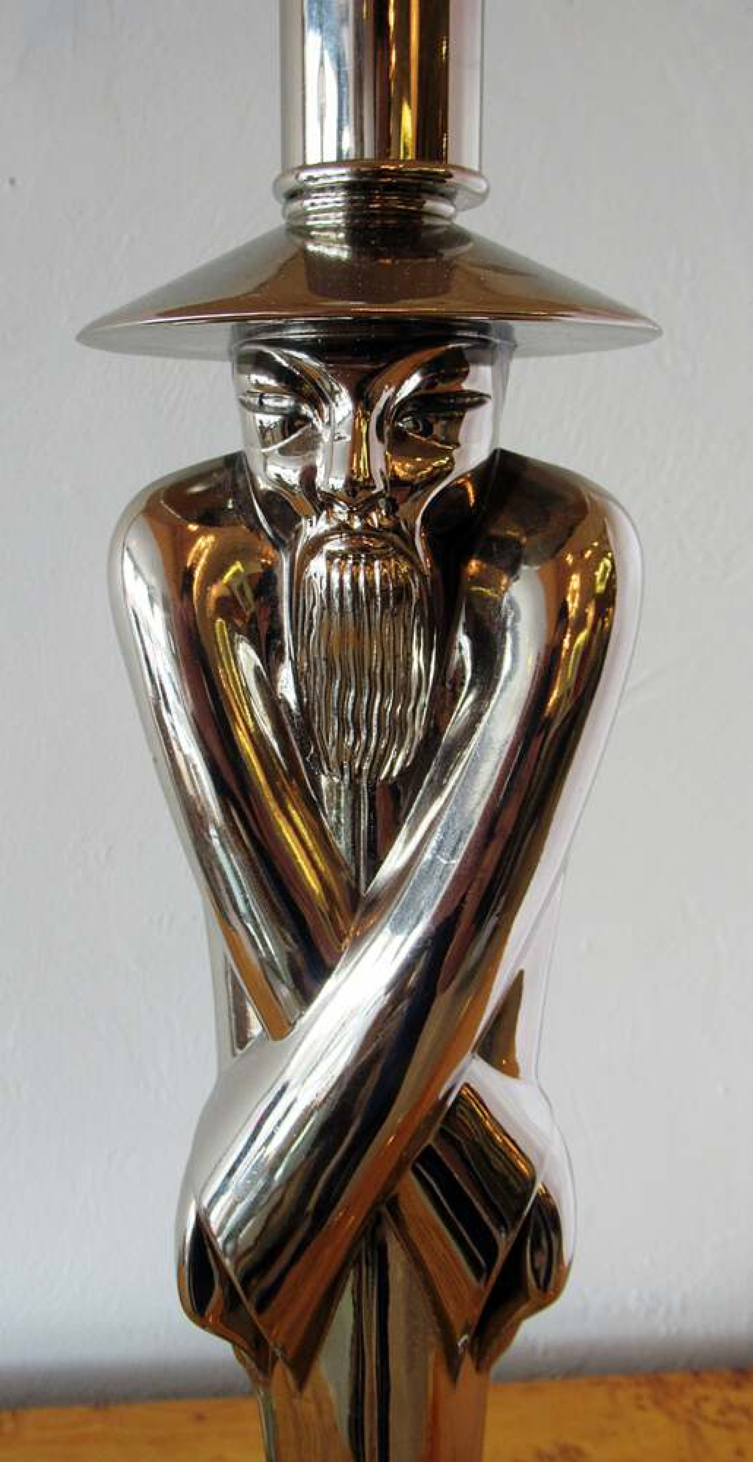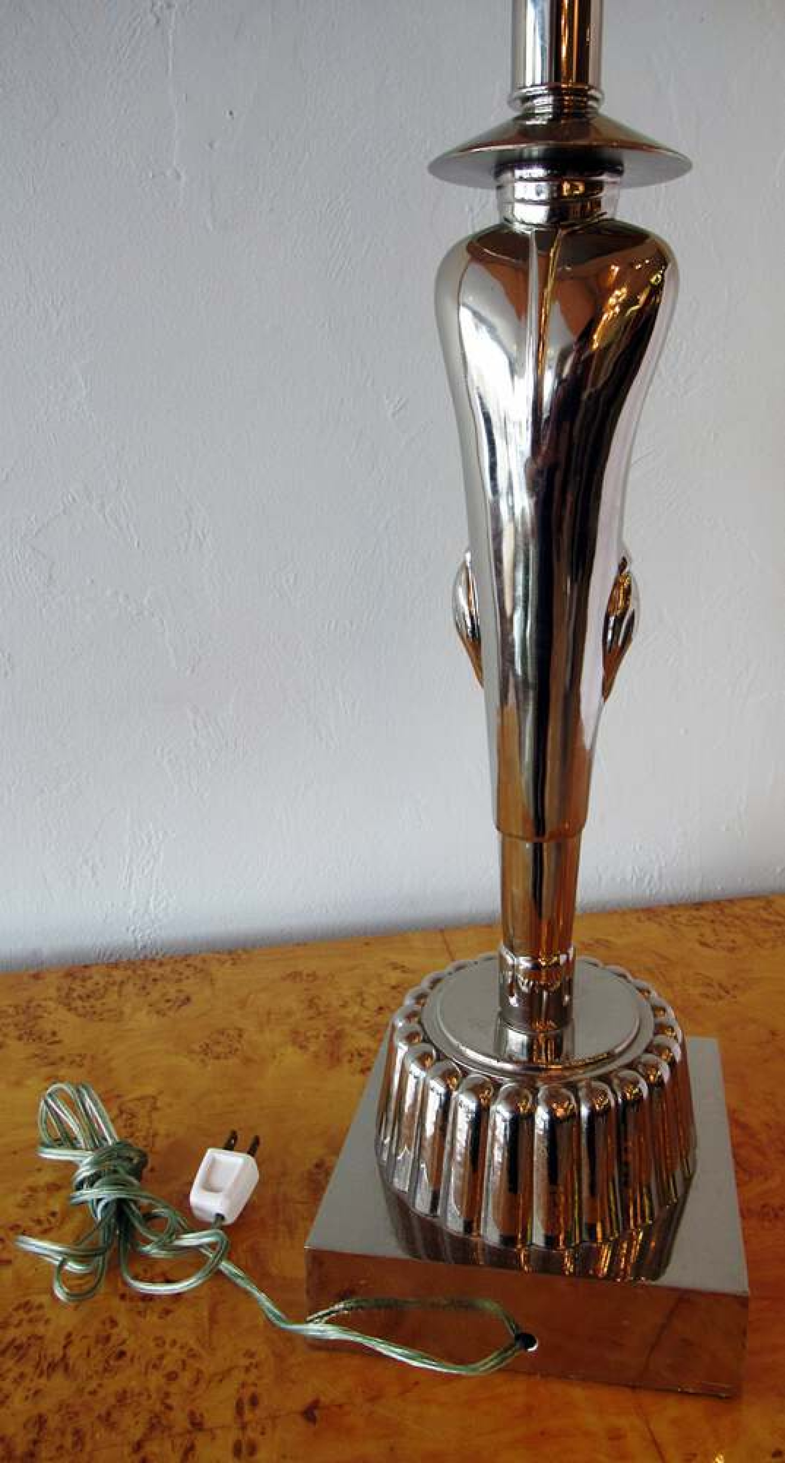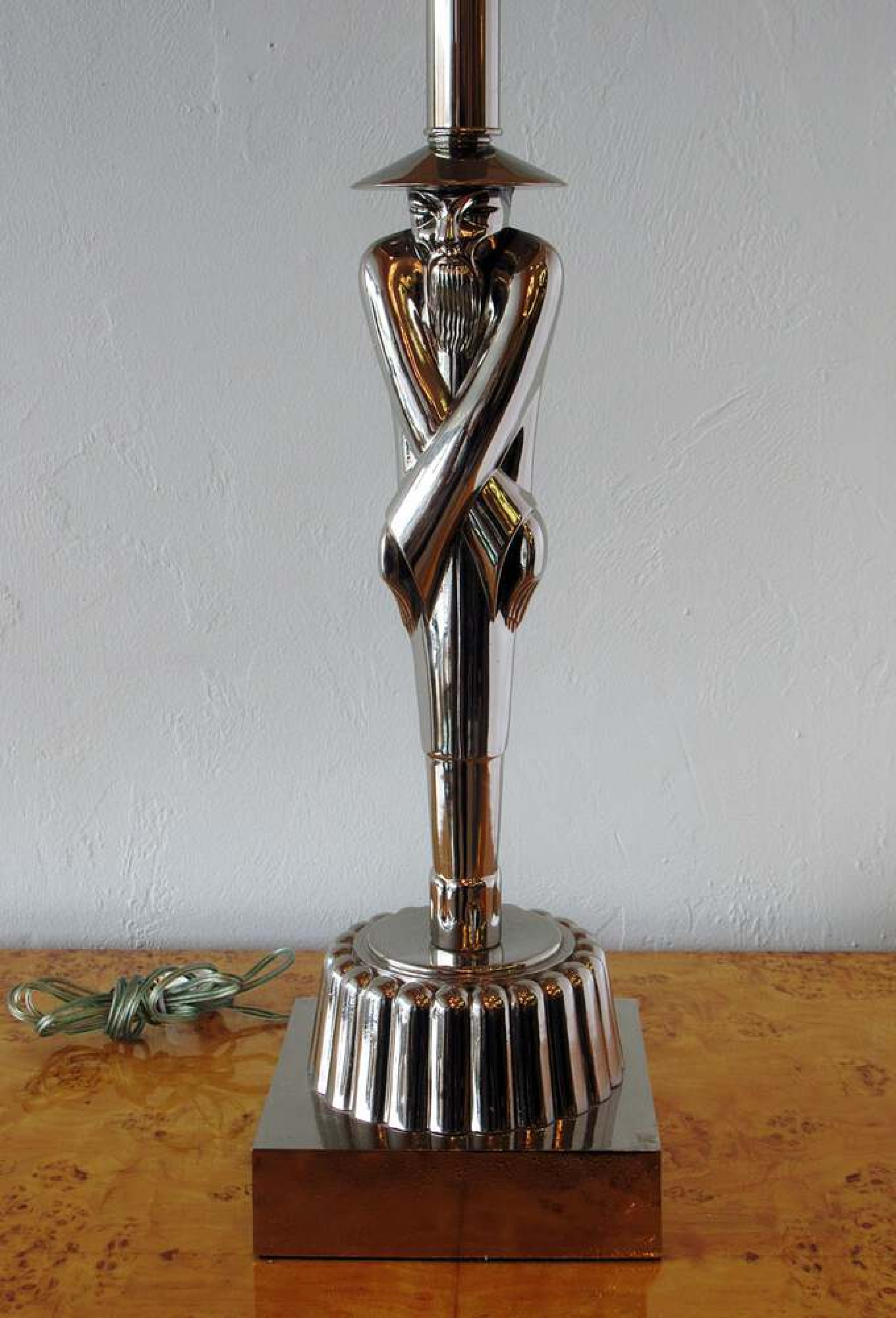 American Mid-Century Modern Chrome Table Lamps having a stylized Chinoiserie figure on a fluted pedestal resting on a square base, (VICTOR SCHRECKENGOST 1930s).