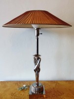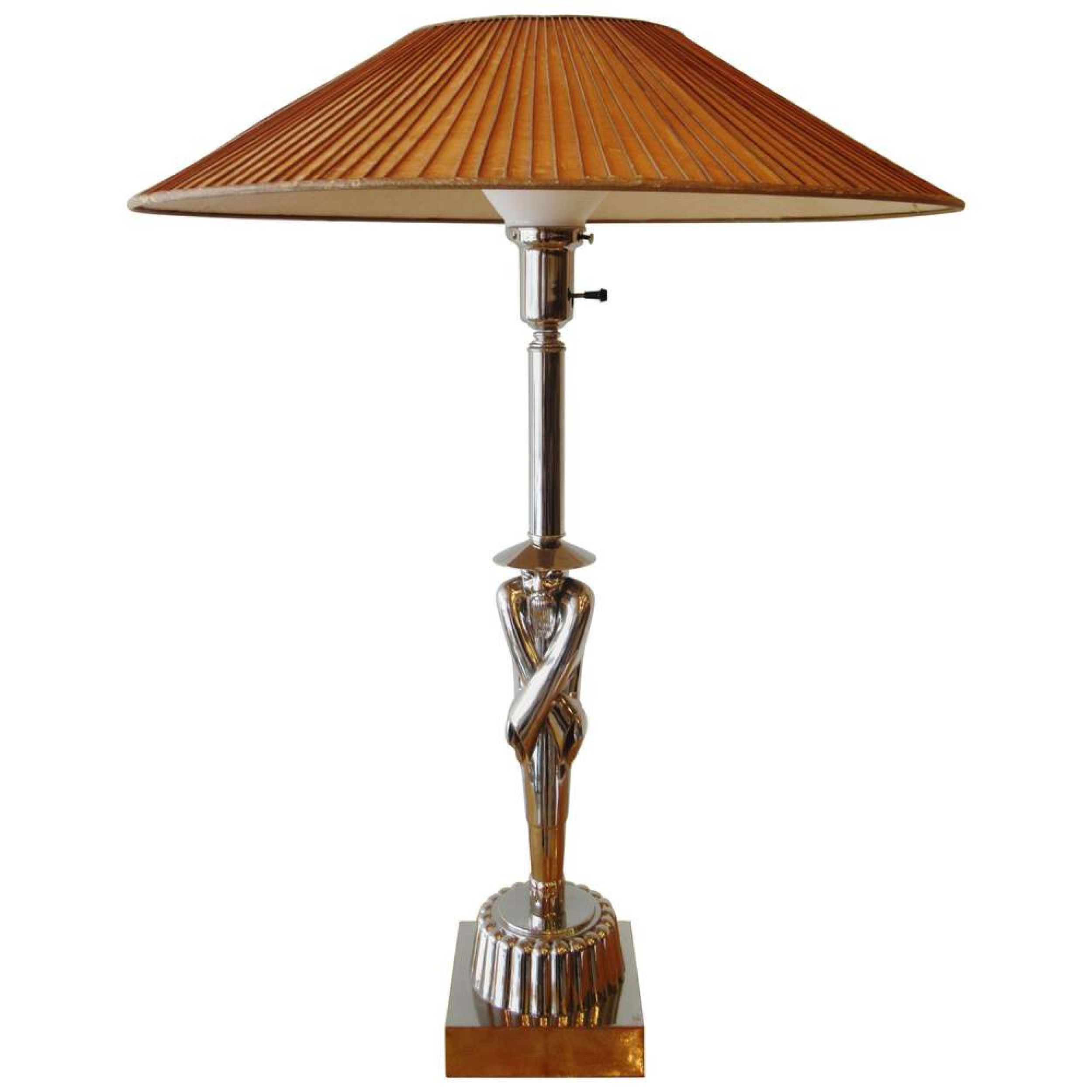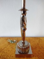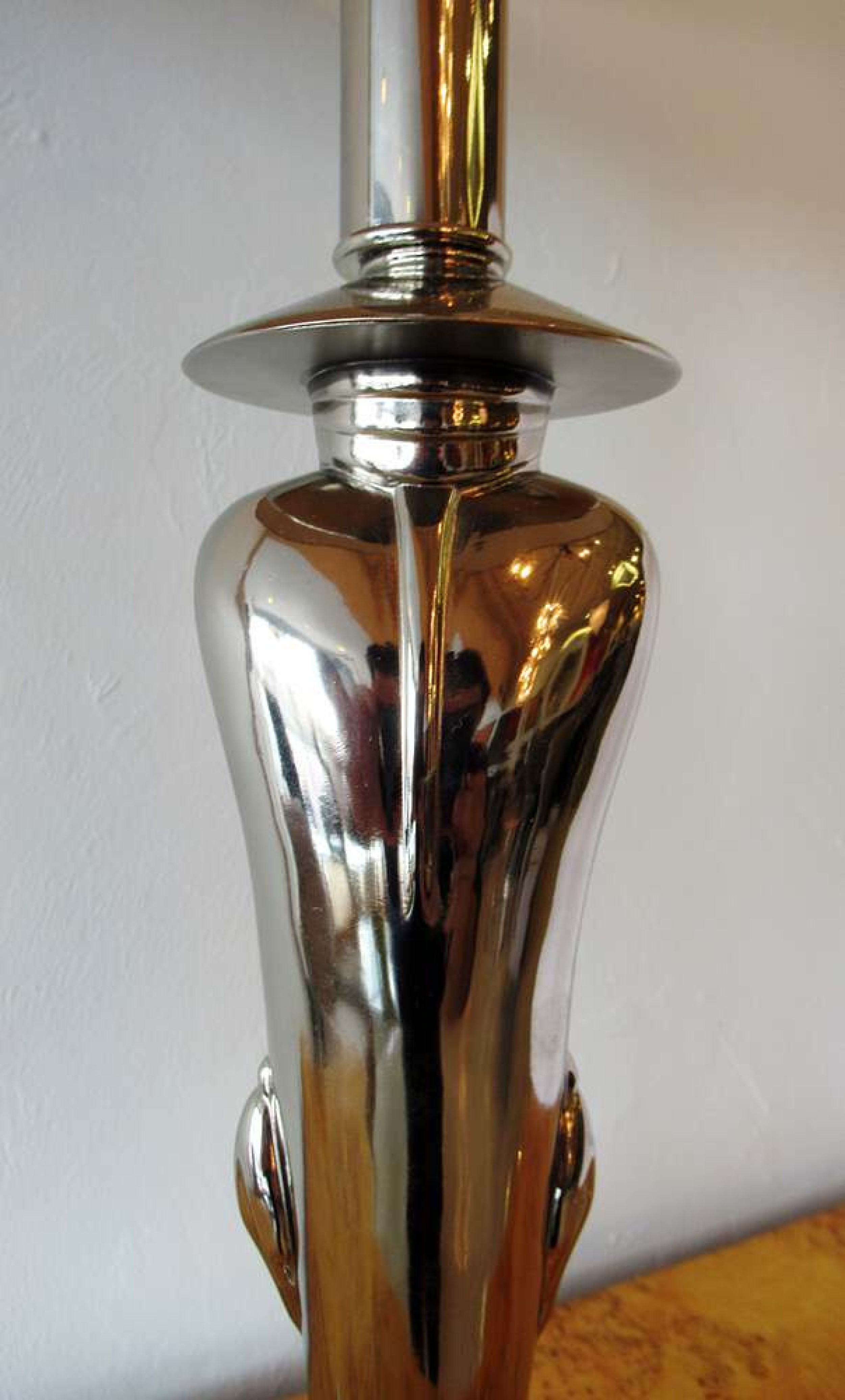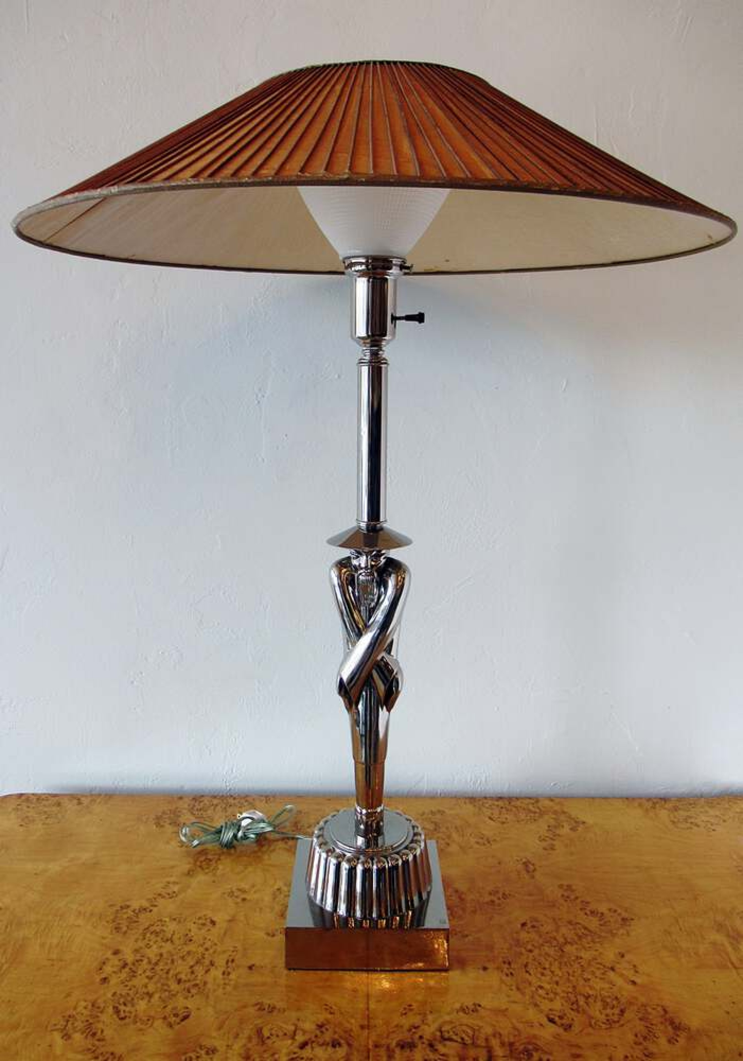 American Mid-Century Modern Chrome Table Lamps having a stylized Chinoiserie figure on a fluted pedestal resting on a square base, (VICTOR SCHRECKENGOST 1930s).