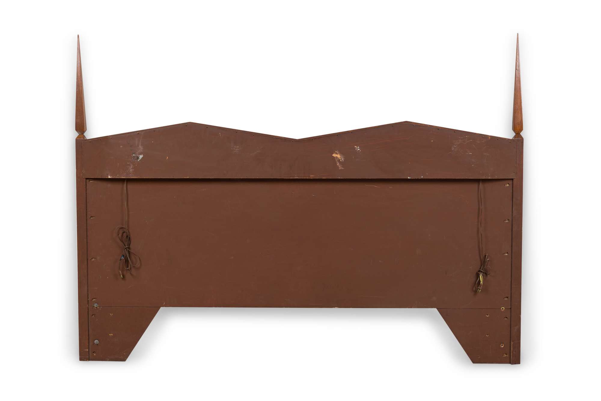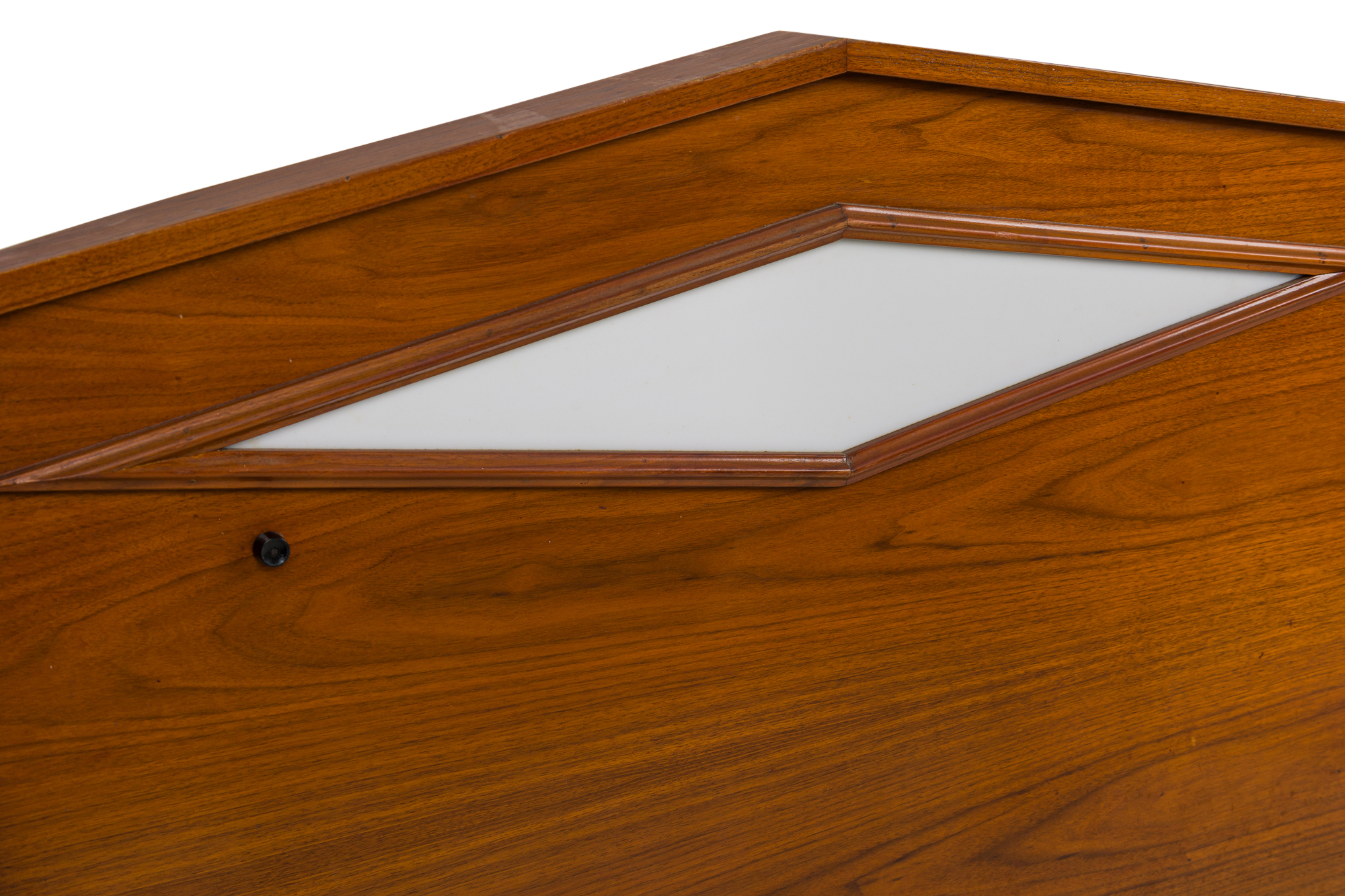 Italian Mid-Century Modern King Size walnut headboard with finial sides and a pair of diamond shaped Illuminated light panels (style of GIO PONTI).