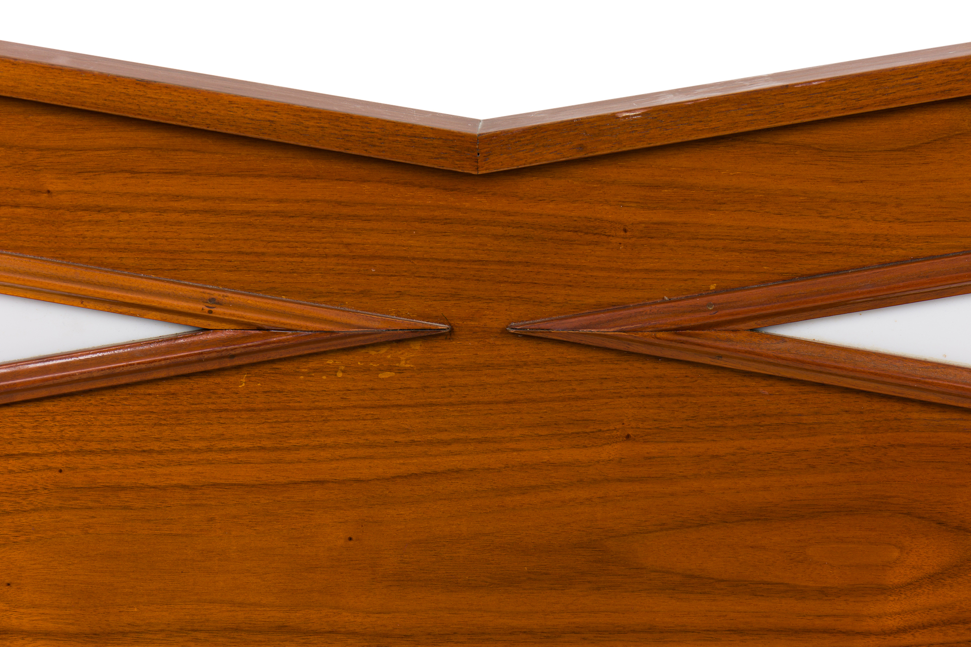 Italian Mid-Century Modern King Size walnut headboard with finial sides and a pair of diamond shaped Illuminated light panels (style of GIO PONTI)