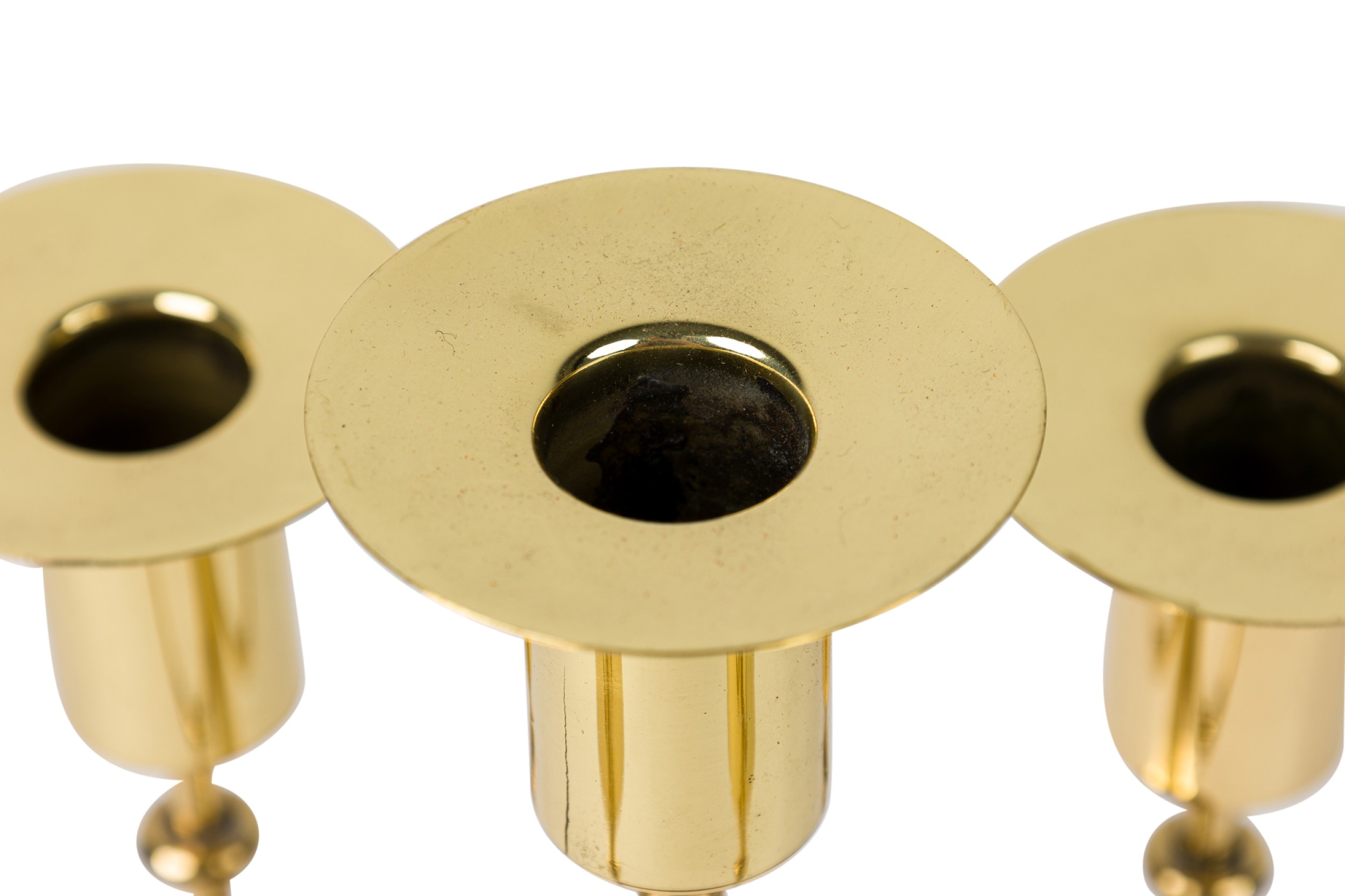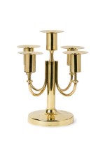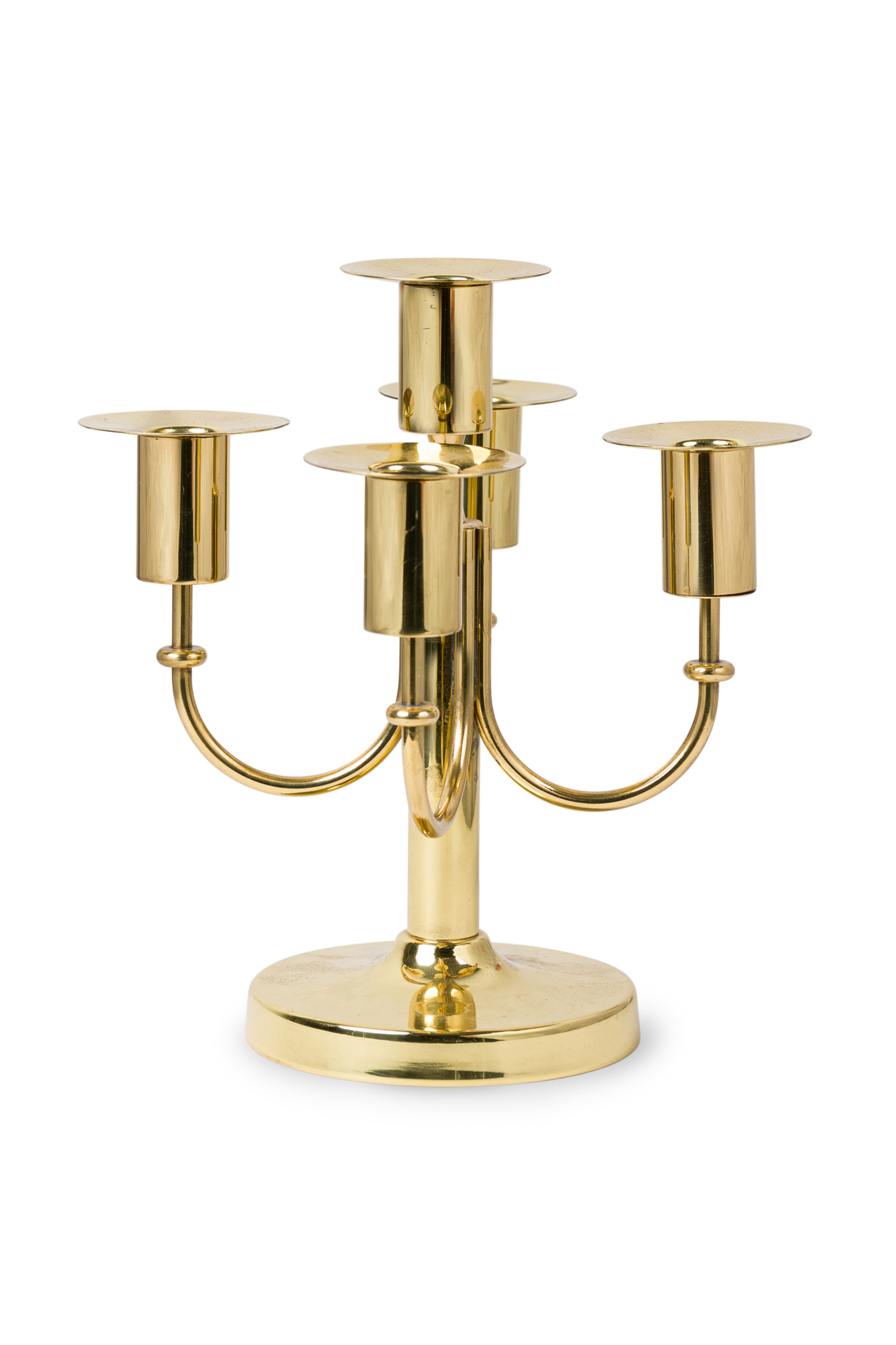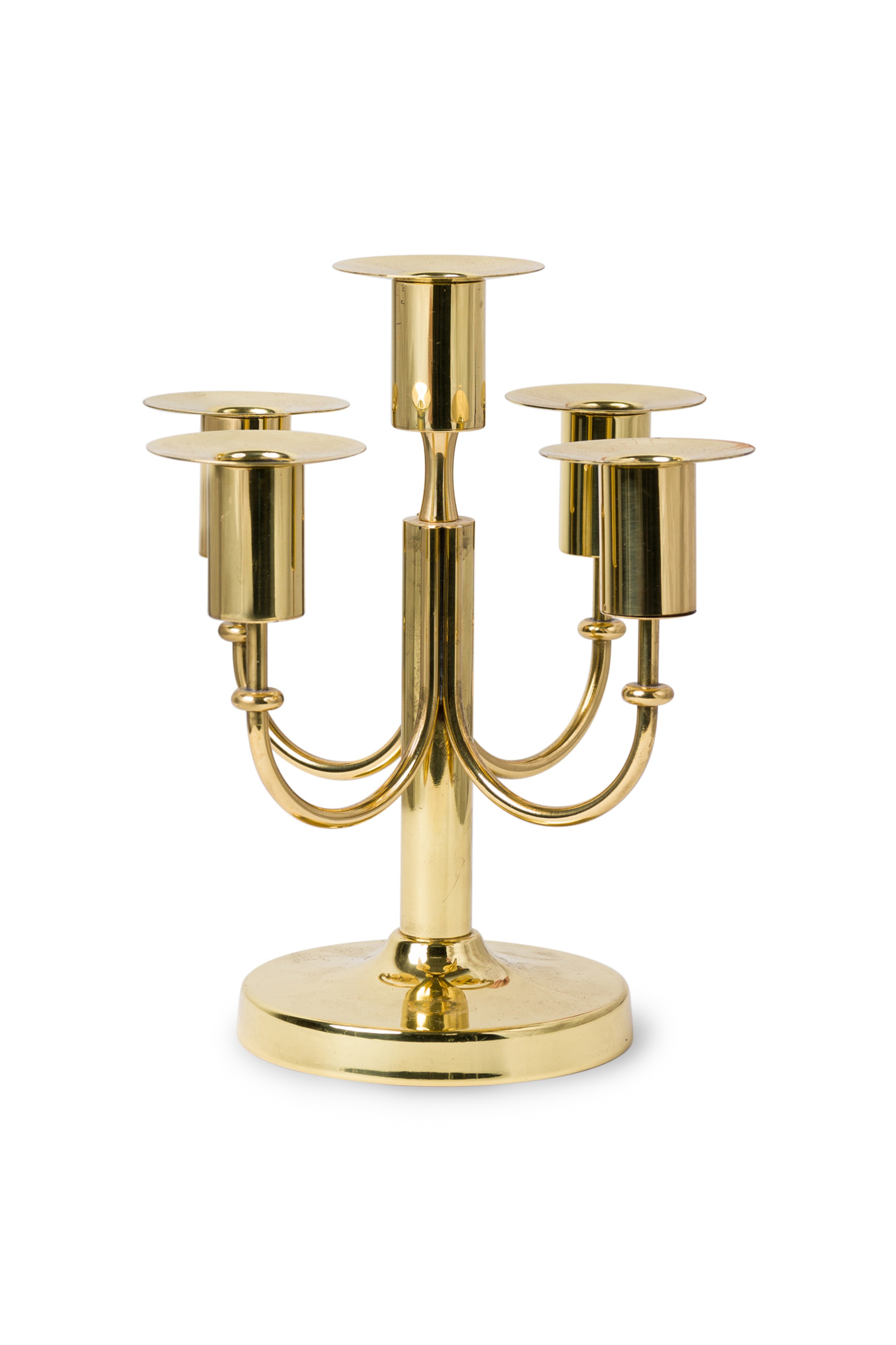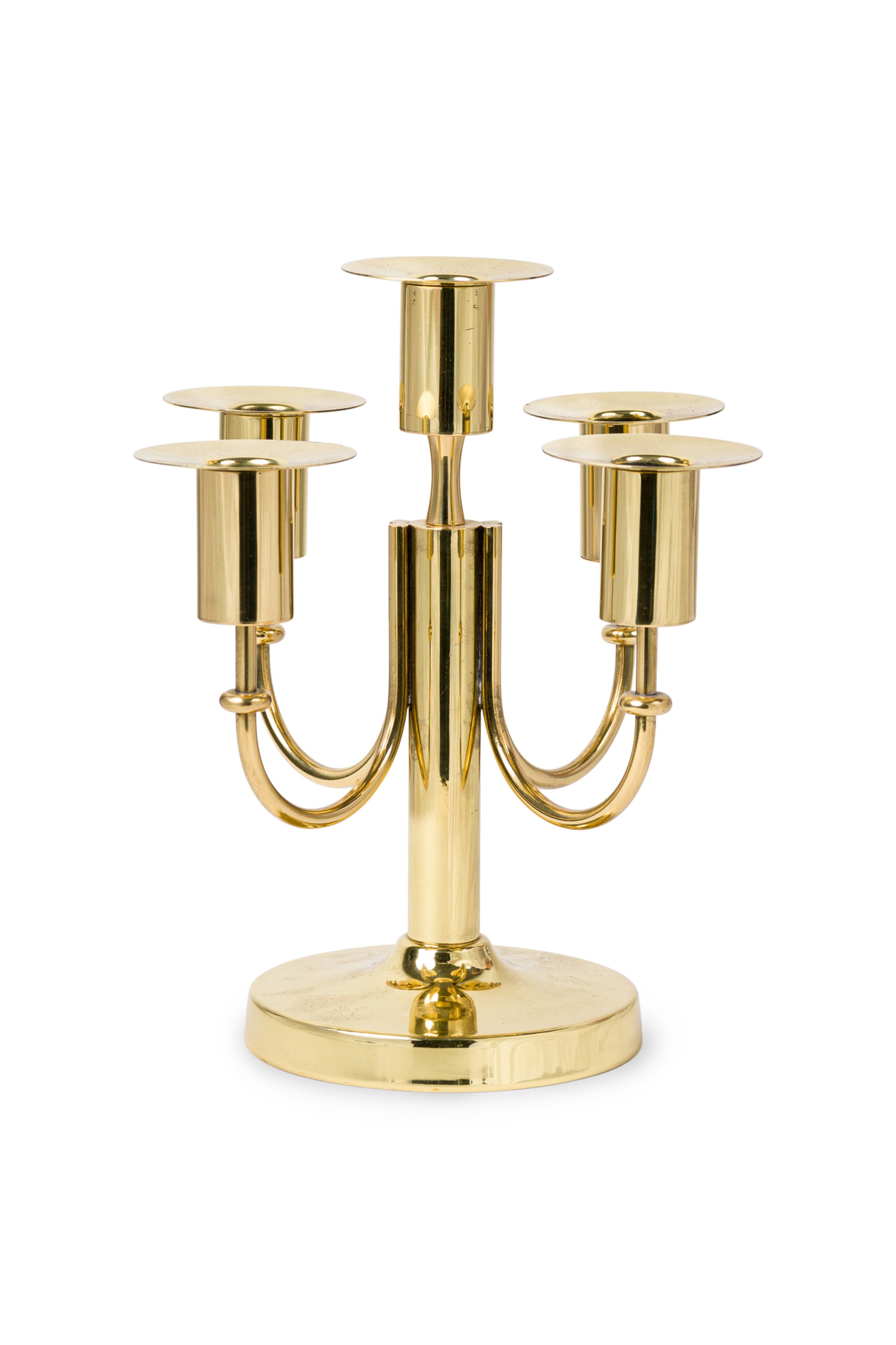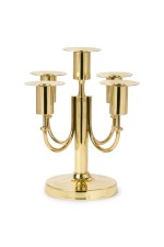 American Mid-Century Brass 5 arm candelabra resting on a round base (TOMMI PARZINGER).