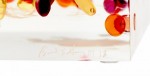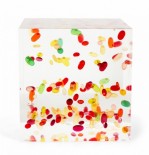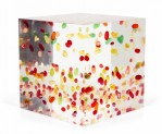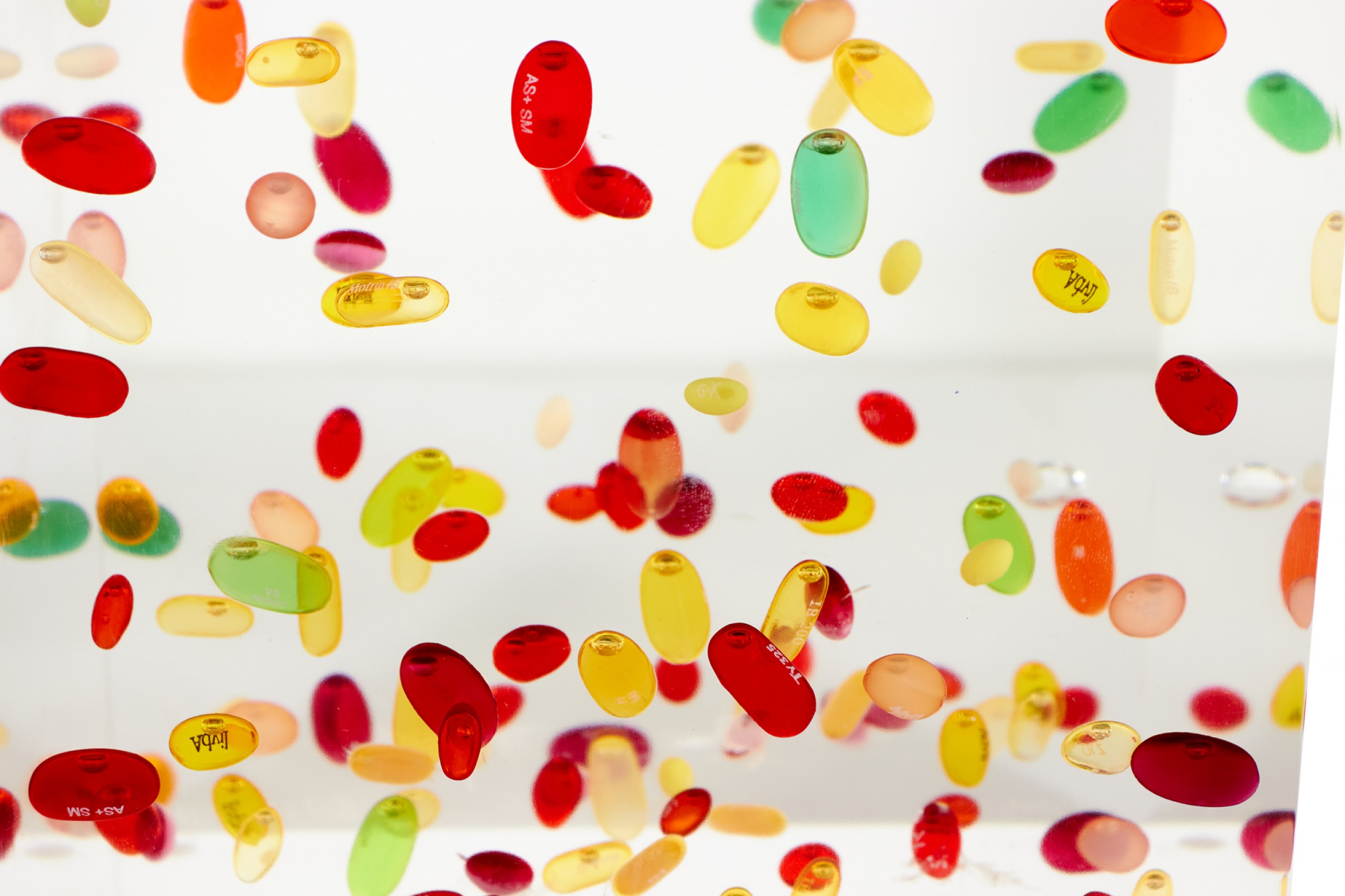 Contemporary cube sculpture titled "Contellation" by Ray Geary comprised of a variety of pills suspended elegantly in clear resin..