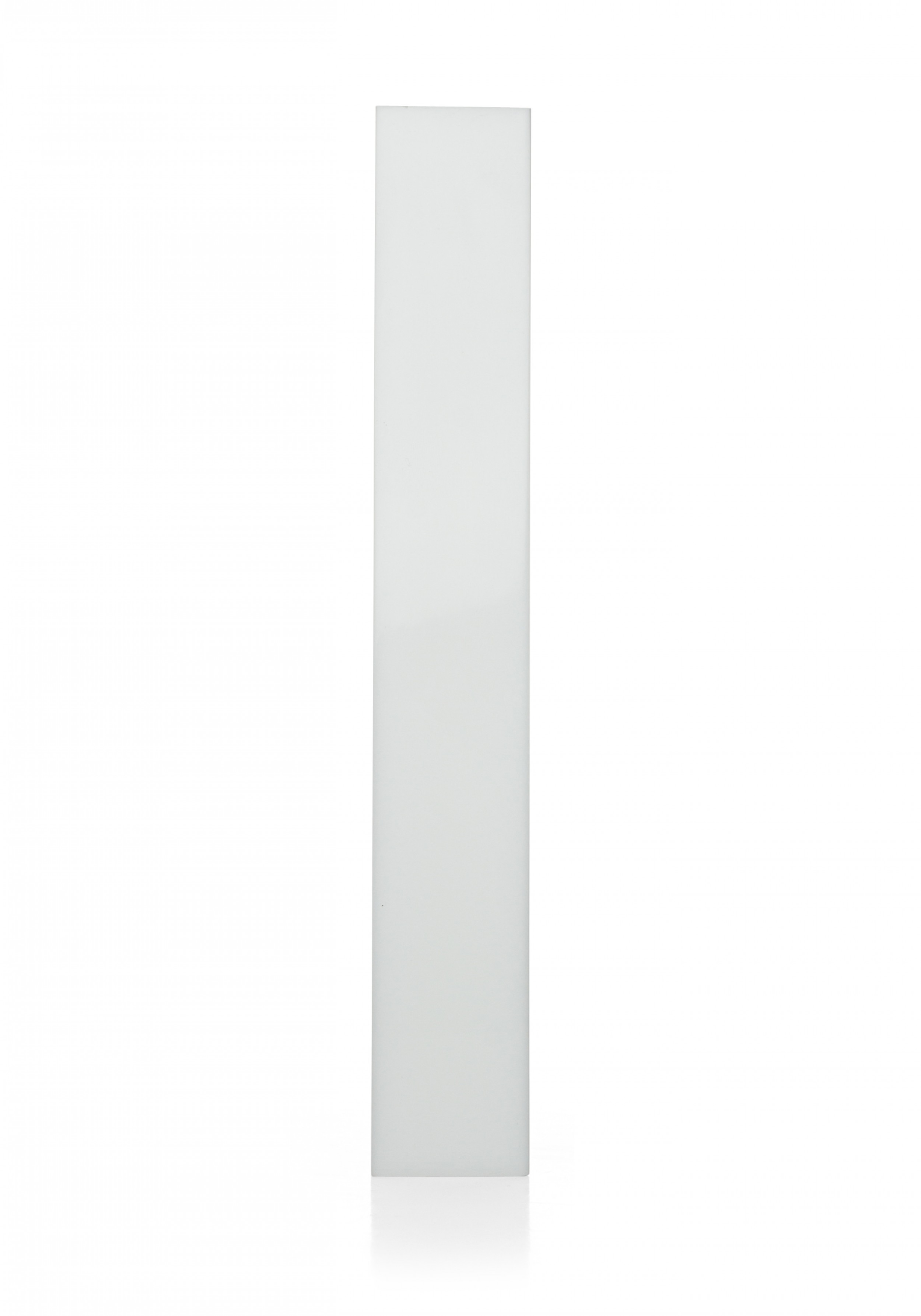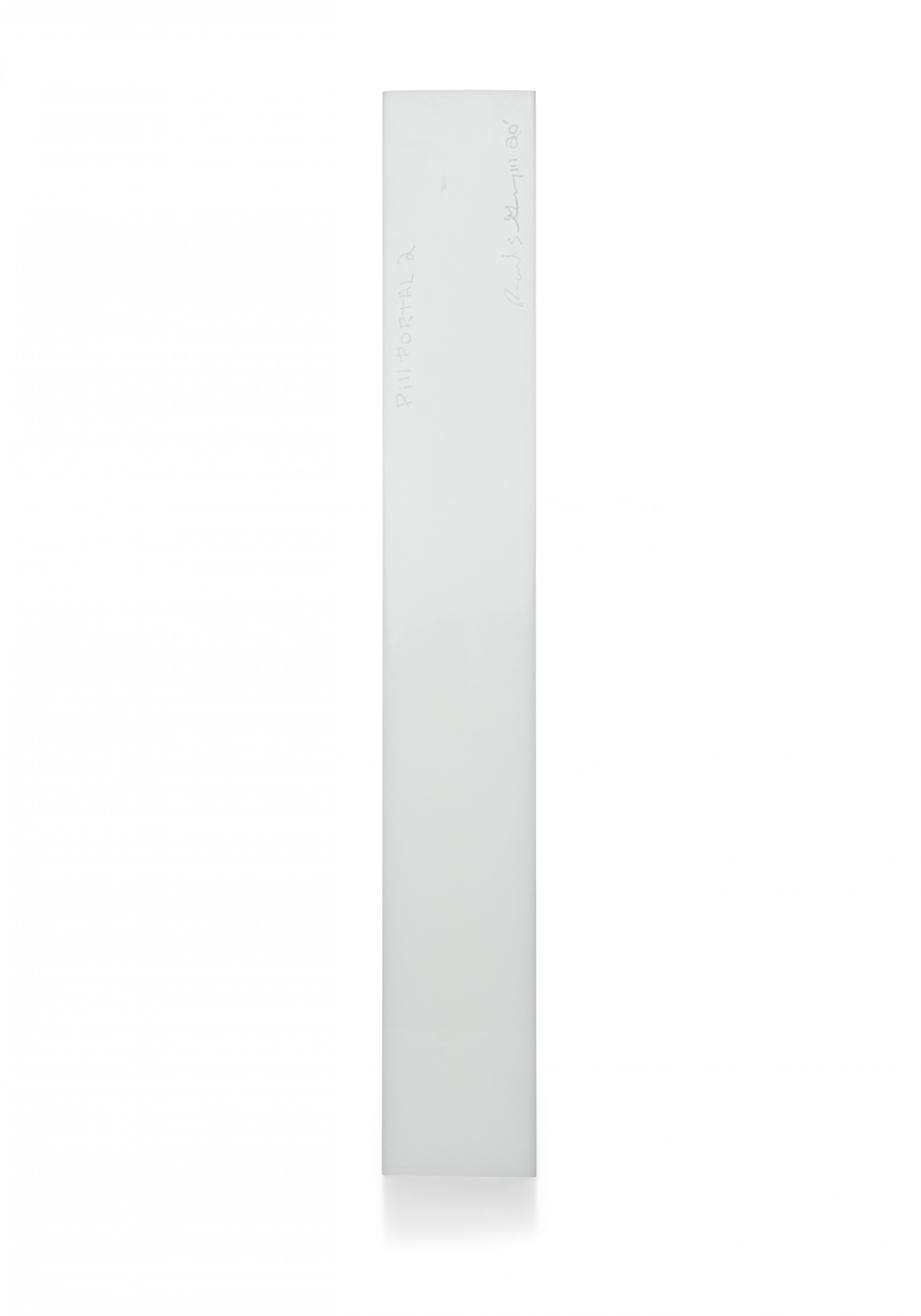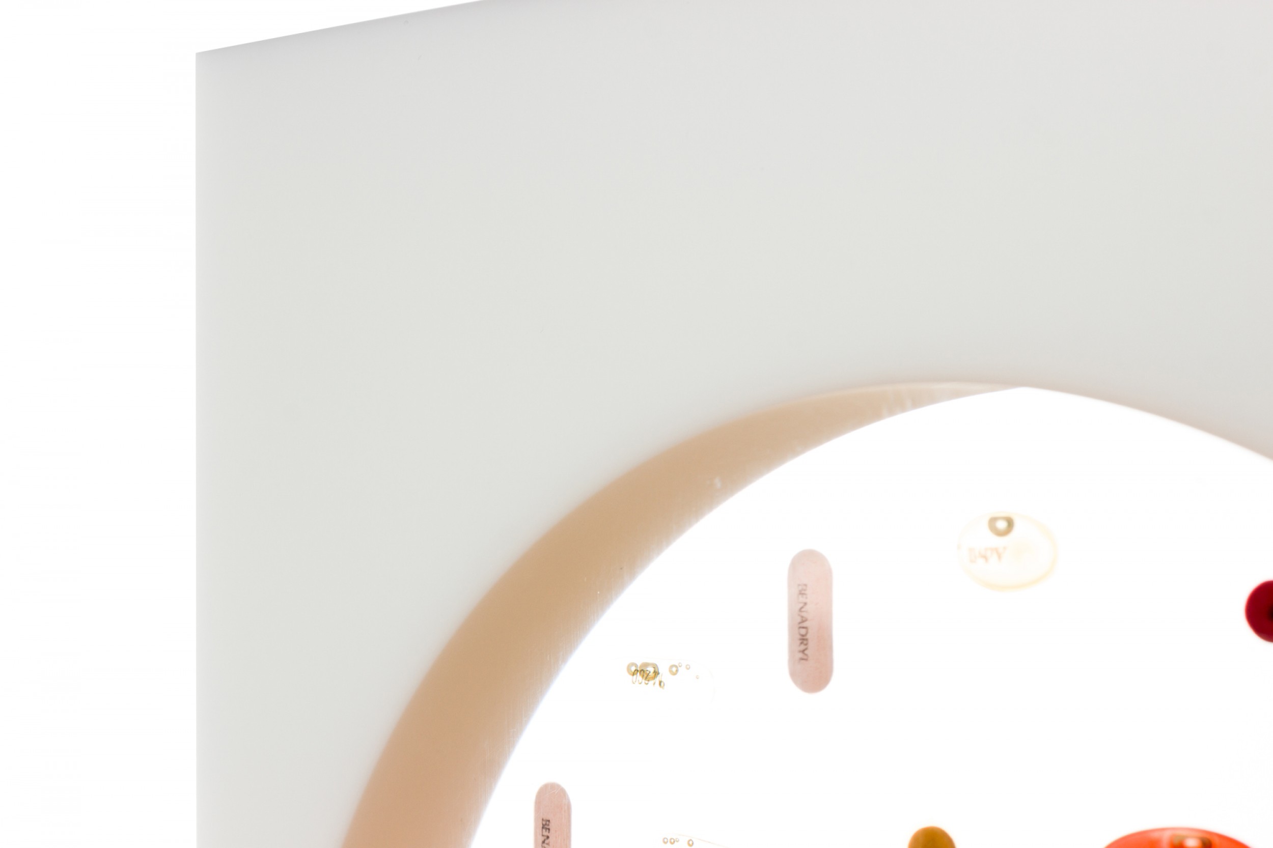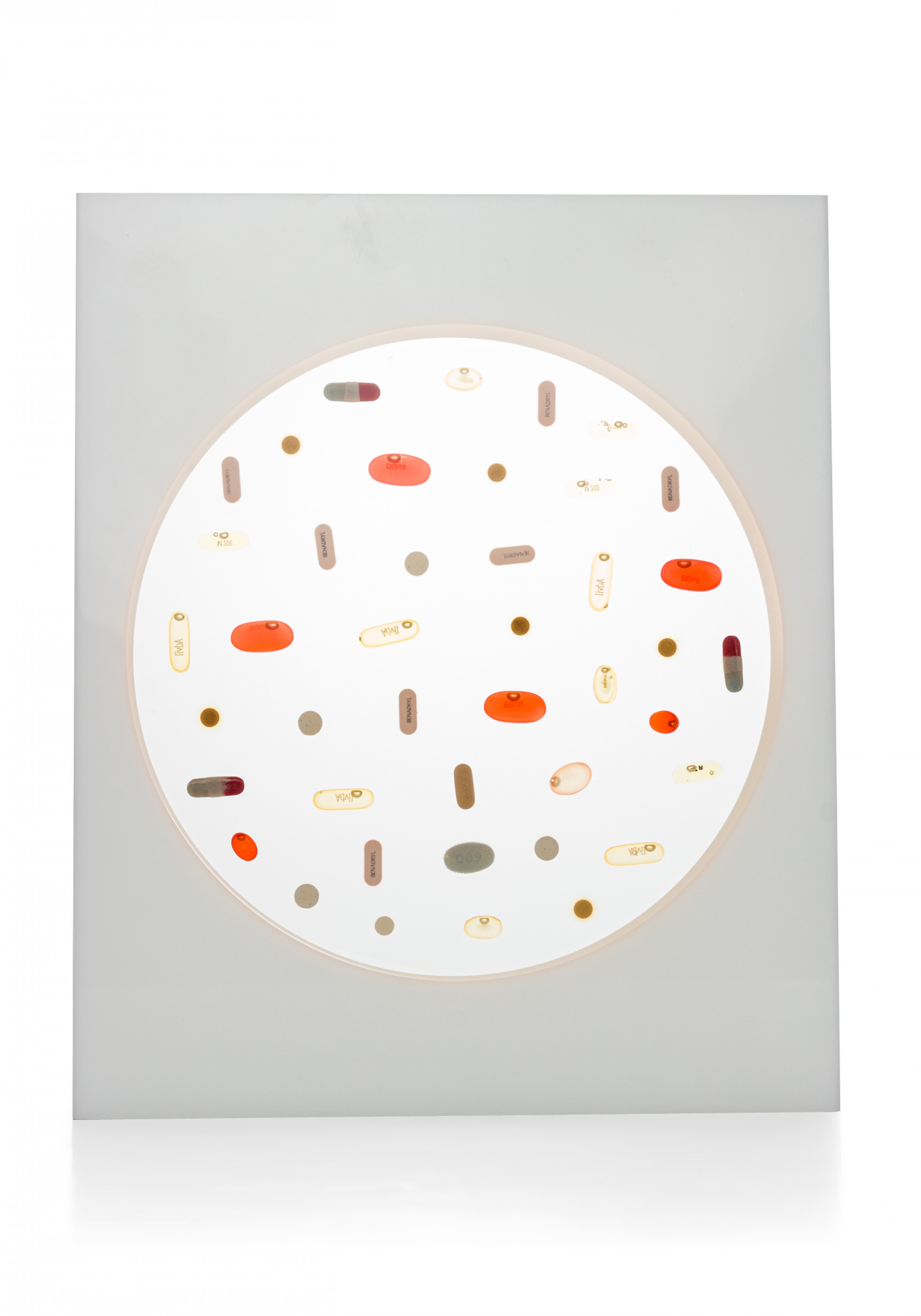 Contemporary abstract resin sculpture titled, "White Pill Portal," a rectangular white resin piece with a translucent central circle in which various colorful pills are suspended. (RAY GEARY).