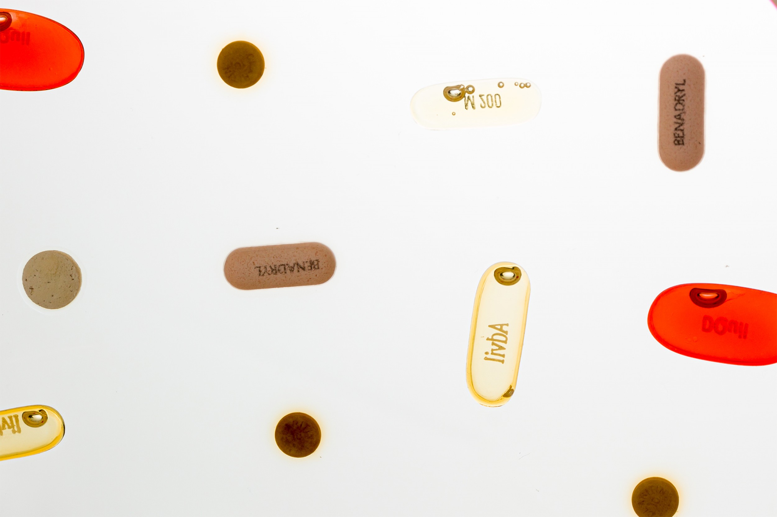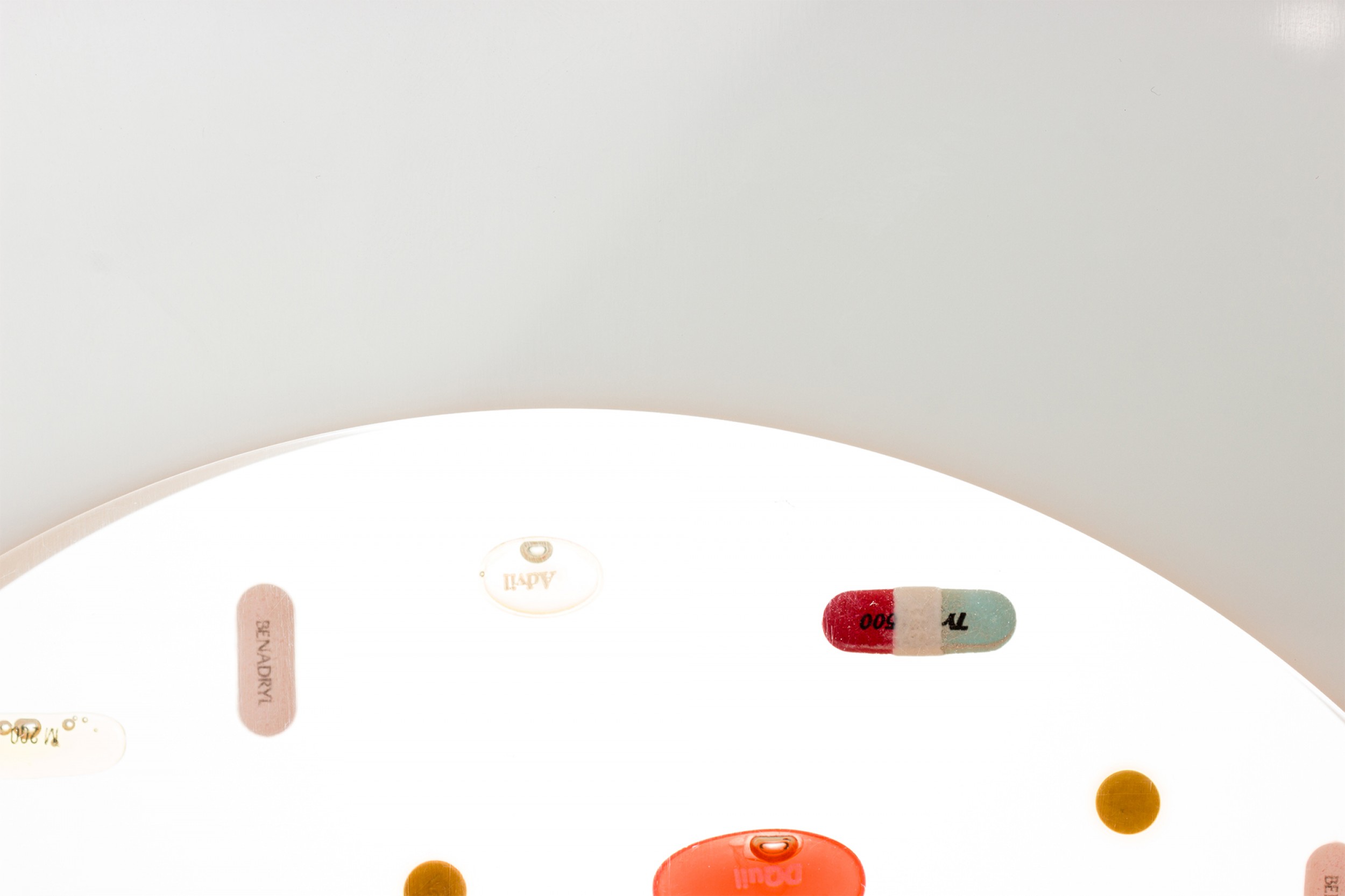 Contemporary abstract resin sculpture titled, "White Pill Portal," a rectangular white resin piece with a translucent central circle in which various colorful pills are suspended. (RAY GEARY)