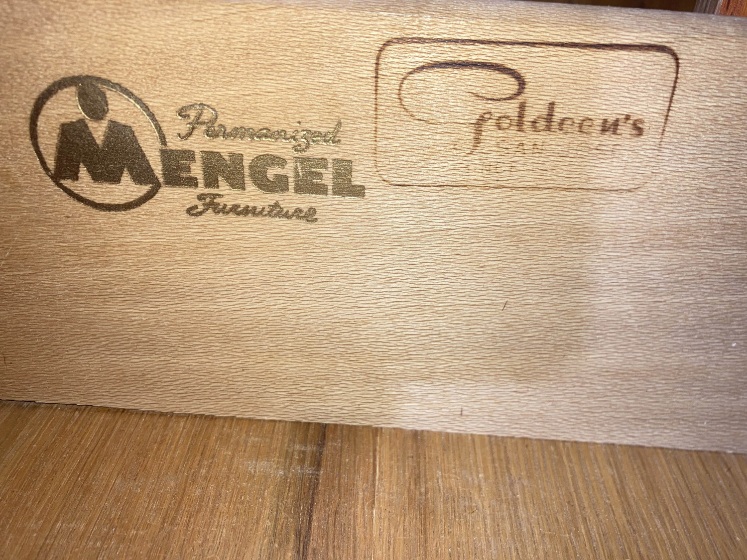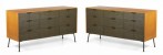 2 American Mid-Century (1950s) 9-drawer dressers with dark brown stained and geometrically incised drawer fronts with trapezoidal iron drawer pulls in a light walnut case resting on four angled iron legs ending in circular feet. (RAYMOND LOEWY FOR MENGEL FURNITURE, stamp on drawer interiors)(PRICED EACH).