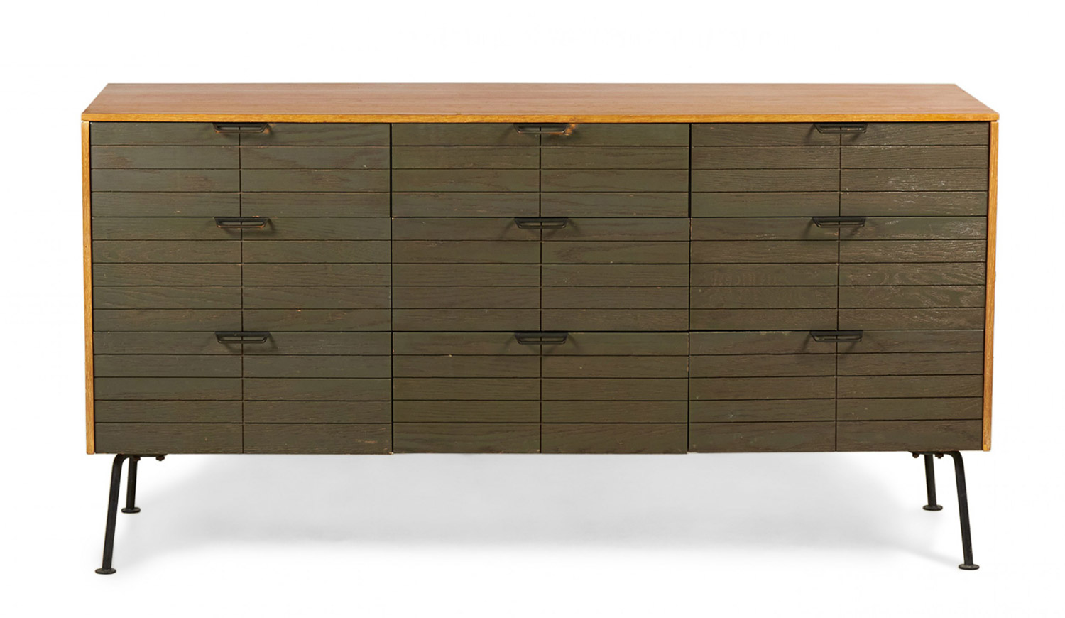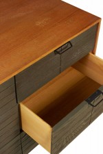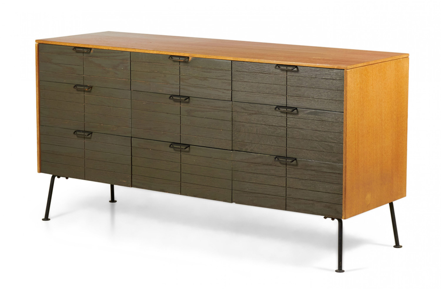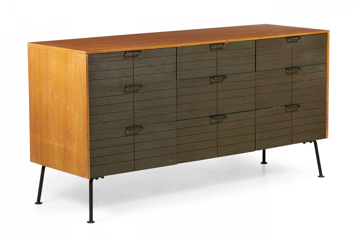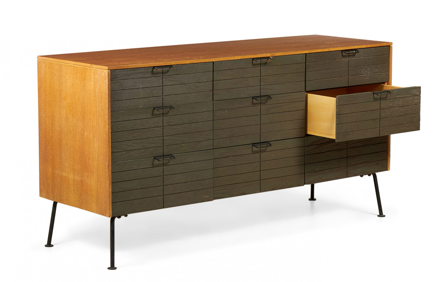 2 American Mid-Century (1950s) 9-drawer dressers with dark brown stained and geometrically incised drawer fronts with trapezoidal iron drawer pulls in a light walnut case resting on four angled iron legs ending in circular feet. (RAYMOND LOEWY FOR MENGEL FURNITURE, stamp on drawer interiors)(PRICED EACH)