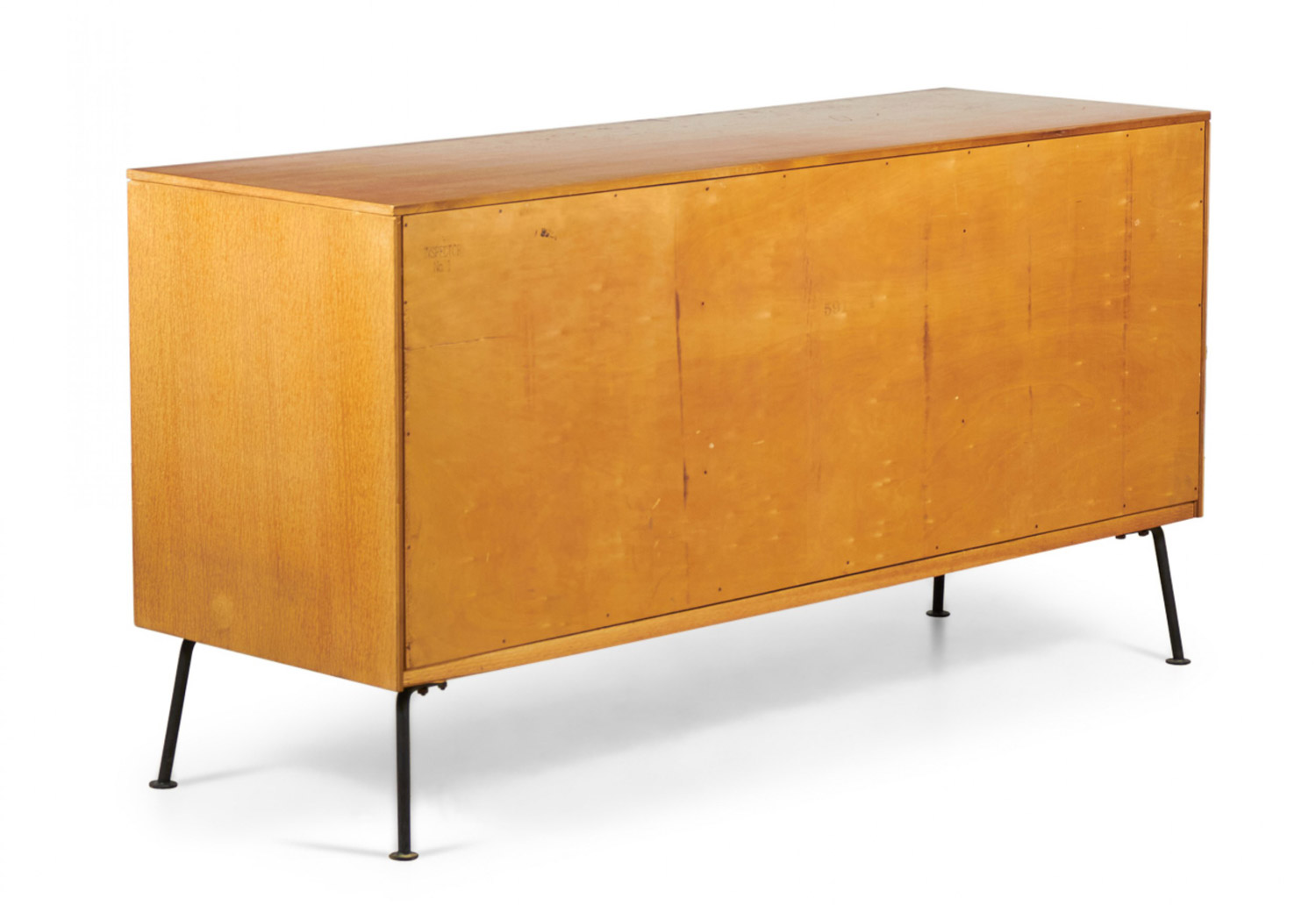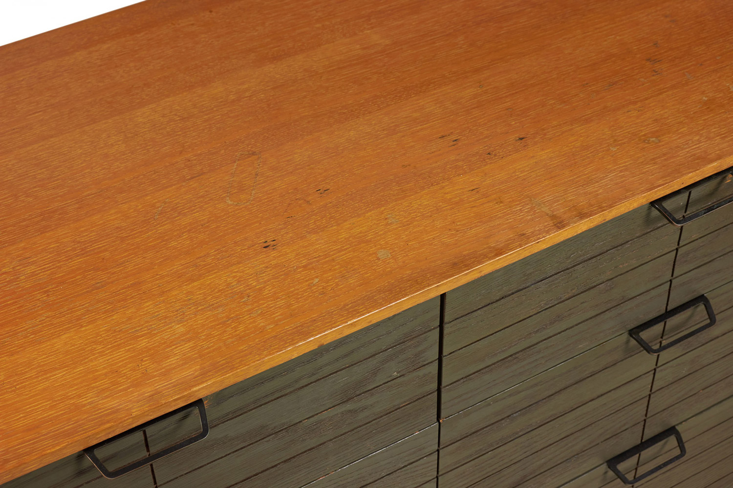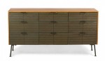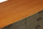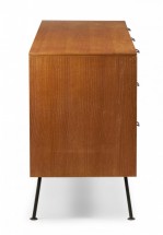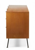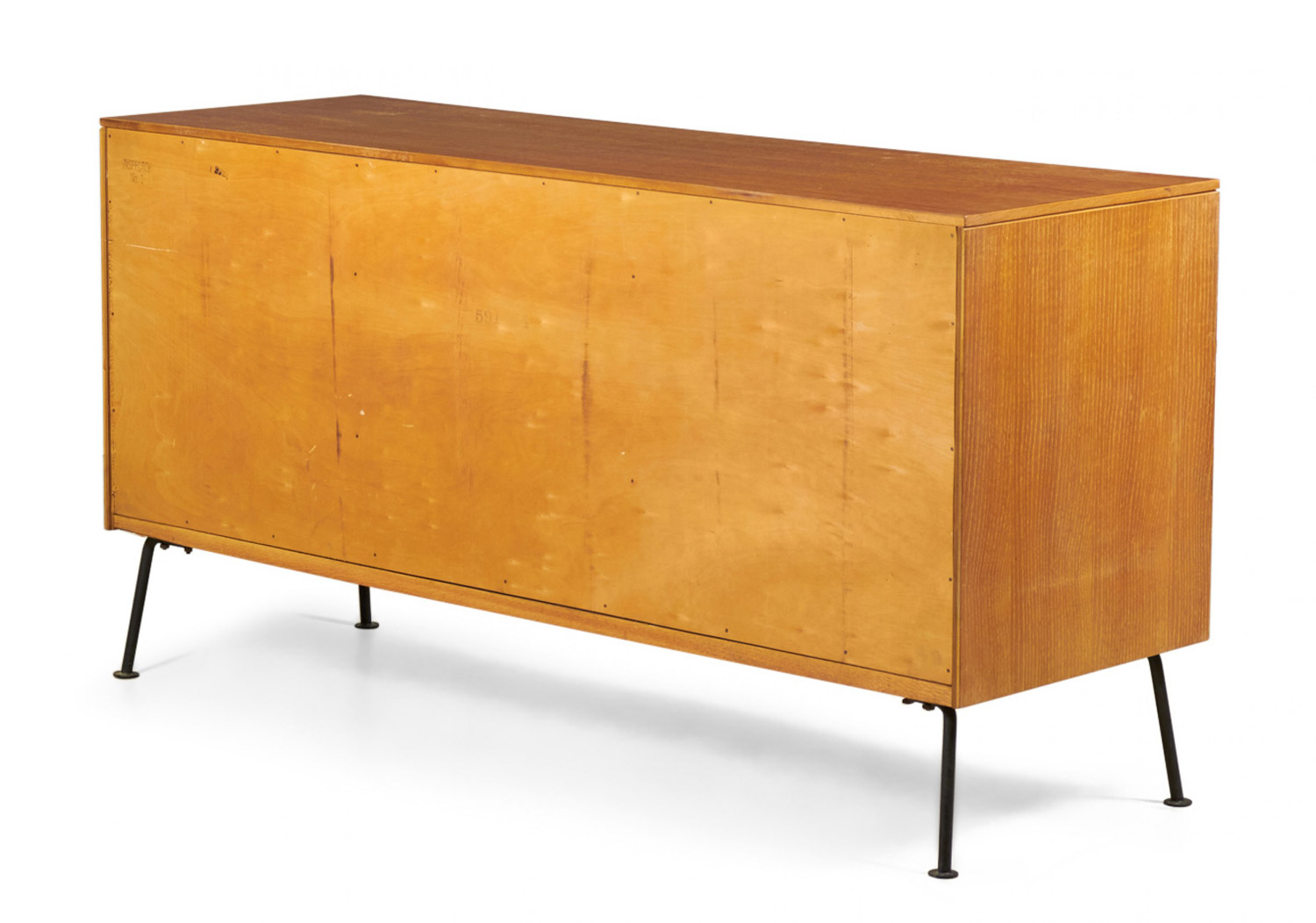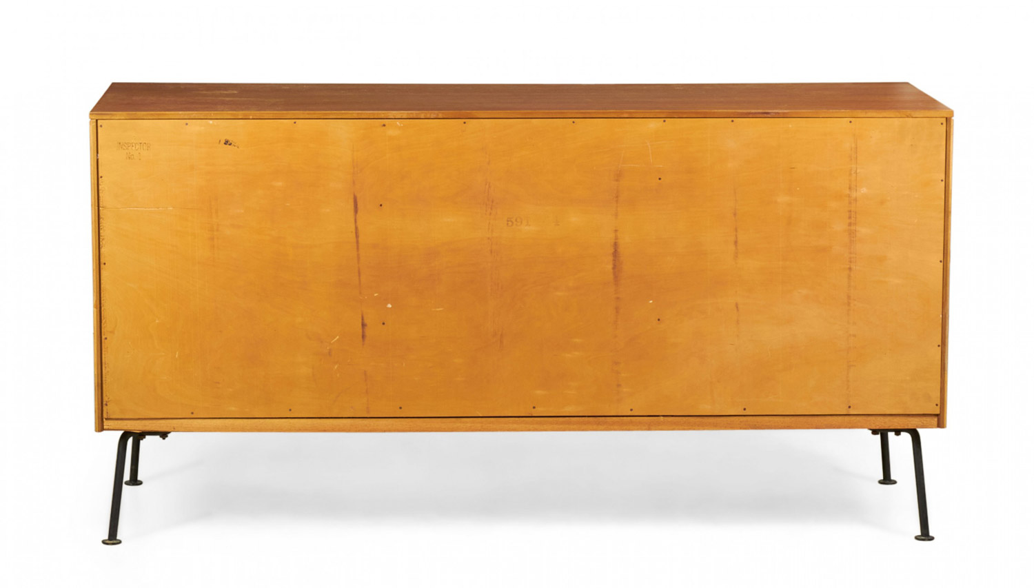 2 American Mid-Century (1950s) 9-drawer dressers with dark brown stained and geometrically incised drawer fronts with trapezoidal iron drawer pulls in a light walnut case resting on four angled iron legs ending in circular feet. (RAYMOND LOEWY FOR MENGEL FURNITURE, stamp on drawer interiors)(PRICED EACH)