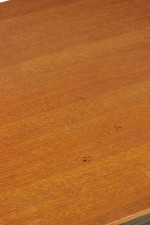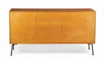 Style: Mid-Century Materials & Techniques: Incised, iron, metal, walnut, wood Category: Cabinets & Case Goods, Bedroom Condition: Finish is worn.