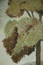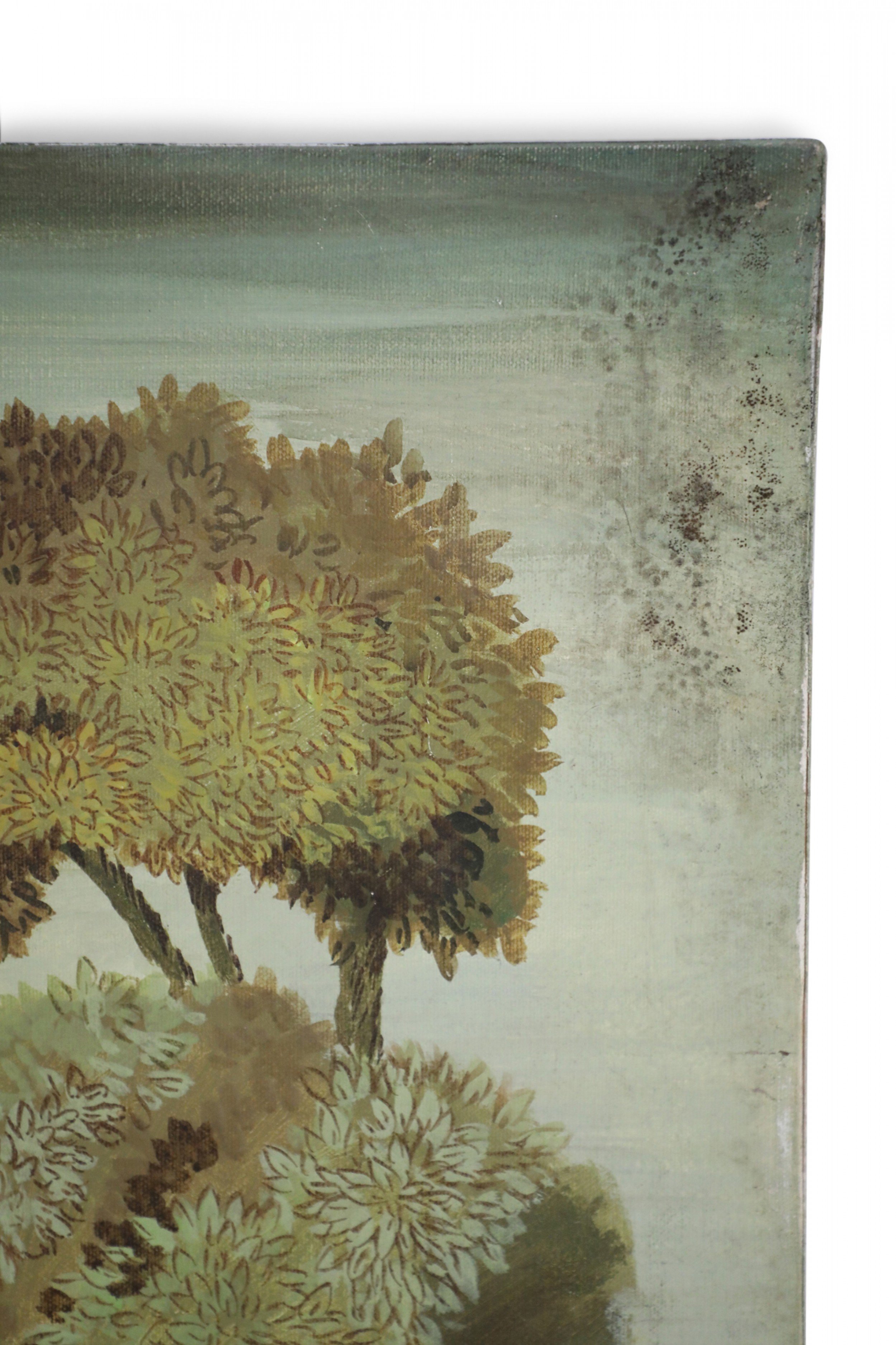 Italian Renaissance style (20th Century) portrait of a lion lying down and looking back at his tail in a field populated with lush trees, painted in a muted palette of greens and browns on rectangular unframed canvas.