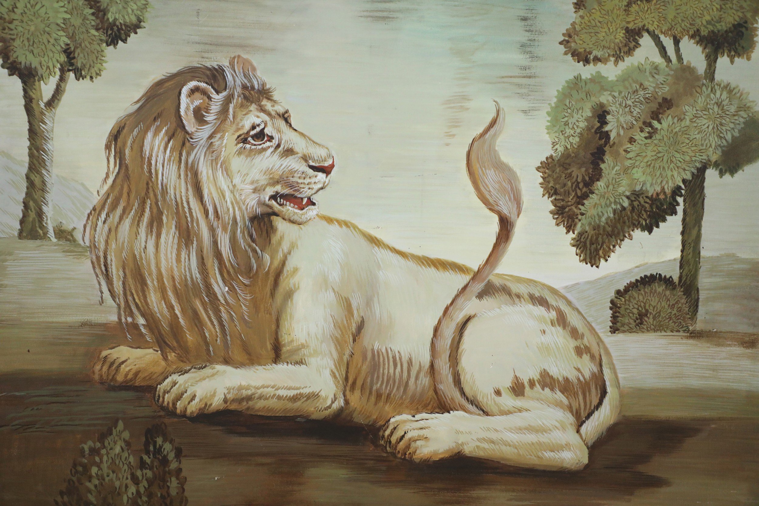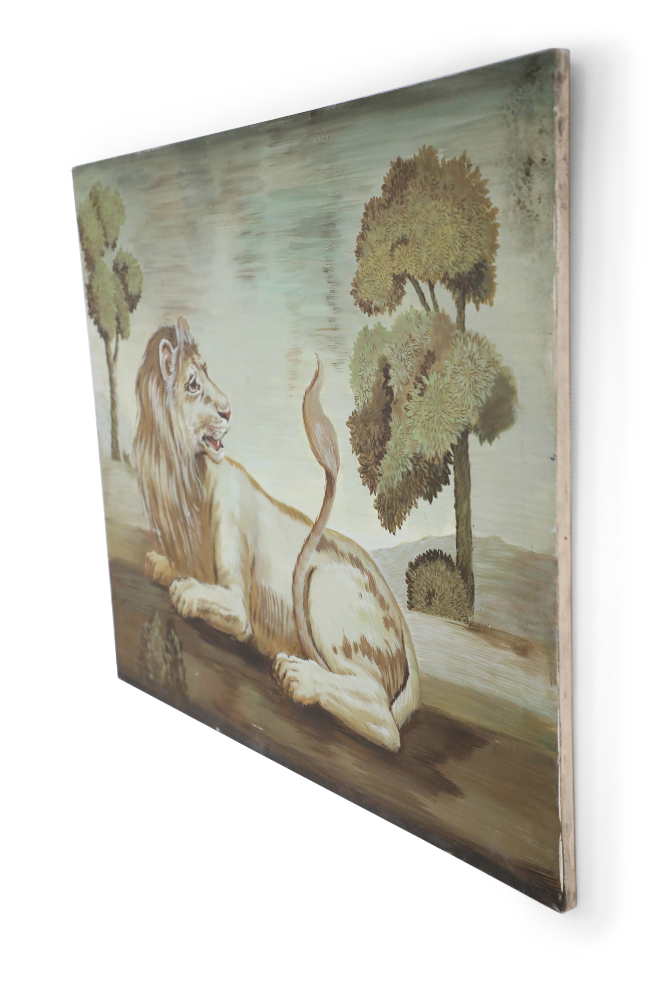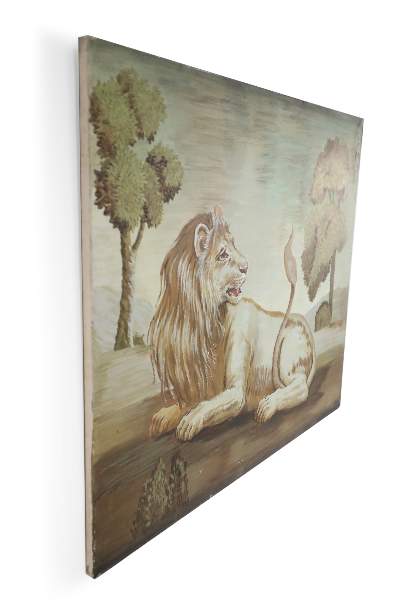 Italian Renaissance style (20th Century) portrait of a lion lying down and looking back at his tail in a field populated with lush trees, painted in a muted palette of greens and browns on rectangular unframed canvas..