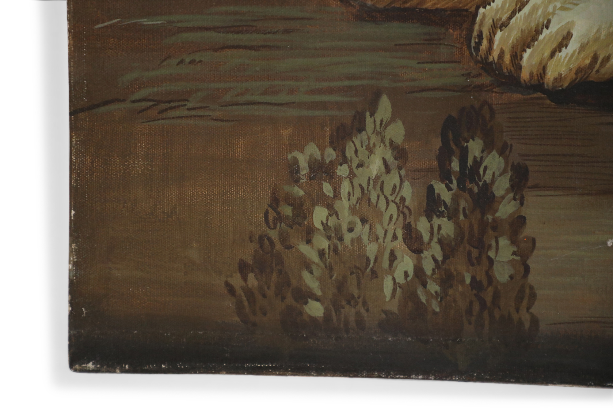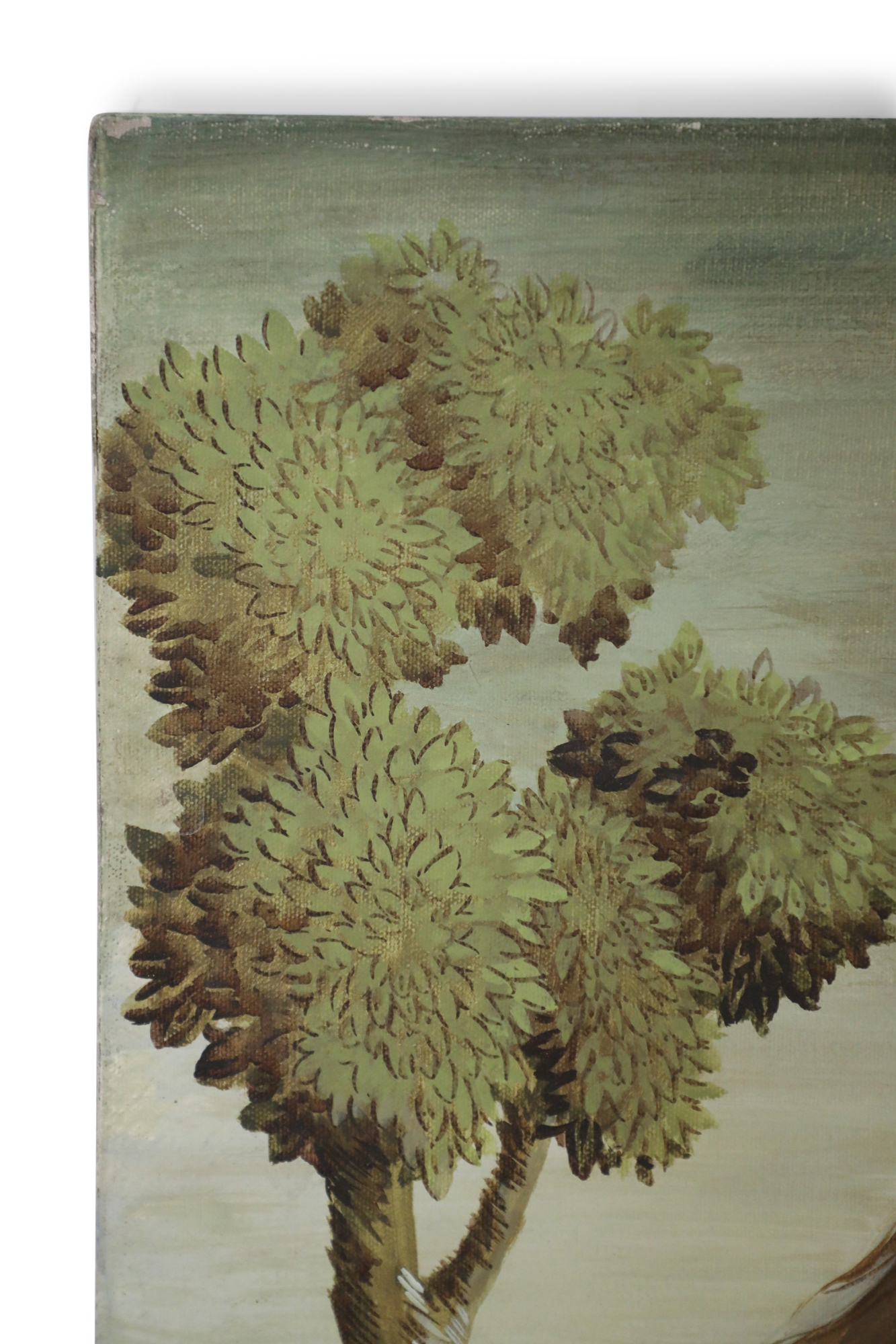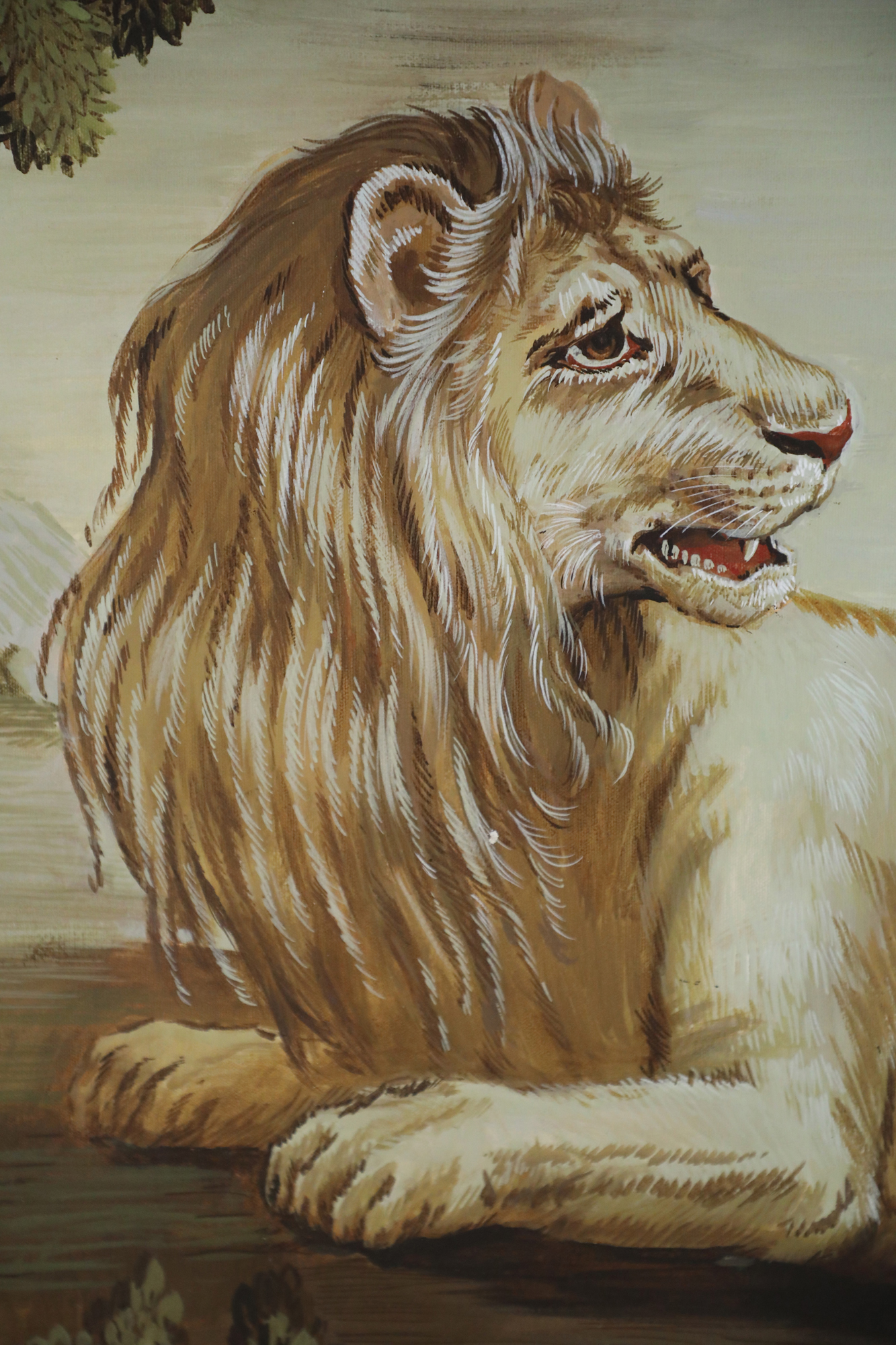 Italian Renaissance style (20th Century) portrait of a lion lying down and looking back at his tail in a field populated with lush trees, painted in a muted palette of greens and browns on rectangular unframed canvas..