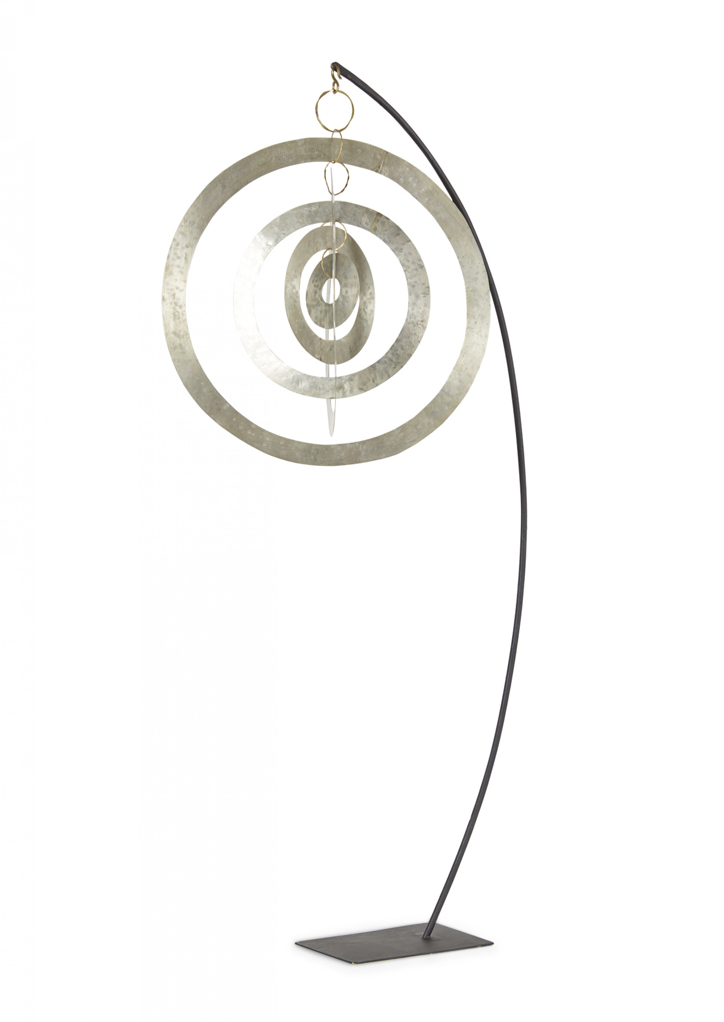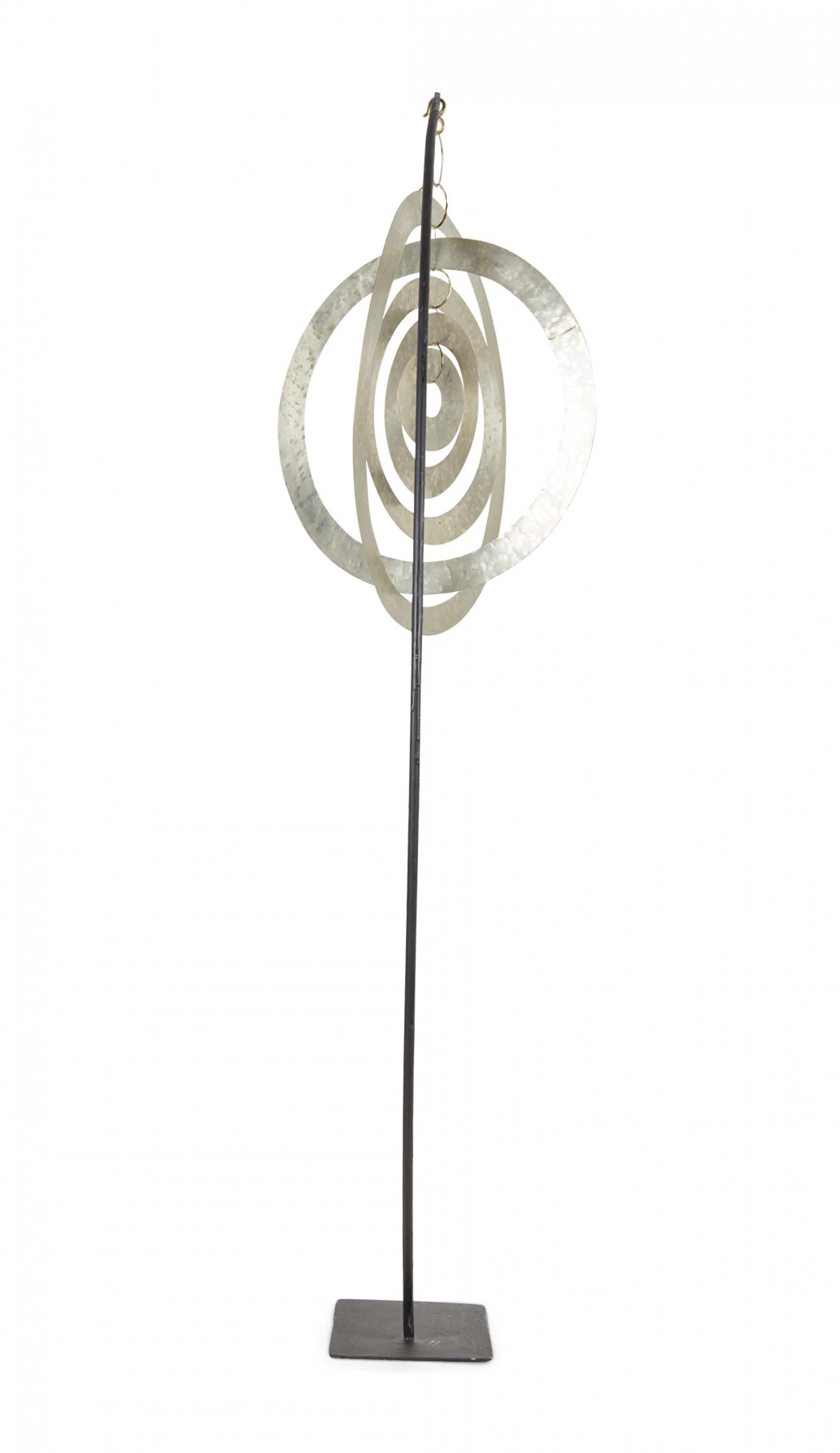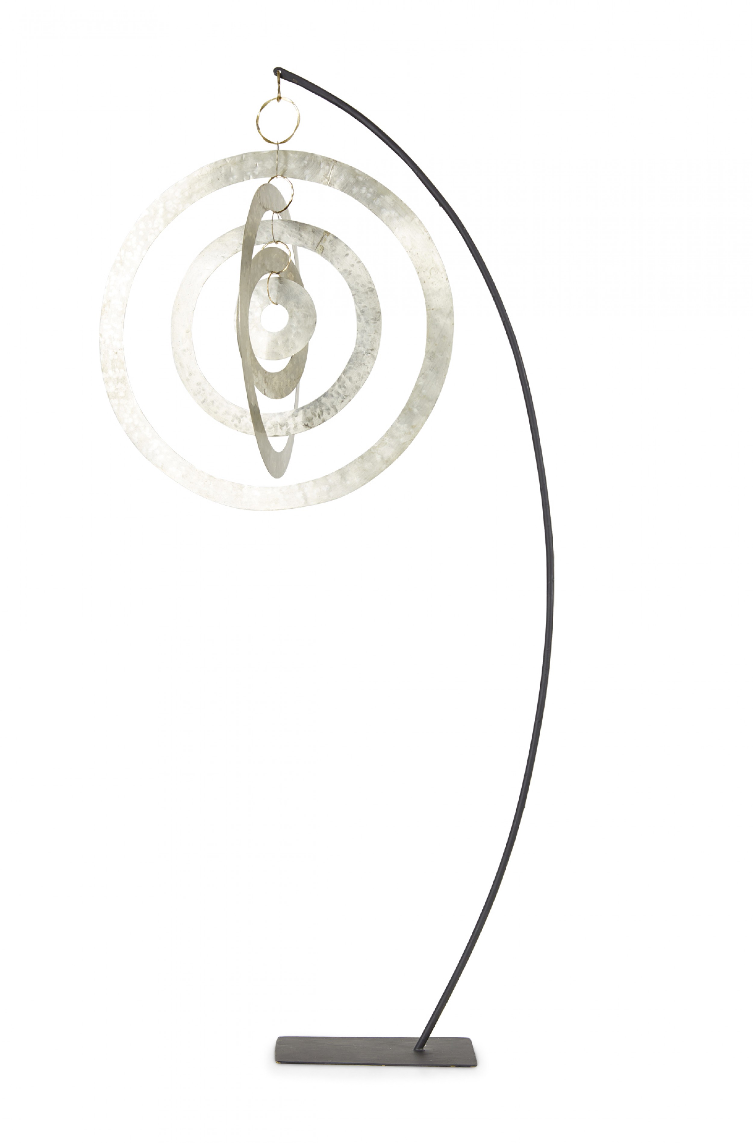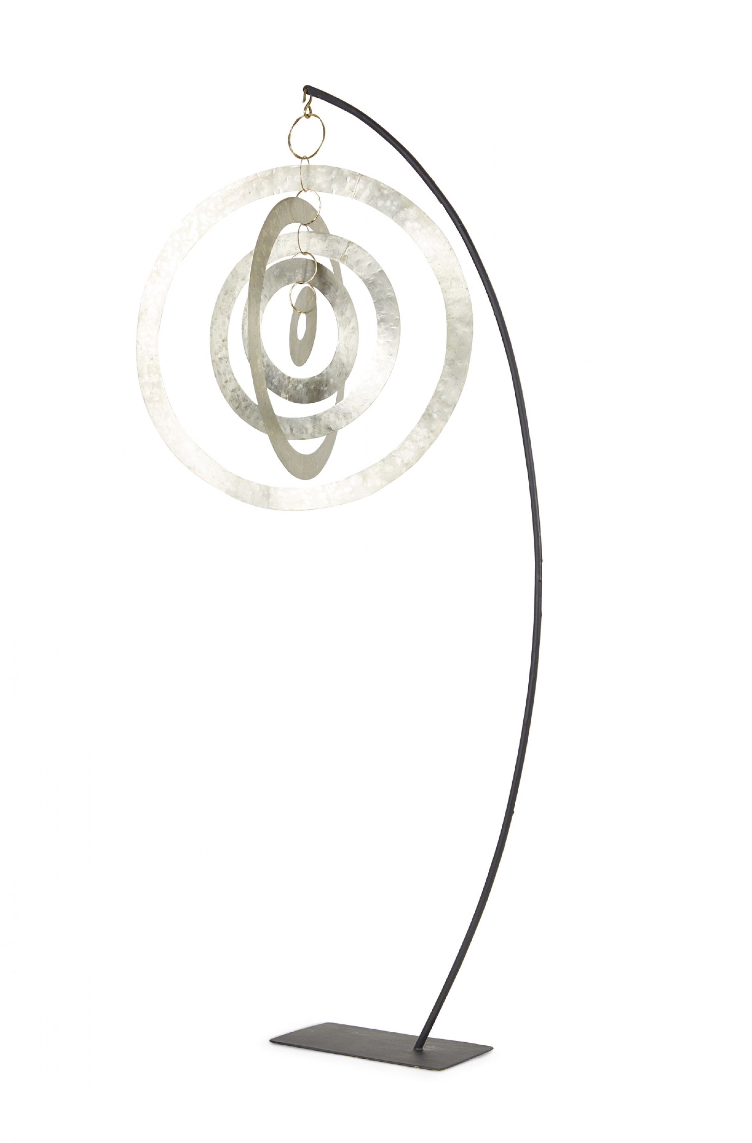 Contemporary sculpture /mobile featuring concentric hammered nickel circles and ovals suspended on a curved black metal stand titled, "Nickel Orbit Mobile," (signed, ROBERT LEE MORRIS, 2018).