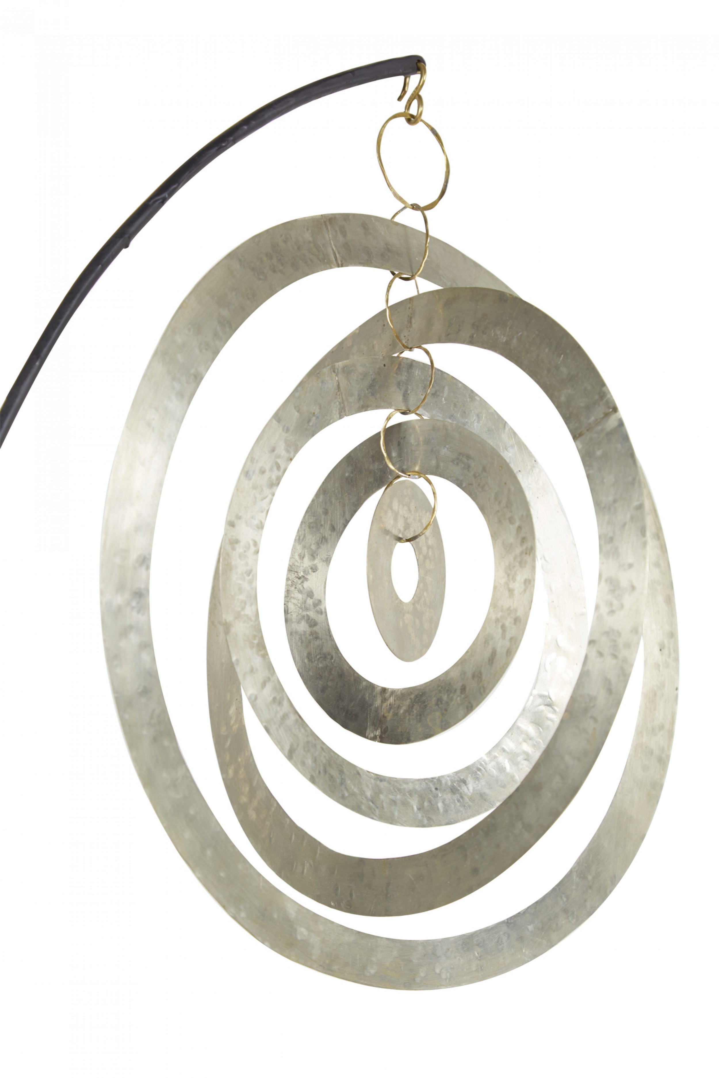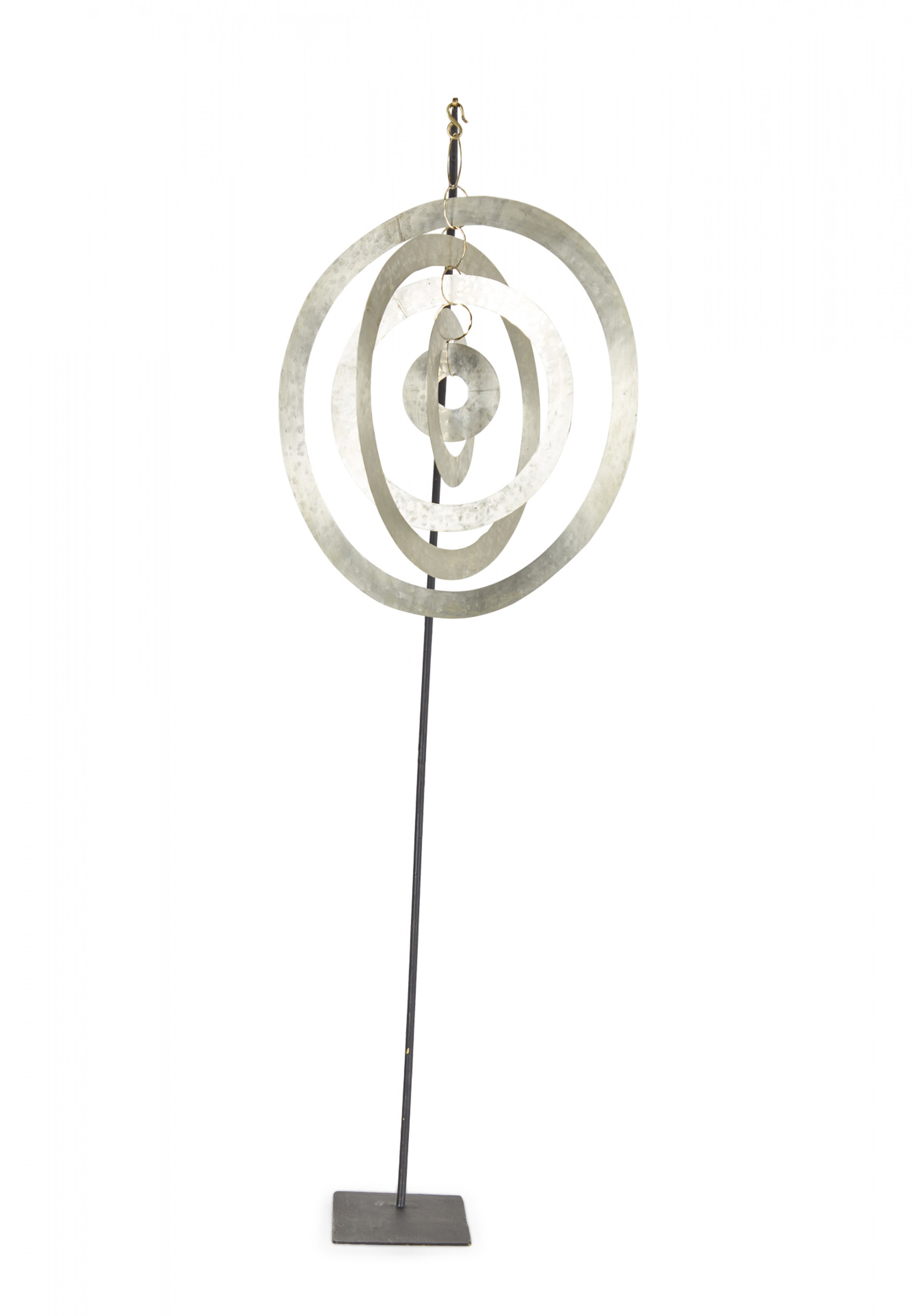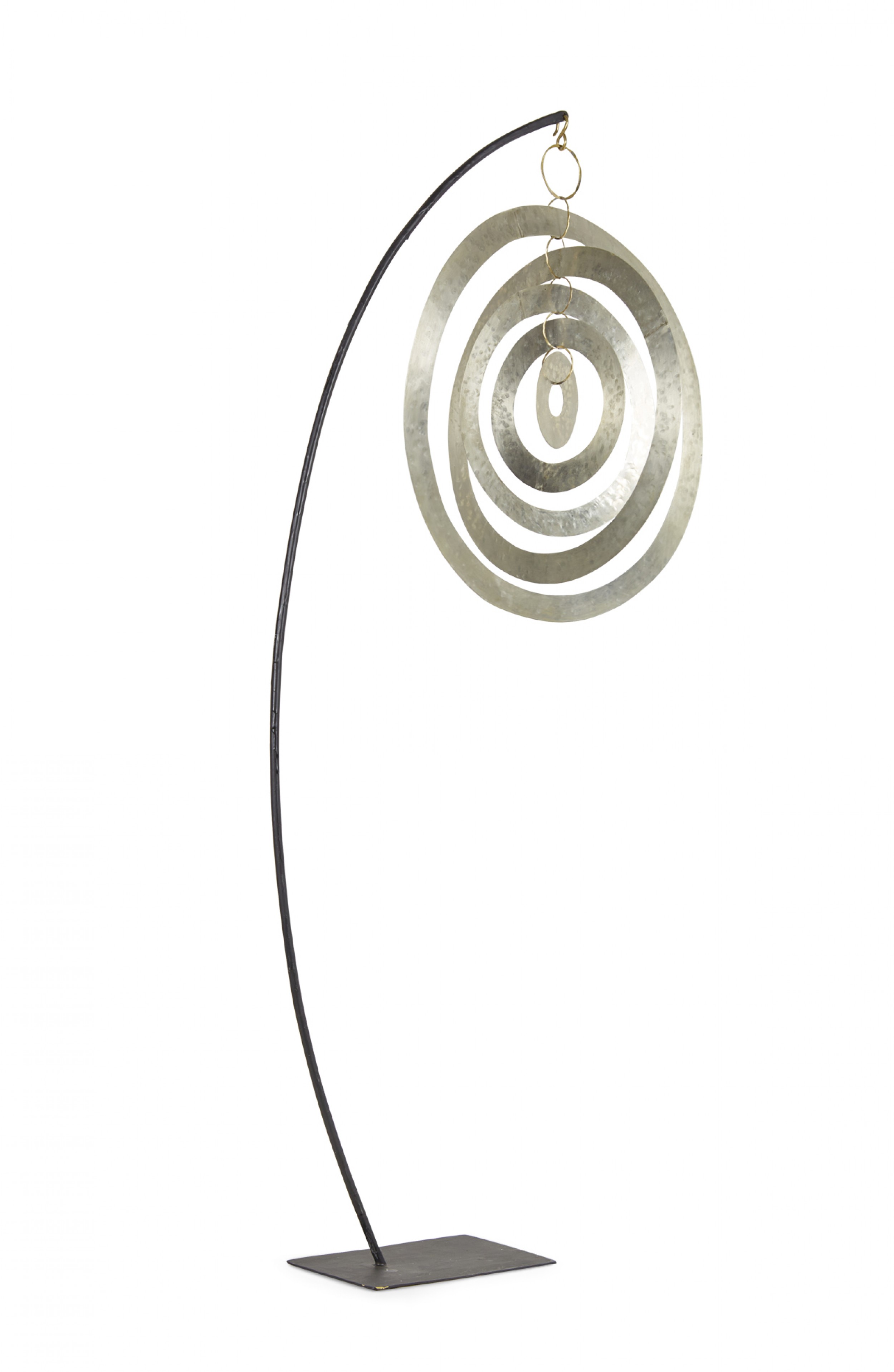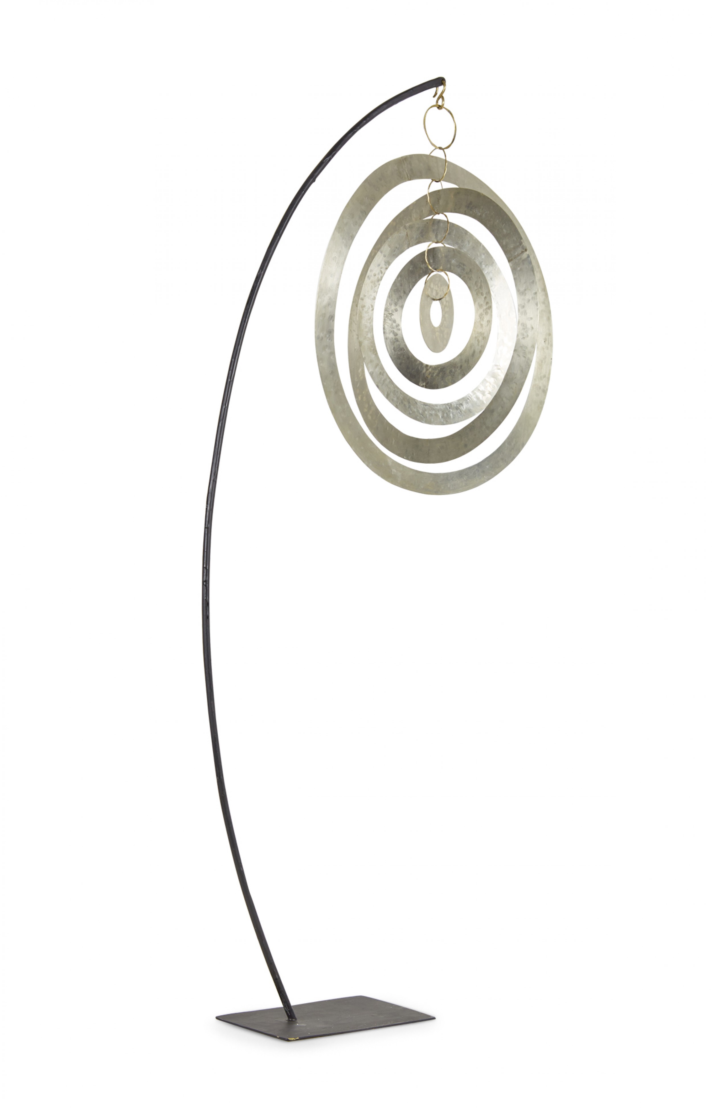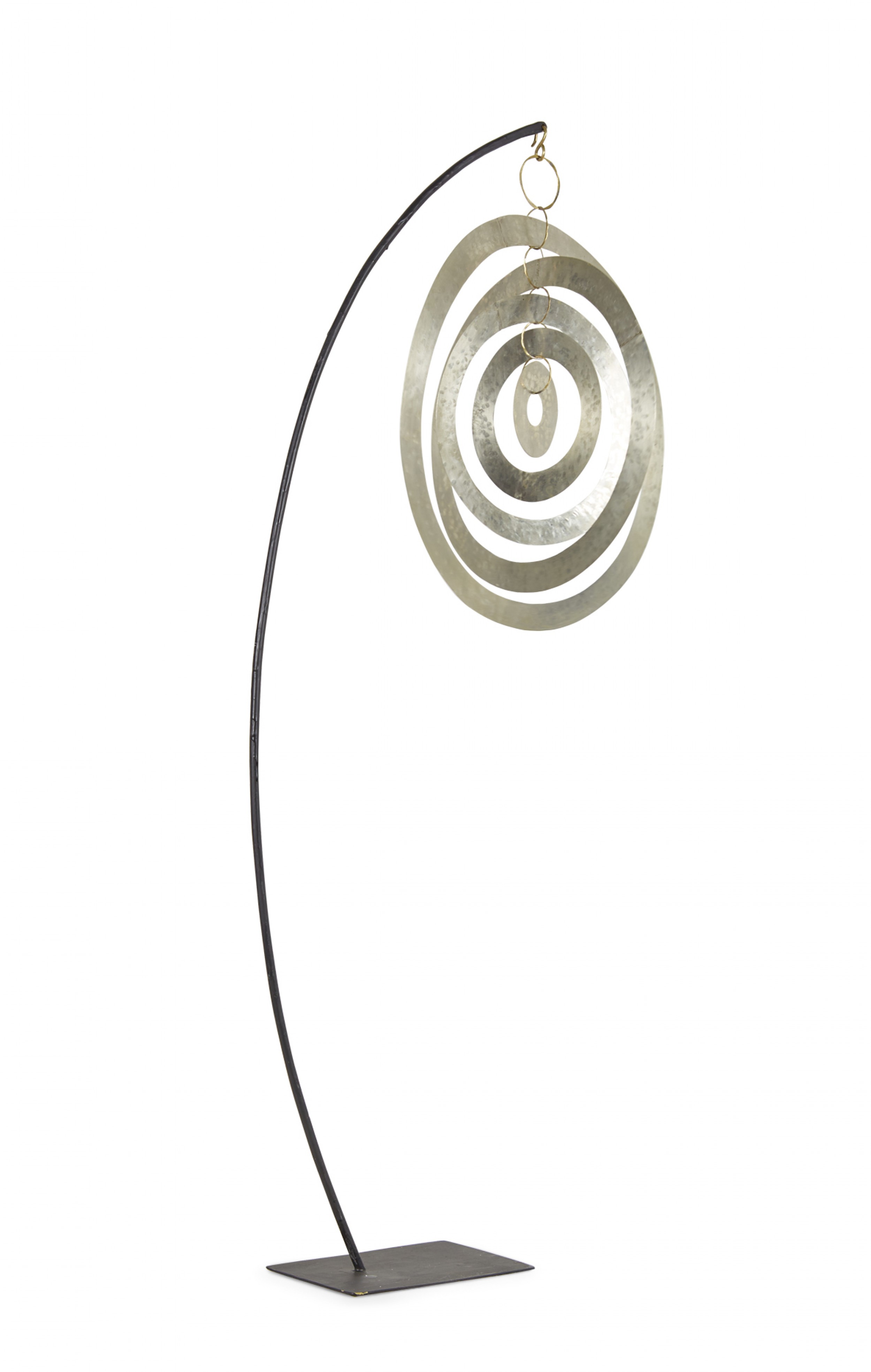 Contemporary sculpture /mobile featuring concentric hammered nickel circles and ovals suspended on a curved black metal stand titled, "Nickel Orbit Mobile," (signed, ROBERT LEE MORRIS, 2018).