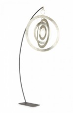 Contemporary sculpture /mobile featuring concentric hammered nickel circles and ovals suspended on a curved black metal stand titled, "Nickel Orbit Mobile," (signed, ROBERT LEE MORRIS, 2018)