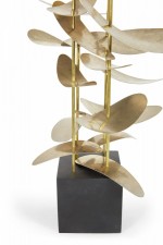Contemporary abstract sculpture comprised of curved and hammered nickel and brass pieces stacked vertically on four brass rods, mounted on black painted wooden base, titled, "Quadruple Vines" (signed, ROBERT LEE MORRIS, 2018).