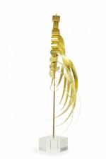 Contemporary abstract sculpture comprised of brass "feathers" arranged on a brass rod to resemble a rooster's tail, mounted on a lucite base, titled, "Rooster Tail" (signed, ROBERT LEE MORRIS, 2018).