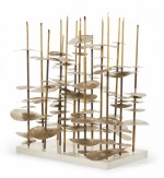 Contemporary abstract sculpture comprised of a various sizes of oval nickel pieces stacked on brass rods mounted on a rectangular lucite base titled, "Vertical Cityscape" (signed, ROBERT LEE MORRIS, 2018)