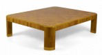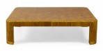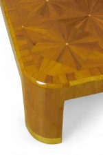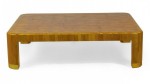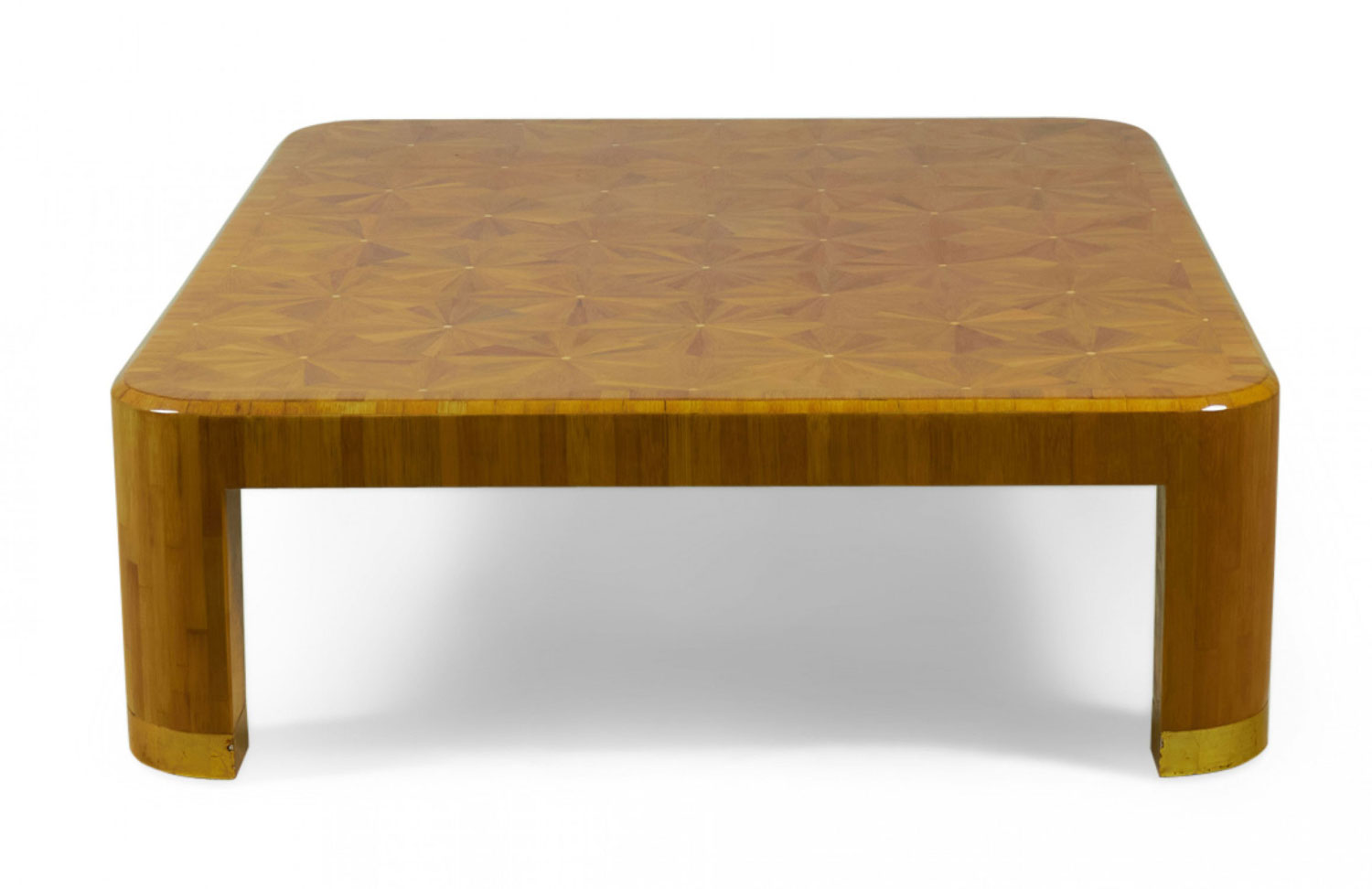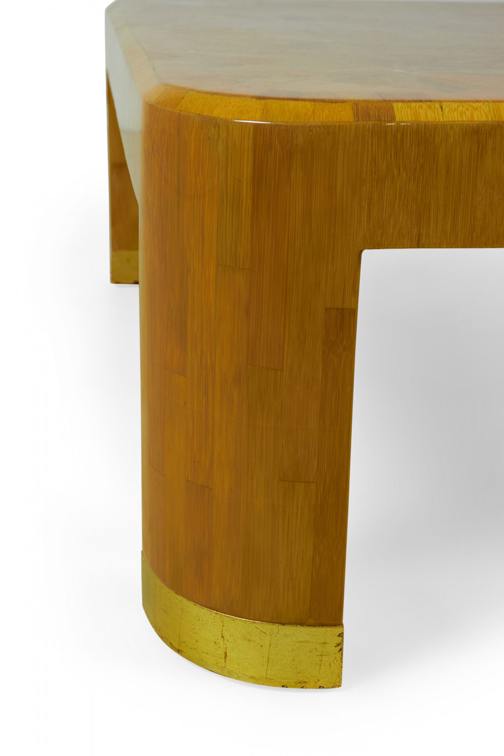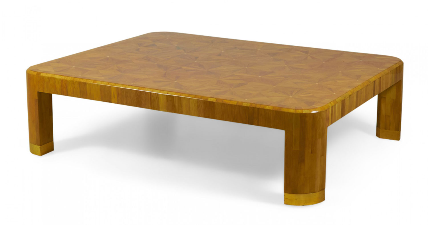 American High Style (circa 1980s) rectangular coffee table with a straw (raffia wood) veneer marquetry top in a starburst pattern having a high gloss lacquer finish, resting on curved straw veneer legs ending in gilt trim. (RON SEFF).