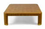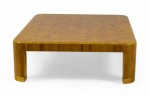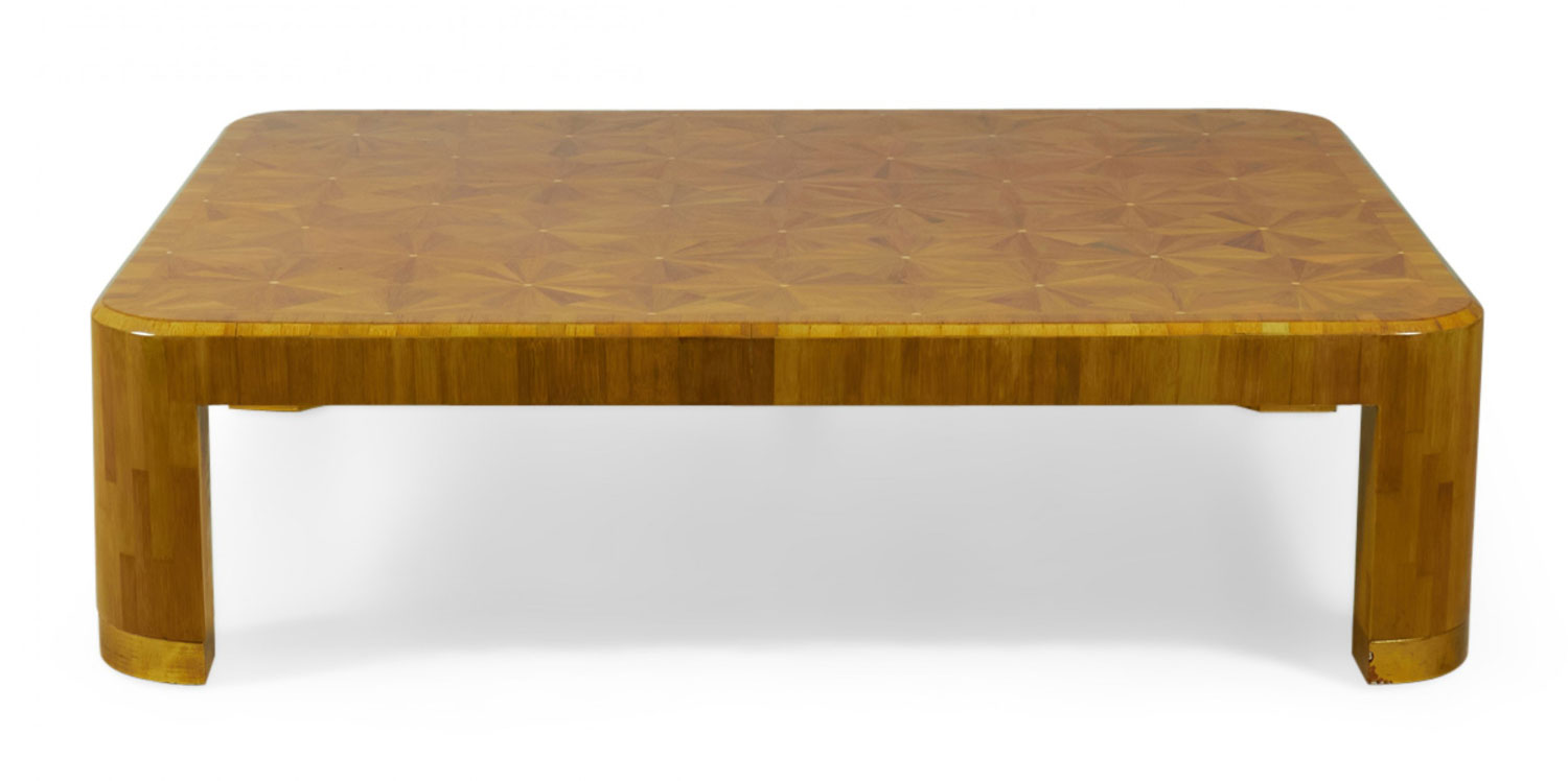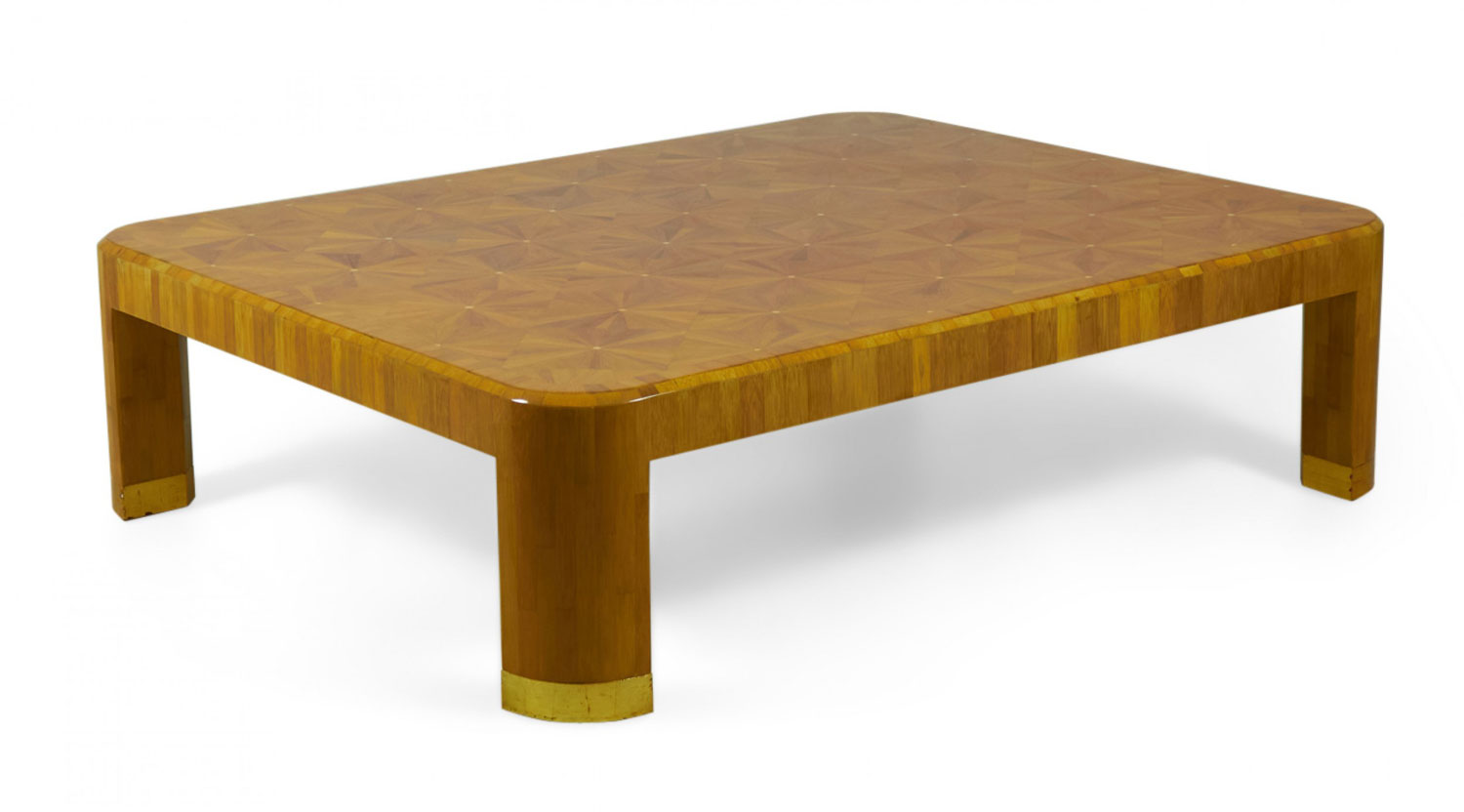 American High Style (circa 1980s) rectangular coffee table with a straw (raffia wood) veneer marquetry top in a starburst pattern having a high gloss lacquer finish, resting on curved straw veneer legs ending in gilt trim. (RON SEFF)