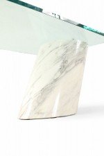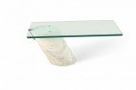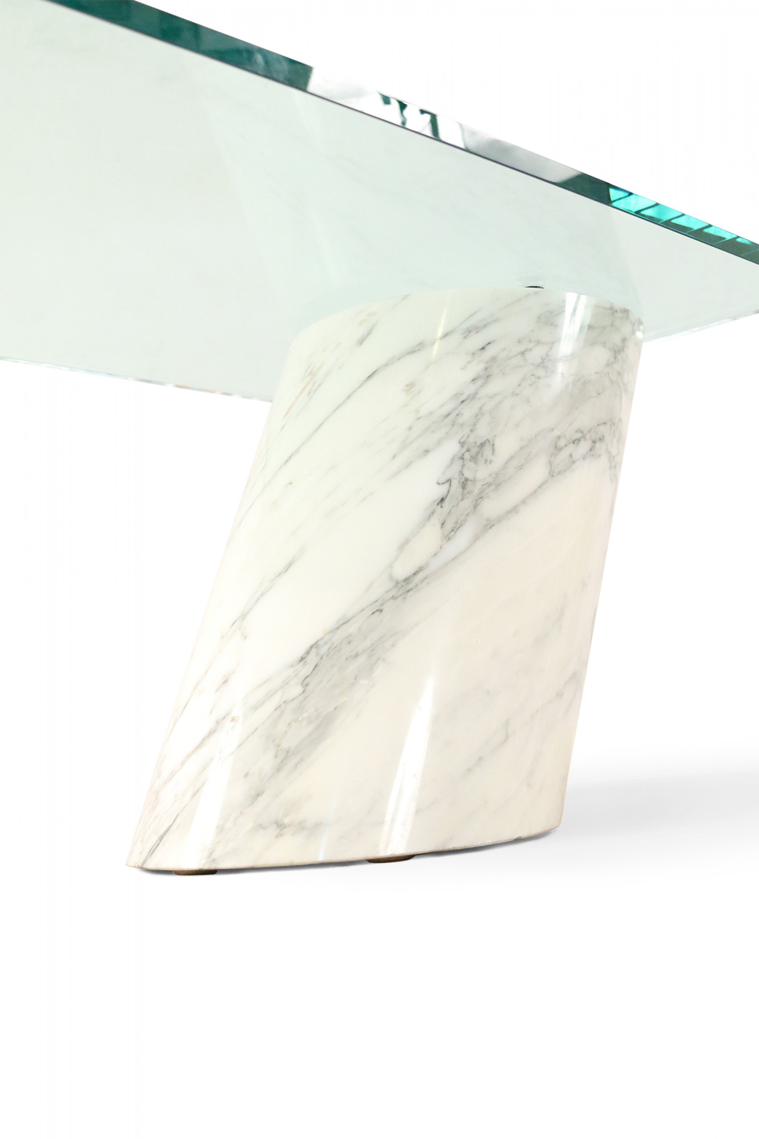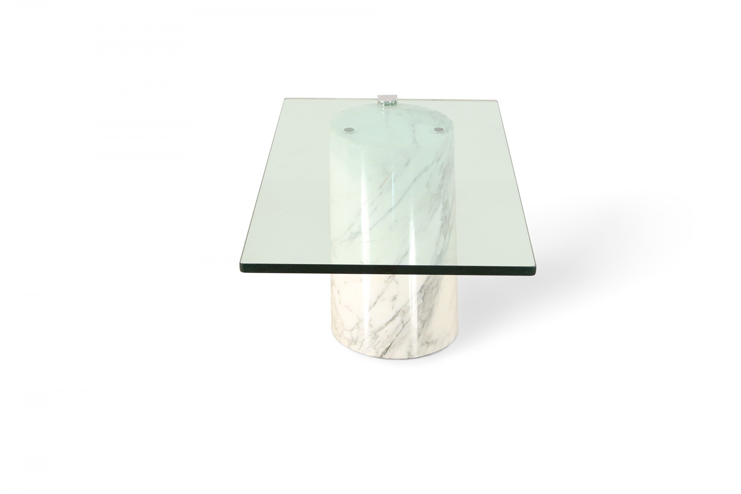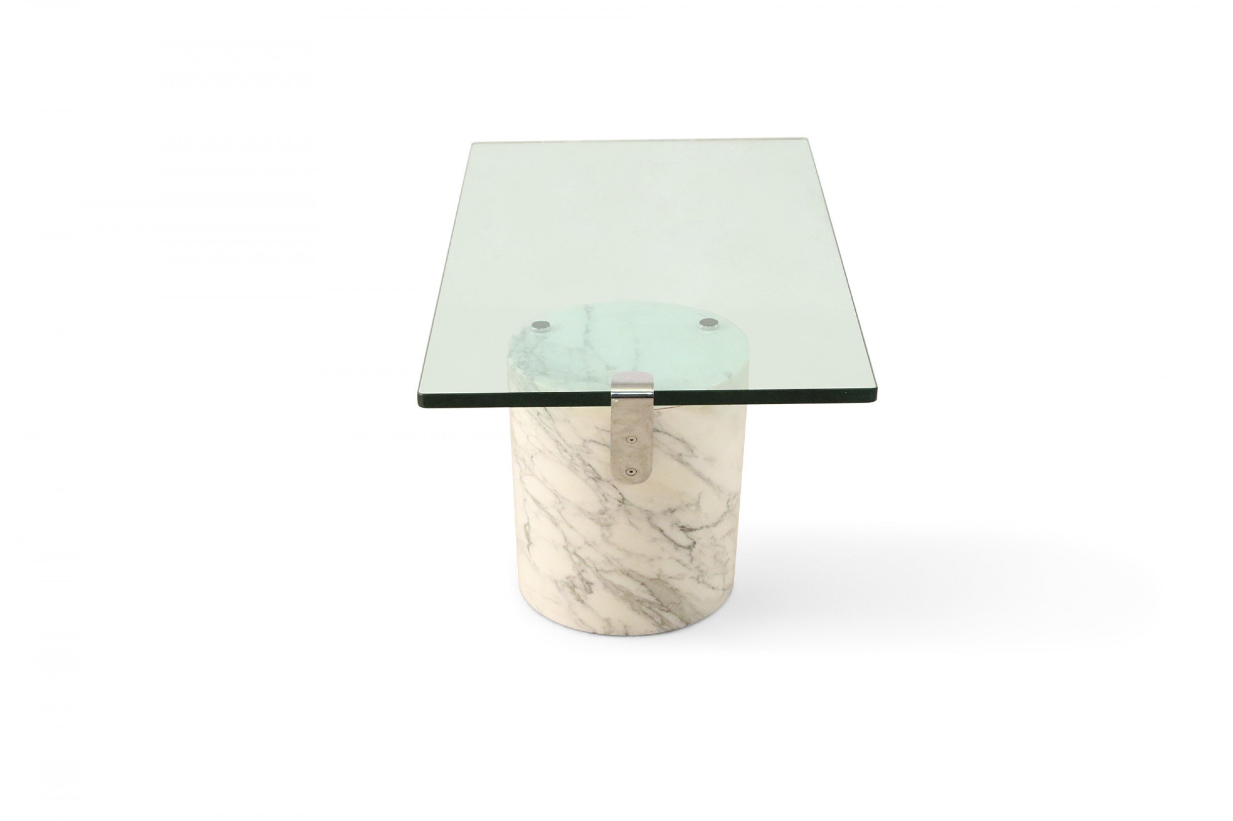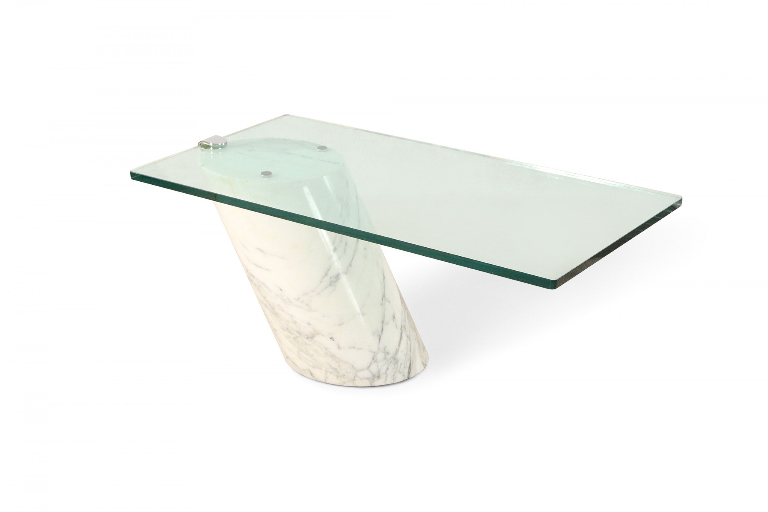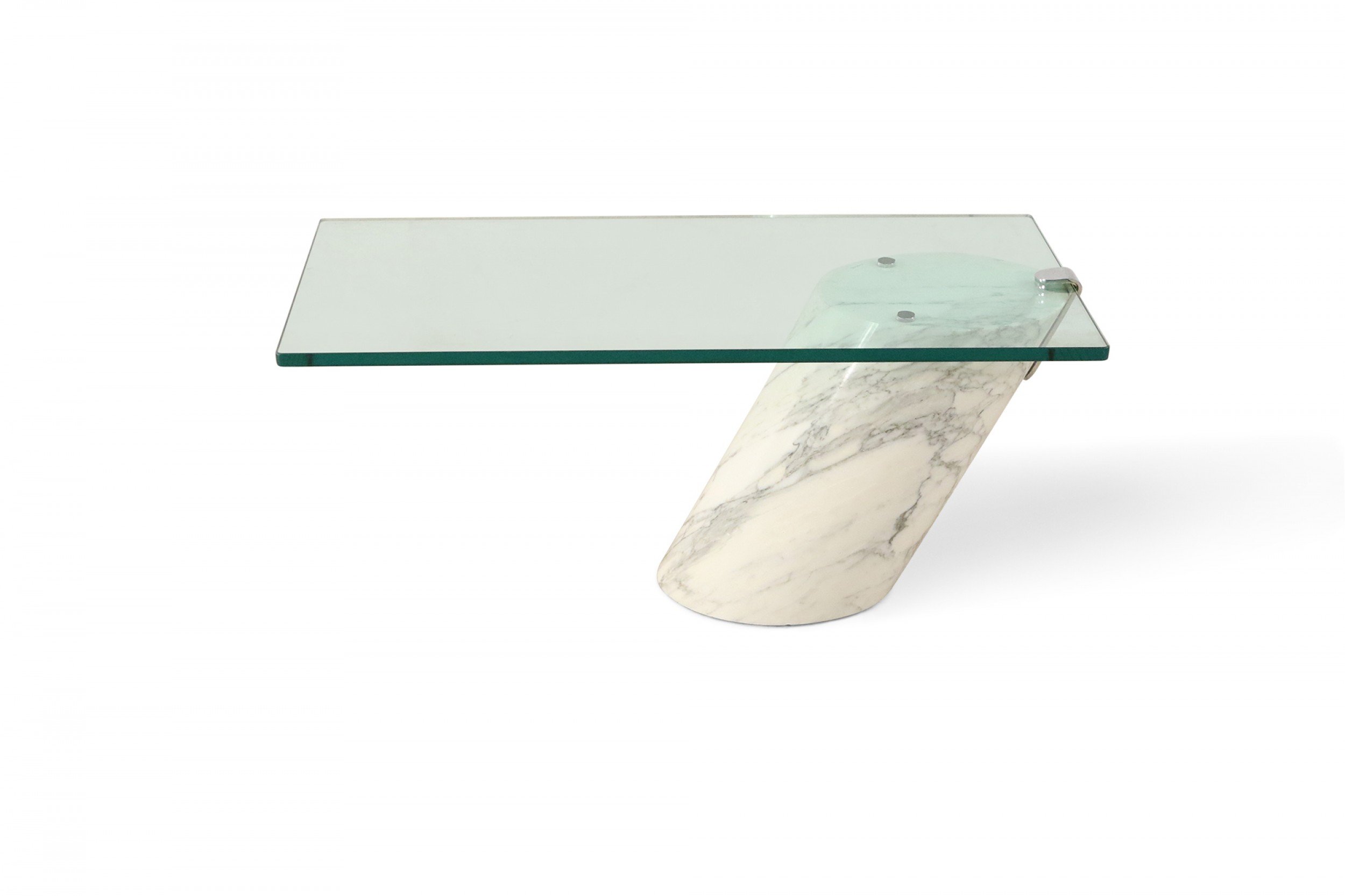 Mid-Century Modern German coffee table with angled cylindrical white Carrara marble base and floating rectangular glass tabletop with silver mount. (RONALD SCHMITT FOR BRUETON).