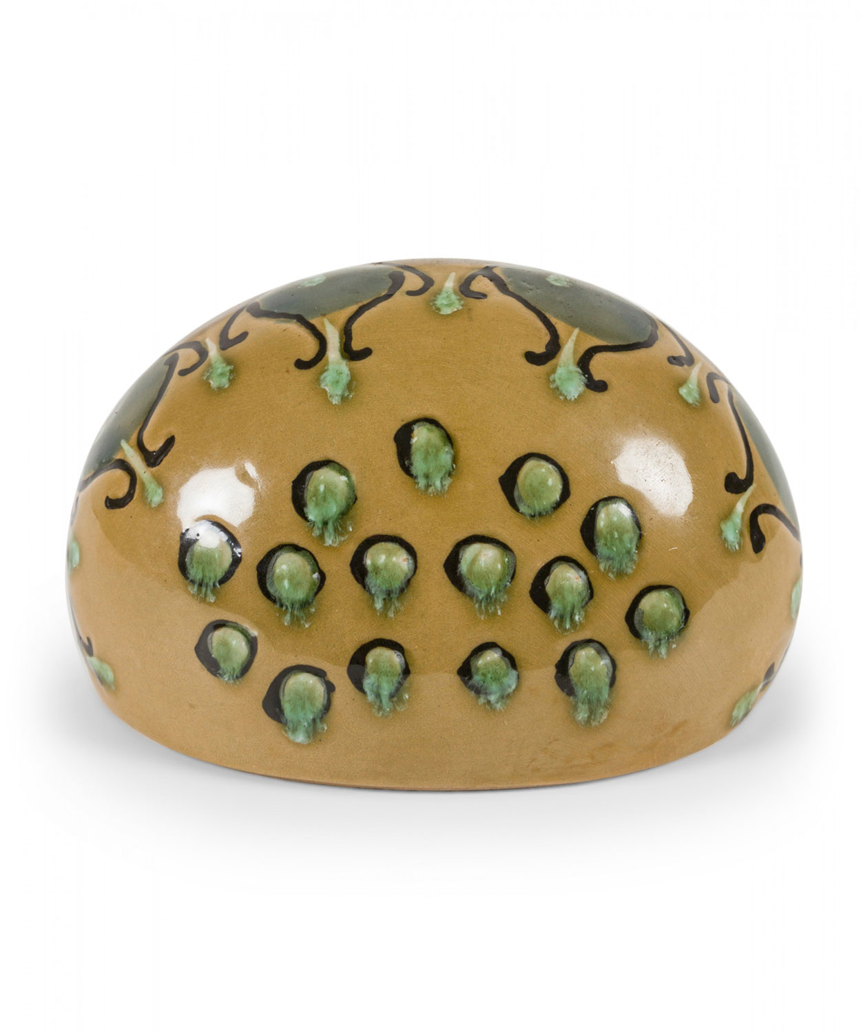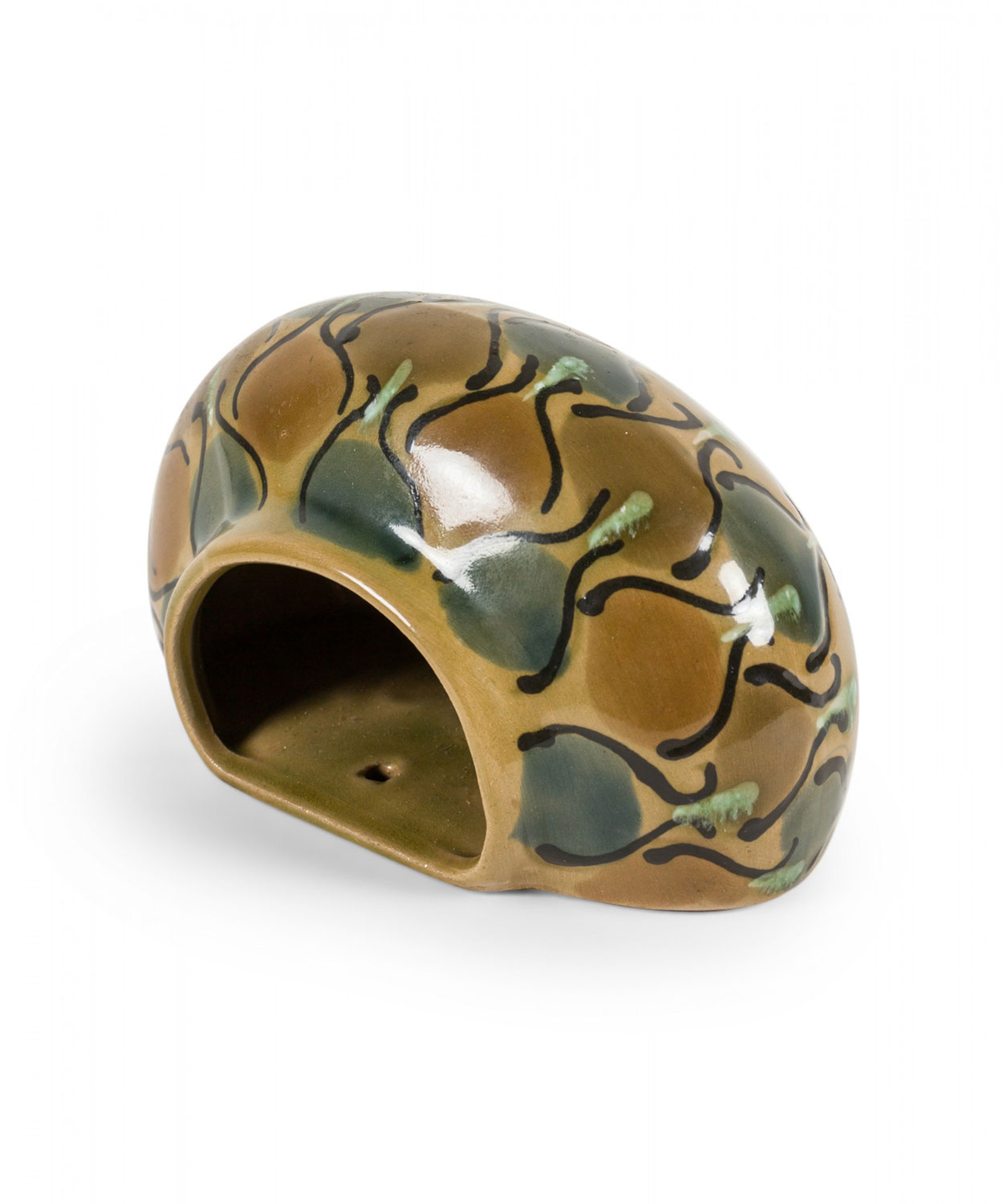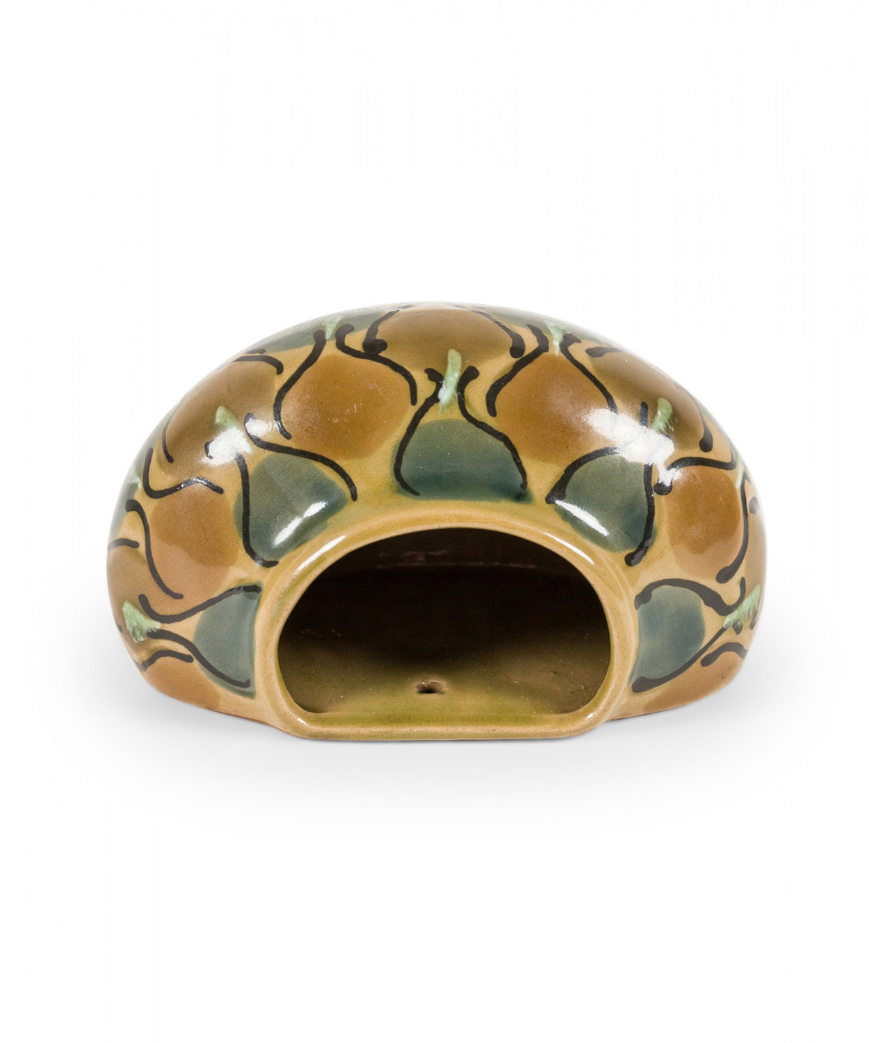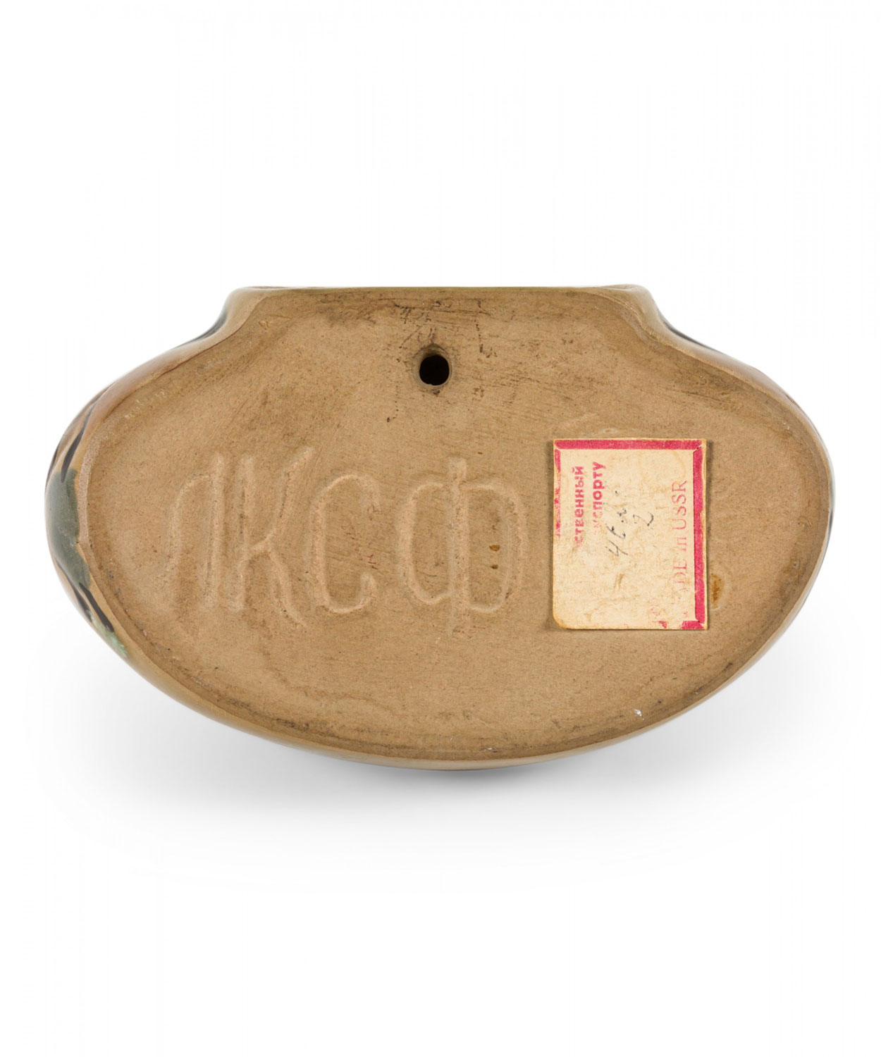 Russian Mid-Century wall mounted ceramic vase with a geometric green and black pattern over a brown glazed ground. (Stamp on back, see photos).