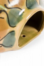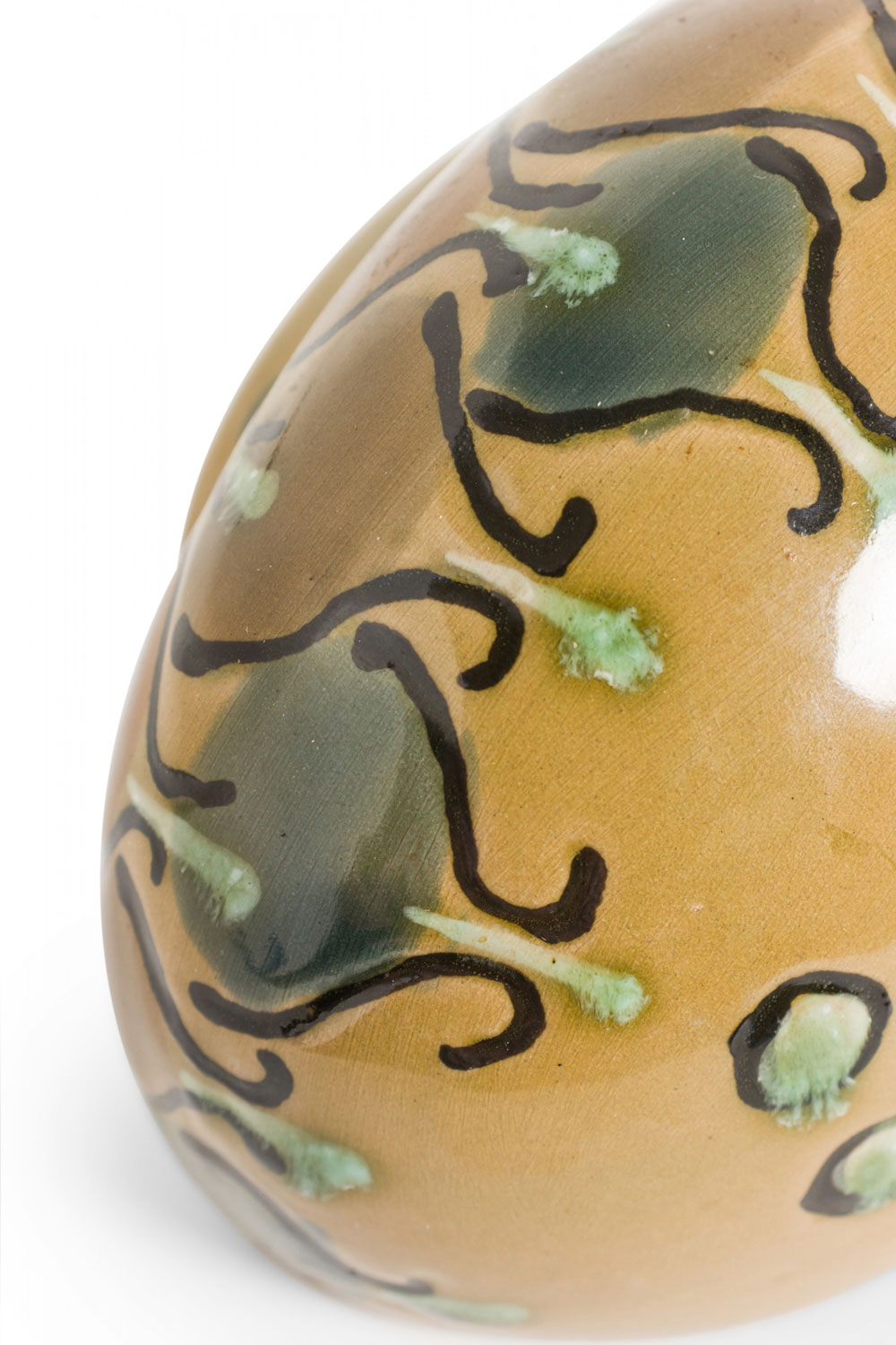 Russian Mid-Century wall mounted ceramic vase with a geometric green and black pattern over a brown glazed ground. (Stamp on back, see photos)