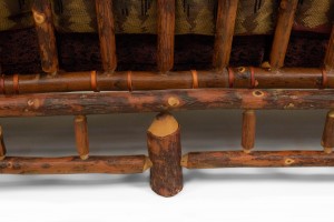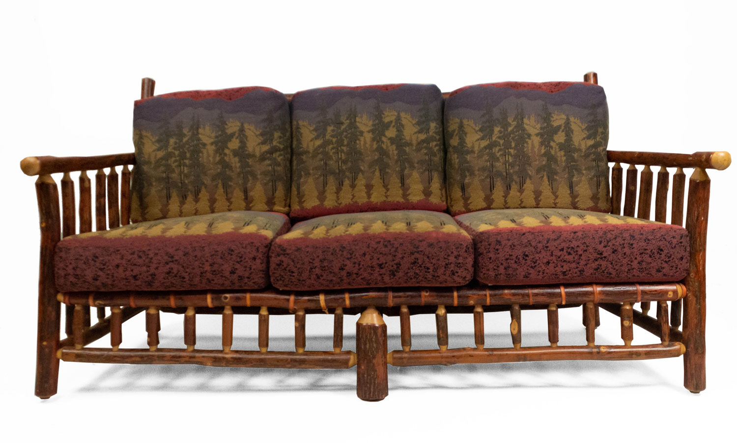 Rustic Old Hickory style (20th Cent) sofa / settee with spindle design sides, back, & base with 6 forest print upholstered cushions (brass Old Hickory tag).