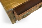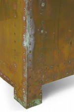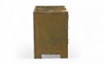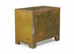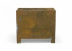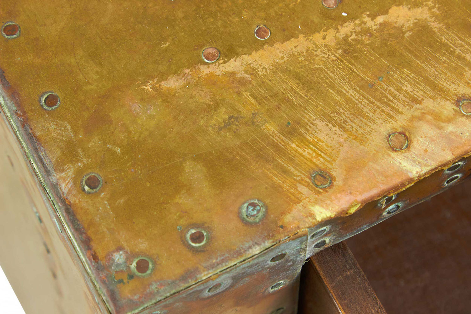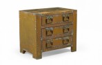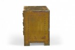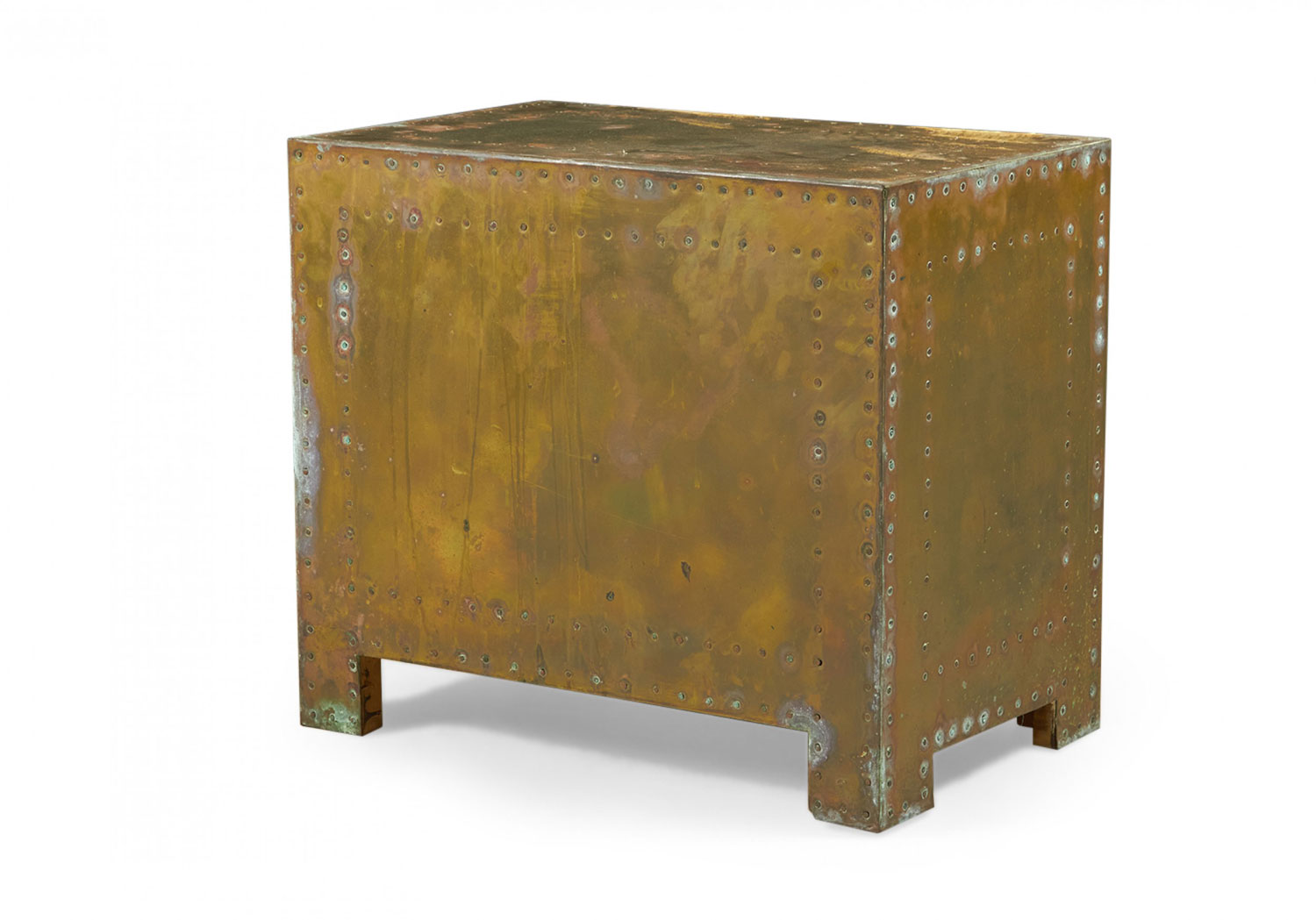 Spanish High Style 'Strongbox' bedside table / commode with brass-clad exterior with natural patina, copper studs, and three drawers with rectangular brass pulls. (SARREID, LTD.) (Similar pieces available with different patinas: DUF0025B-D, similar occasional tables: DUF0026A-F).