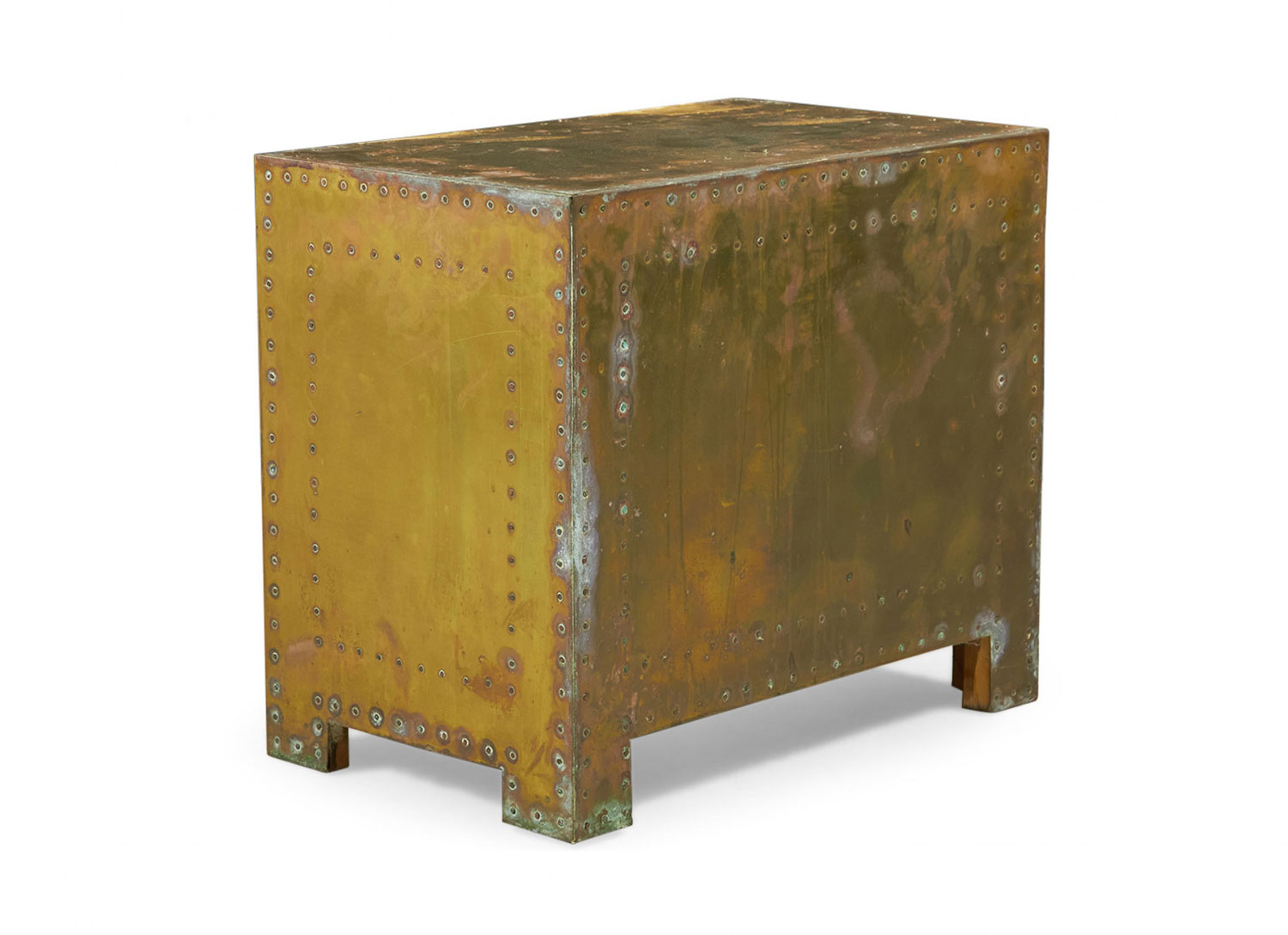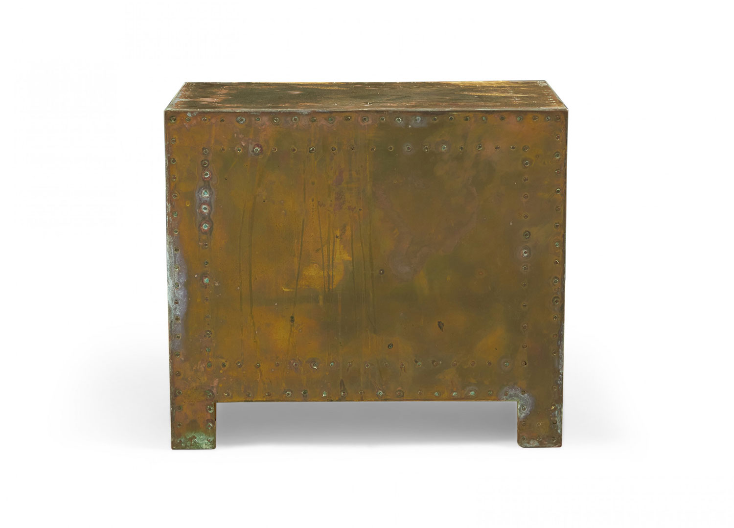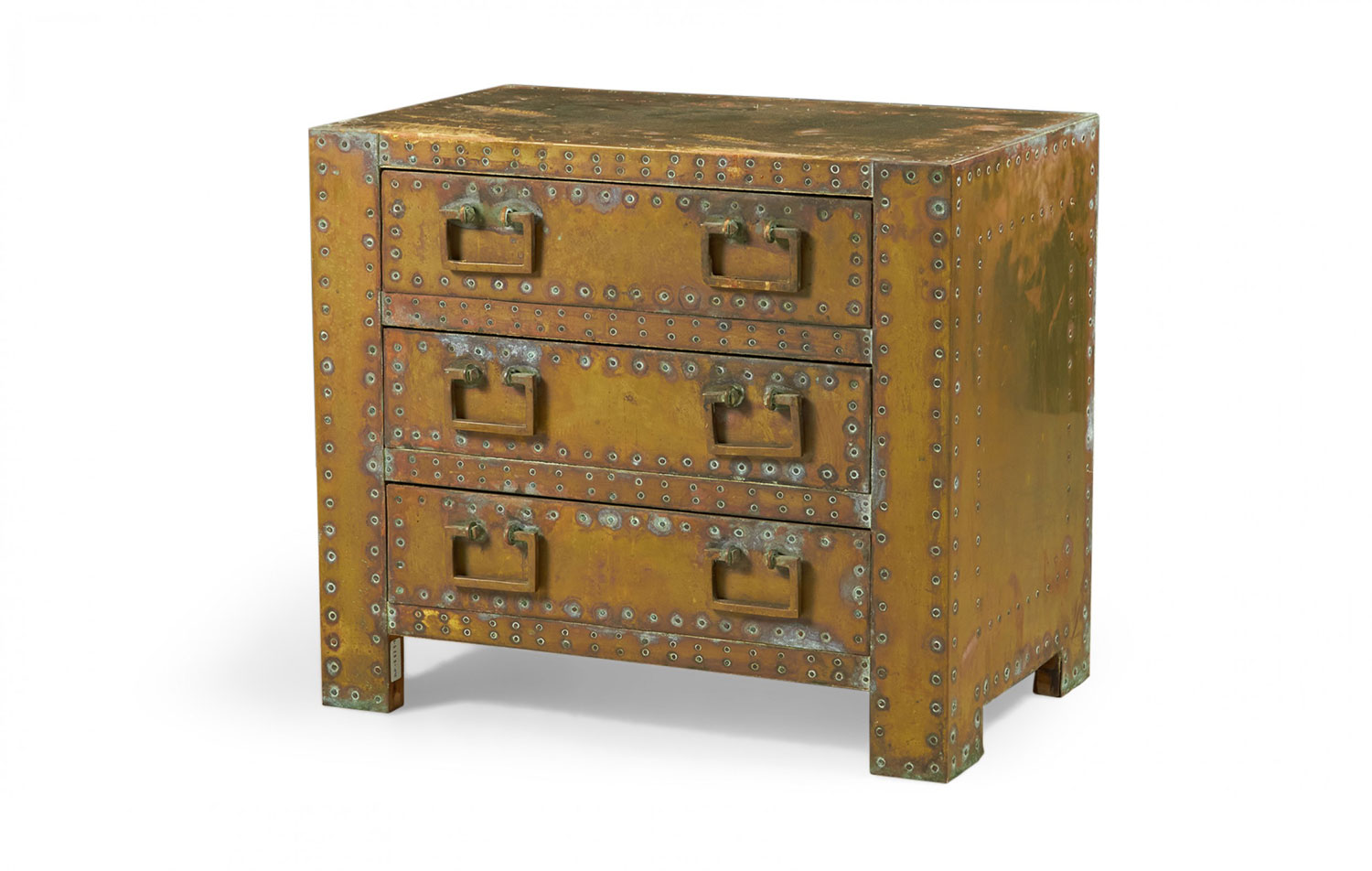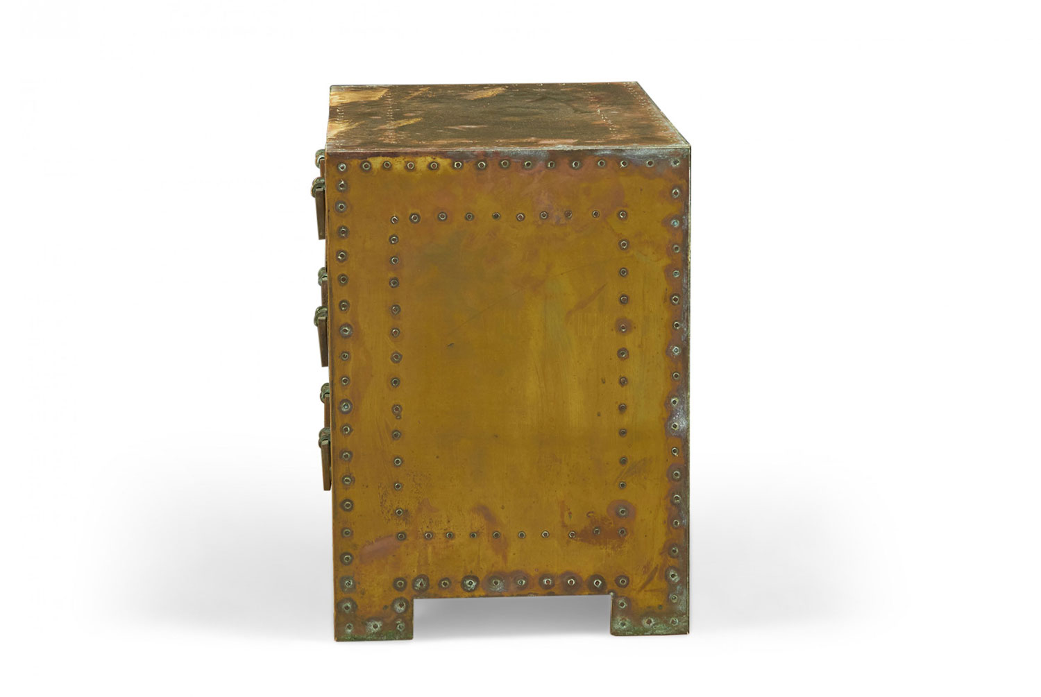 Spanish High Style 'Strongbox' bedside table / commode with brass-clad exterior with natural patina, copper studs, and three drawers with rectangular brass pulls. (SARREID, LTD.) (Similar pieces available with different patinas: DUF0025B-D, similar occasional tables: DUF0026A-F)