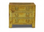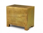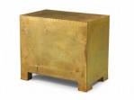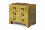 Spanish High Style 'Strongbox' bedside table / commode with brass-clad exterior with natural patina, copper studs, and three drawers with rectangular brass pulls. (SARREID, LTD.)(Similar pieces available with different patinas: DUF0025A-D, similar occasional tables: DUF0026A-F).