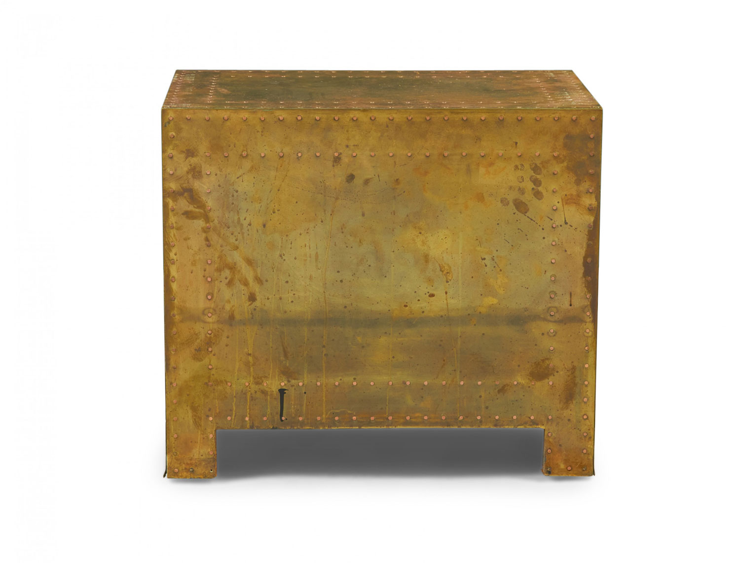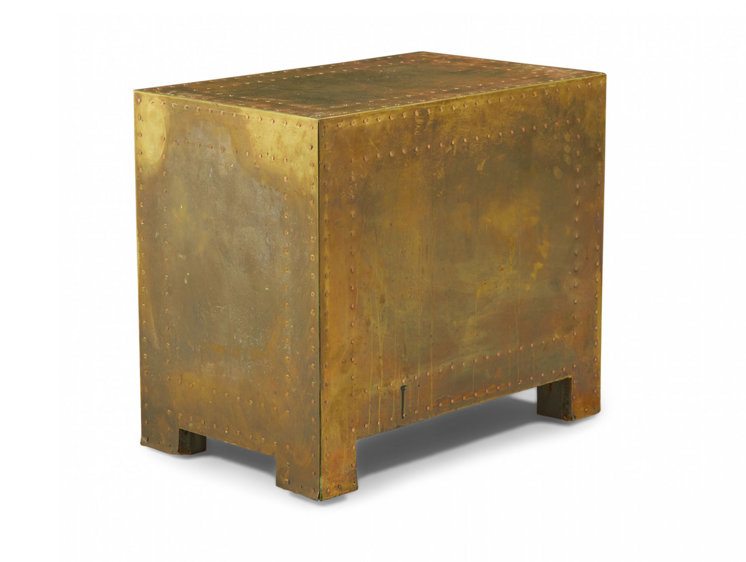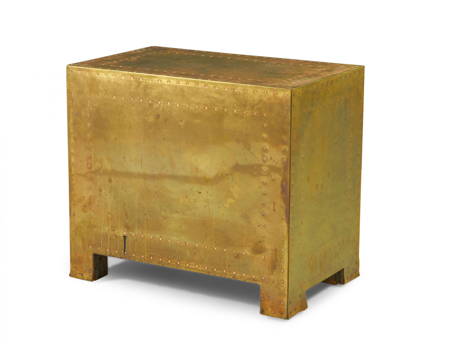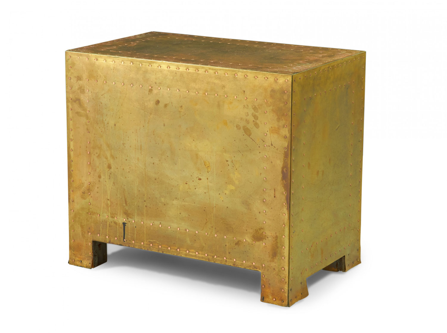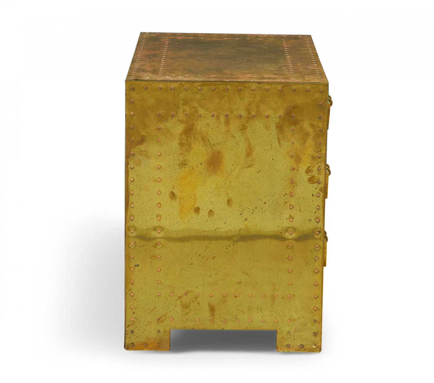 Spanish High Style 'Strongbox' bedside table / commode with brass-clad exterior with natural patina, copper studs, and three drawers with rectangular brass pulls. (SARREID, LTD.)(Similar pieces available with different patinas: DUF0025A-D, similar occasional tables: DUF0026A-F)