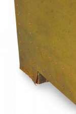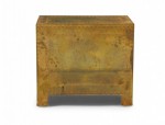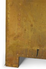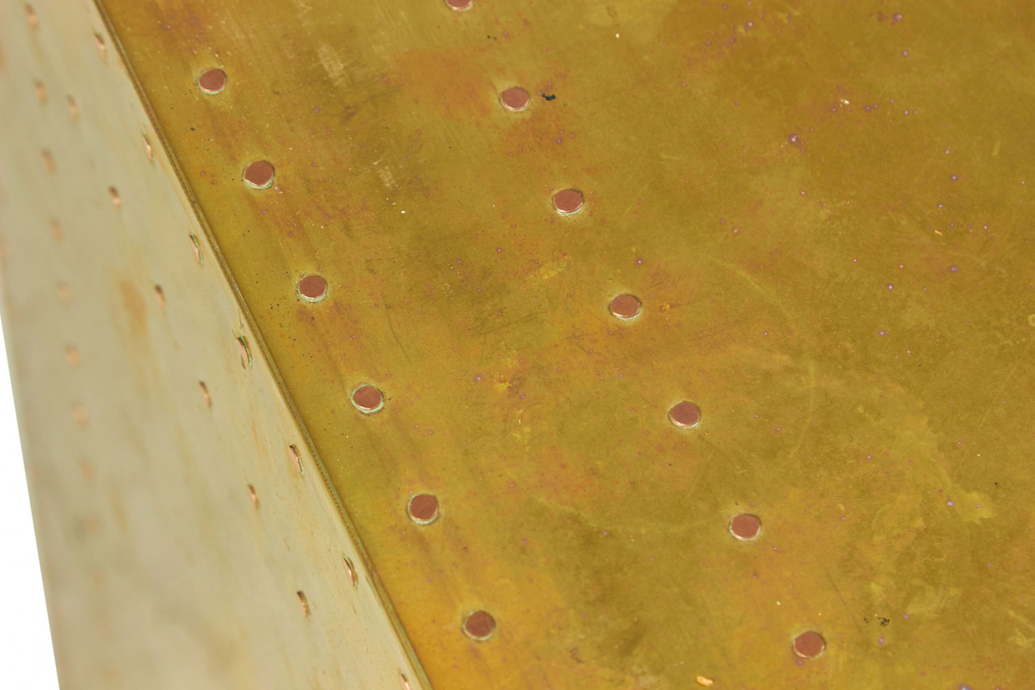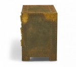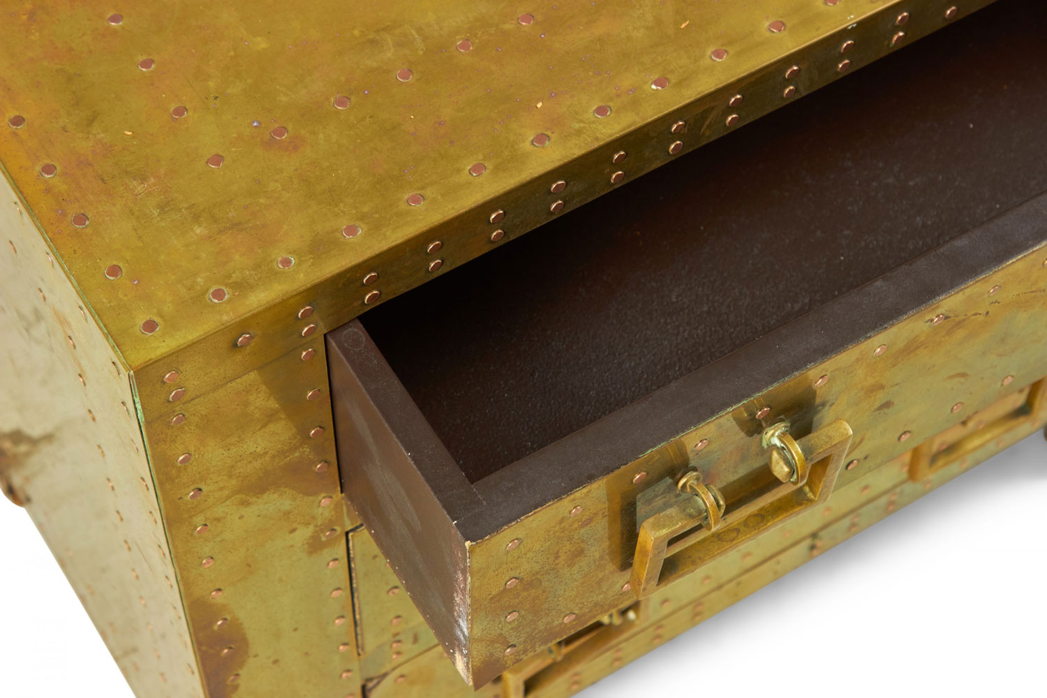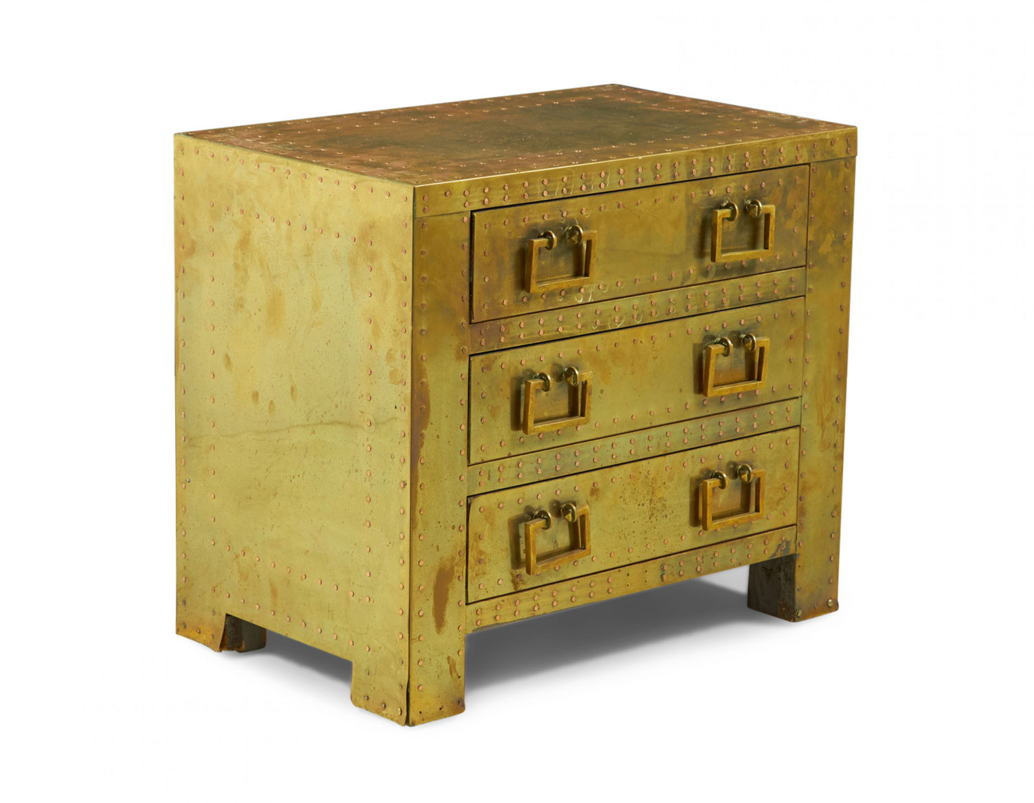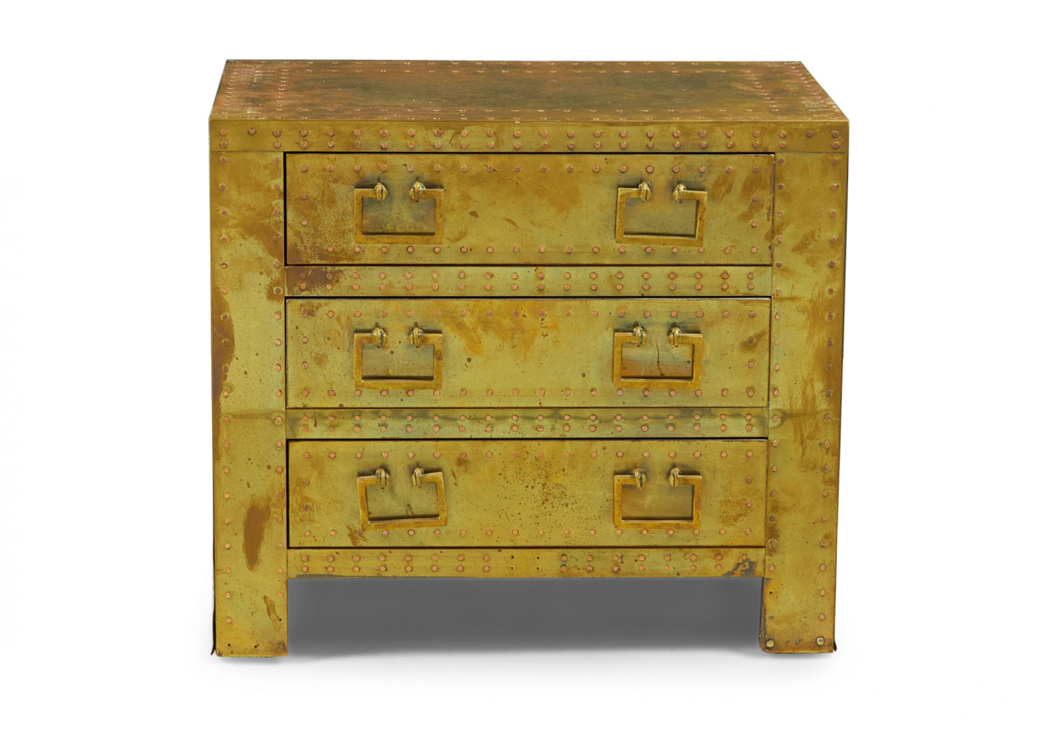 Spanish High Style 'Strongbox' bedside table / commode with brass-clad exterior with natural patina, copper studs, and three drawers with rectangular brass pulls. (SARREID, LTD.)(Similar pieces available with different patinas: DUF0025A-D, similar occasional tables: DUF0026A-F)