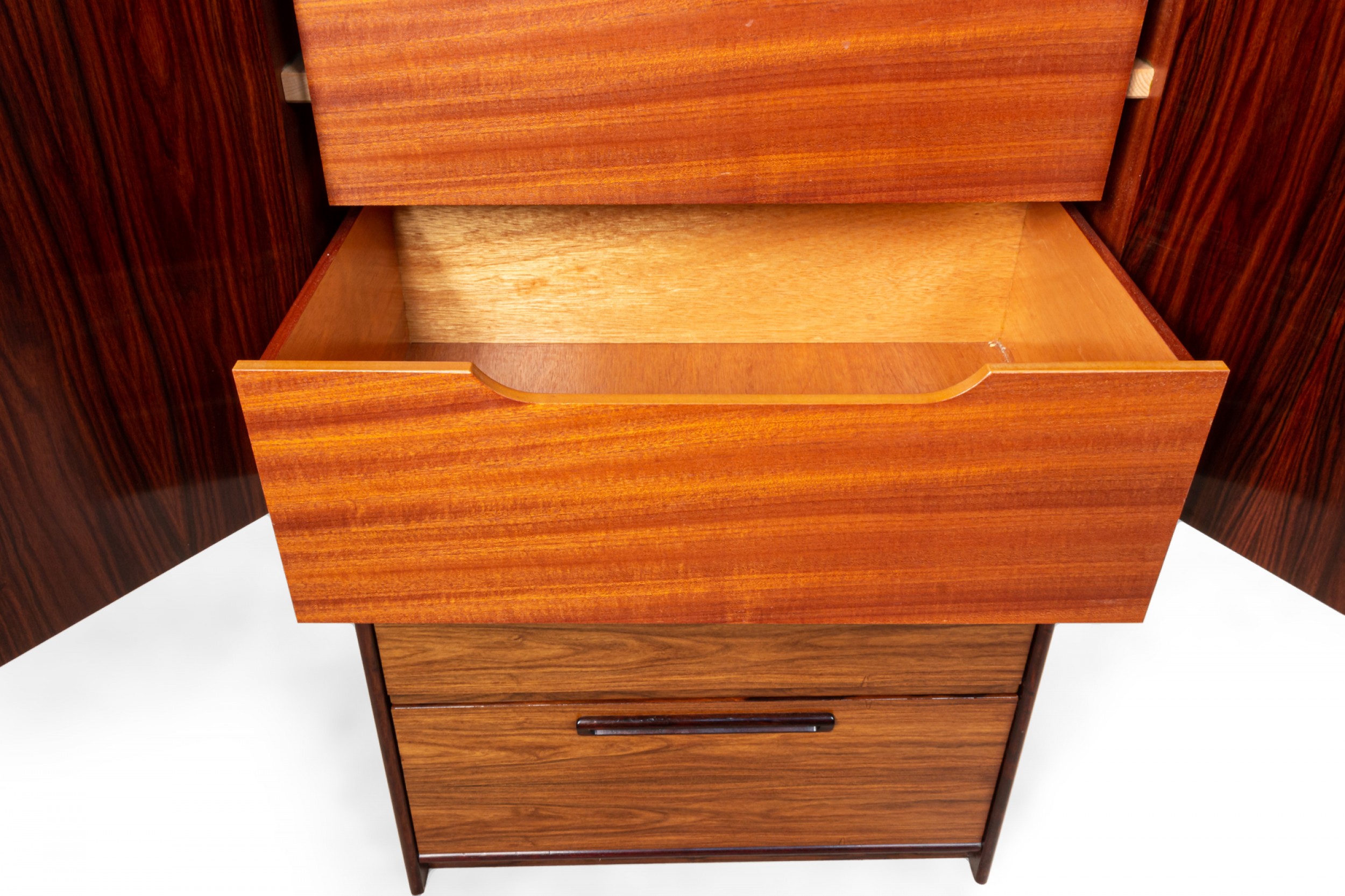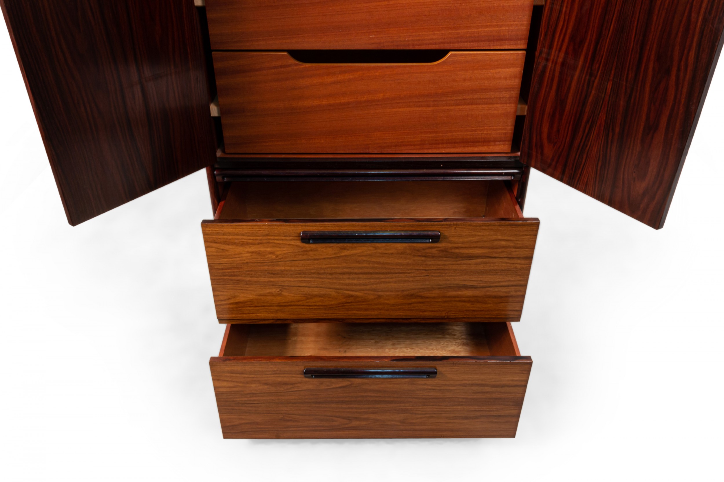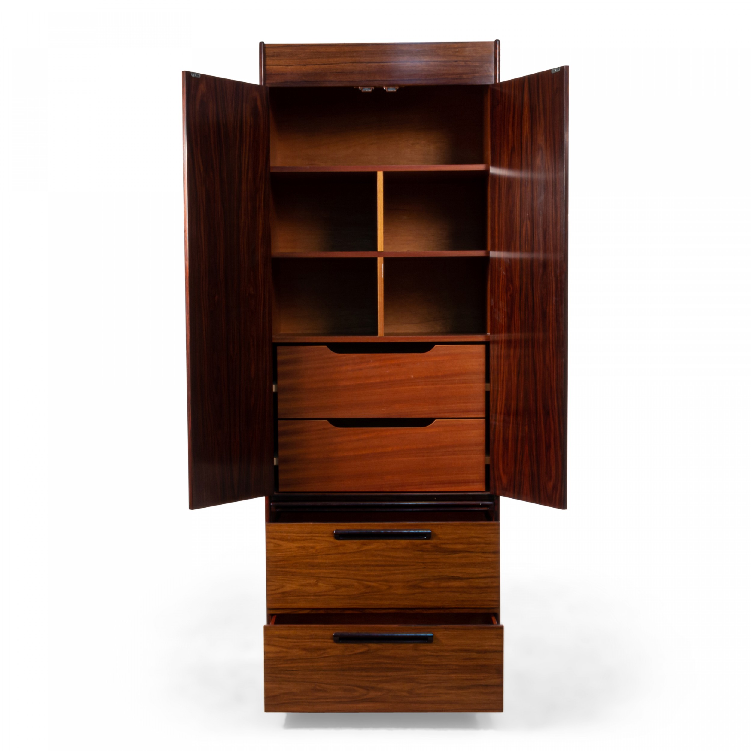 PAIR of Scandinavian Mid-Century rosewood veneer dresser /chifforobes with 2 cabinet compartments containing 2 drawers and 5 shelf sections, 2 bottom drawers, and pull out tablets (WESTNOFA)(PRICED AS PAIR)(Related item: NWL080).