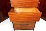 Style: Mid-Century Materials & Techniques: Rosewood, wood Category: Cabinets & Case Goods, Bedroom Condition: Both cabinets have holes and fading to sides. One with burn mark to edge. Small chip to one pull.