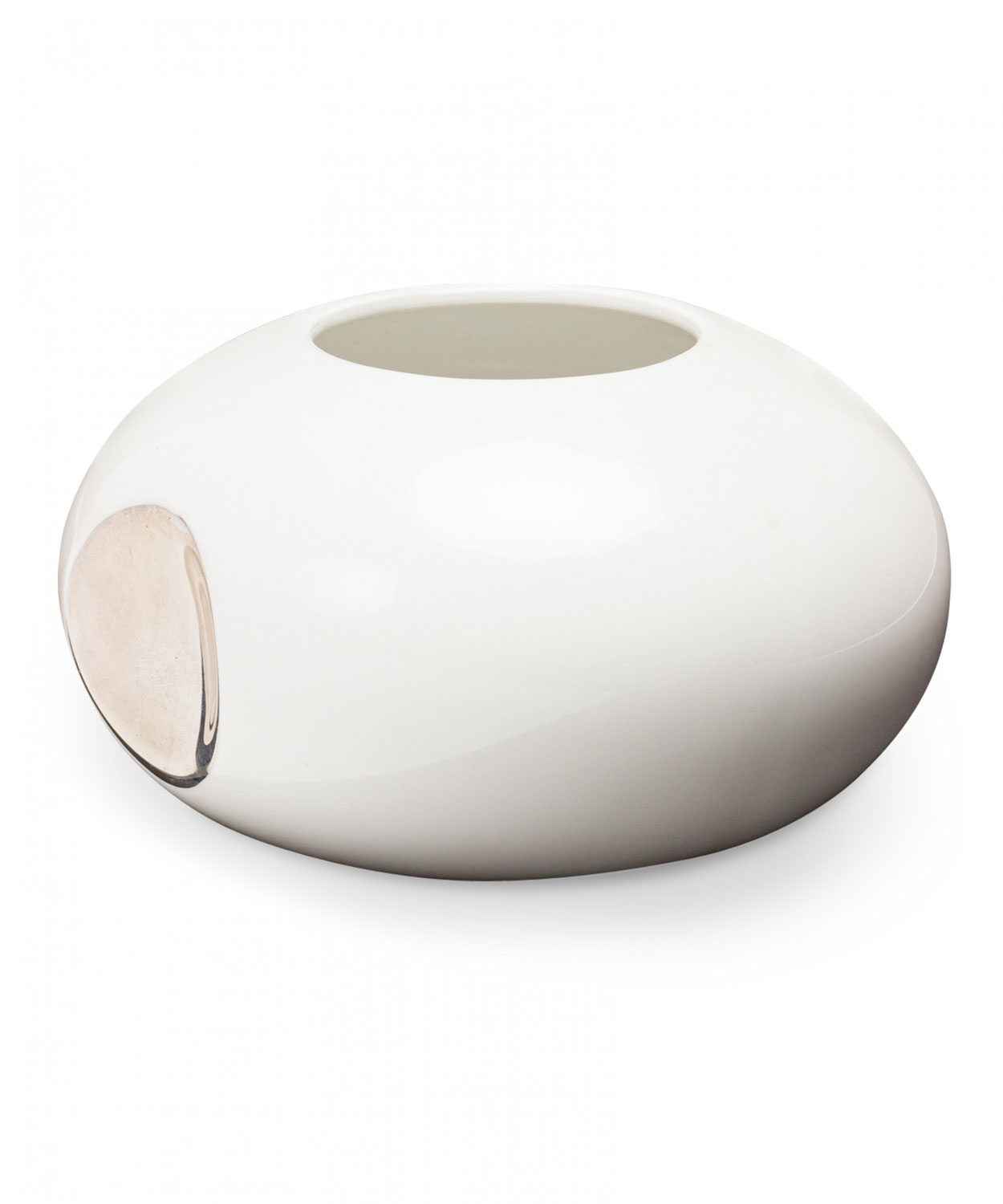 German white porcelain low circular vessel with two reflective silver circular divots on either side. (mark on bottom, Schönwald Germany 312)