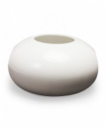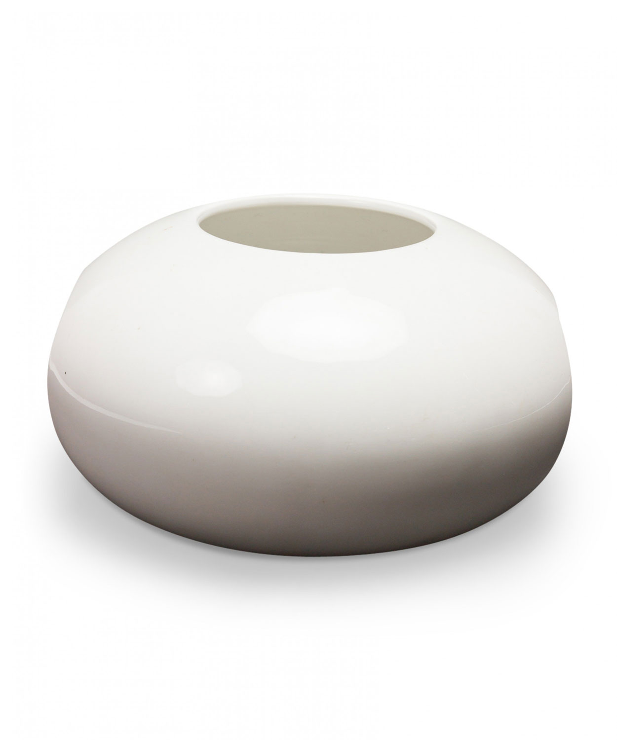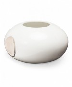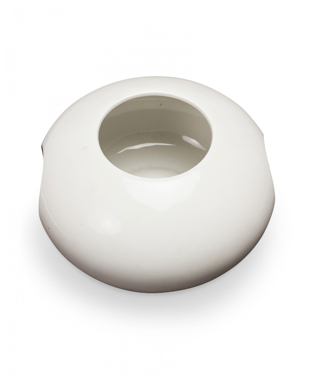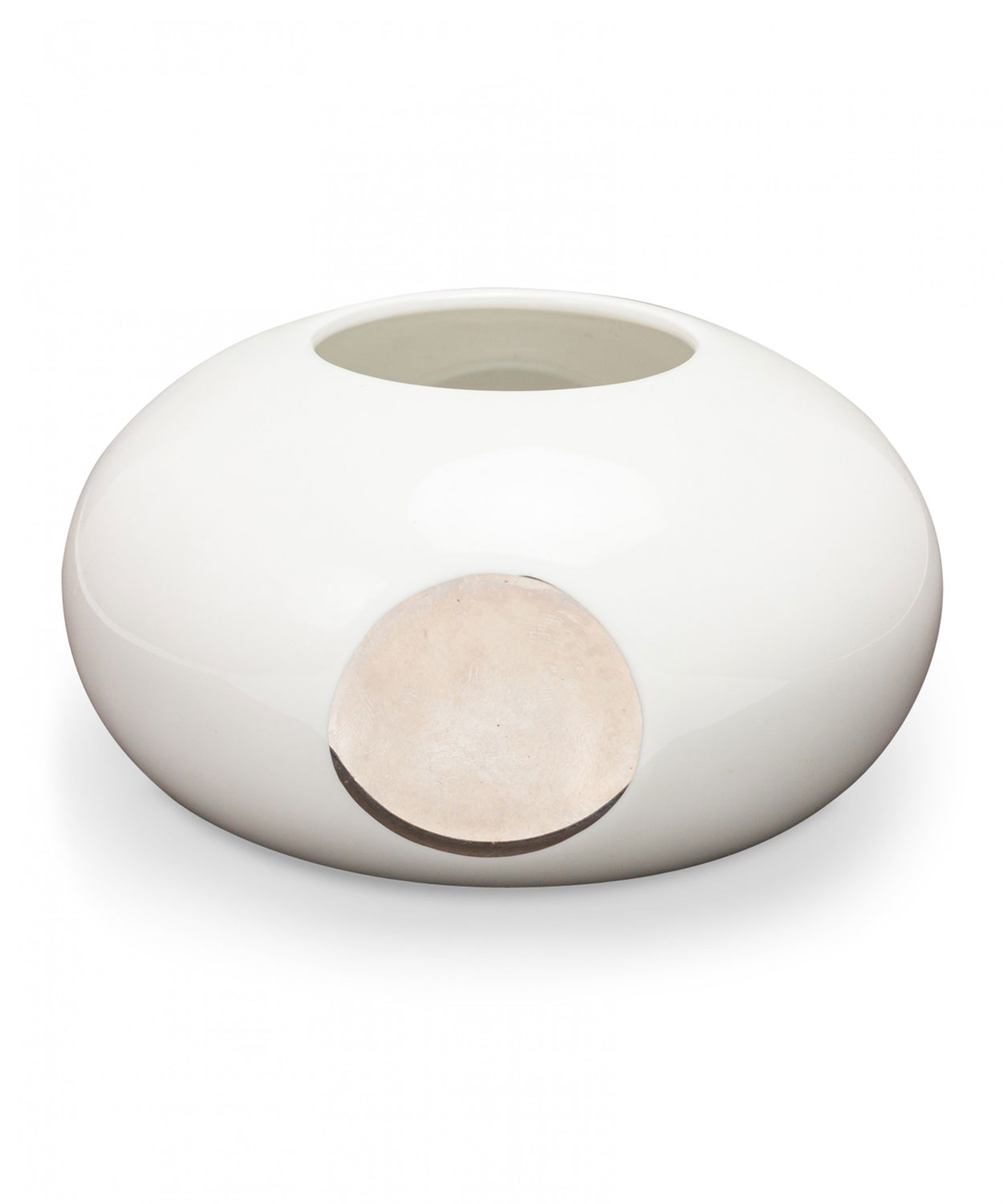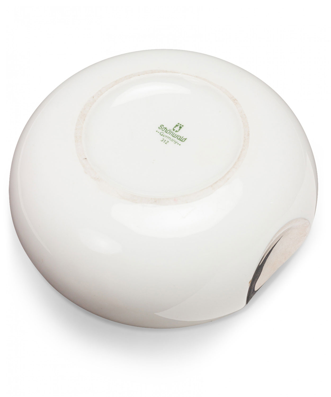 German white porcelain low circular vessel with two reflective silver circular divots on either side. (mark on bottom, Schönwald Germany 312).