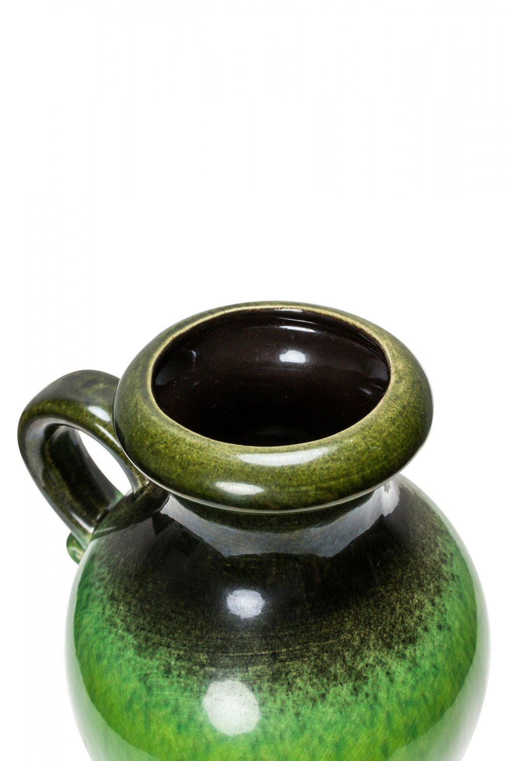 West German Mid-Century ceramic pitcher with a dark green glaze around the mouth, handle and base, and a lighter bright green glaze around the body. (mark on bottom, SCHAURICH-KERAMIK W. GERMANY 430-25)
