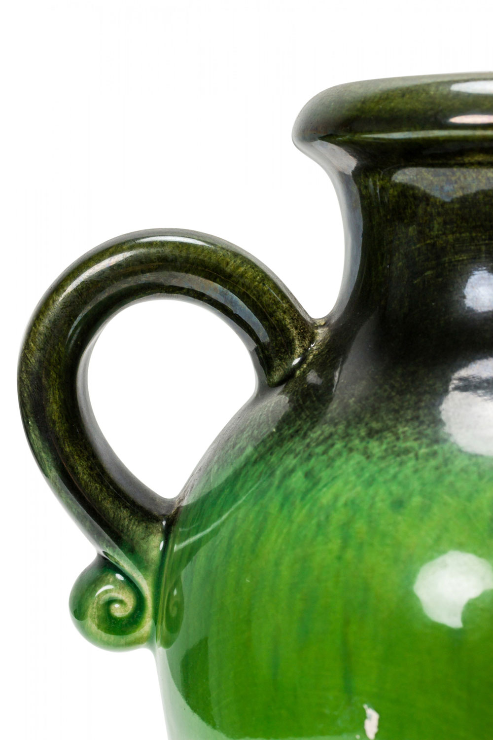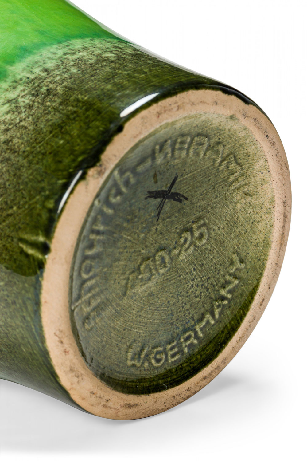 West German Mid-Century ceramic pitcher with a dark green glaze around the mouth, handle and base, and a lighter bright green glaze around the body. (mark on bottom, SCHAURICH-KERAMIK W. GERMANY 430-25).