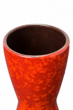 West German Mid-Century hourglass-form ceramic vase with a red and orange speckled glaze. (SCHEURICH, mark on bottom, W. GERMANY 244-17)